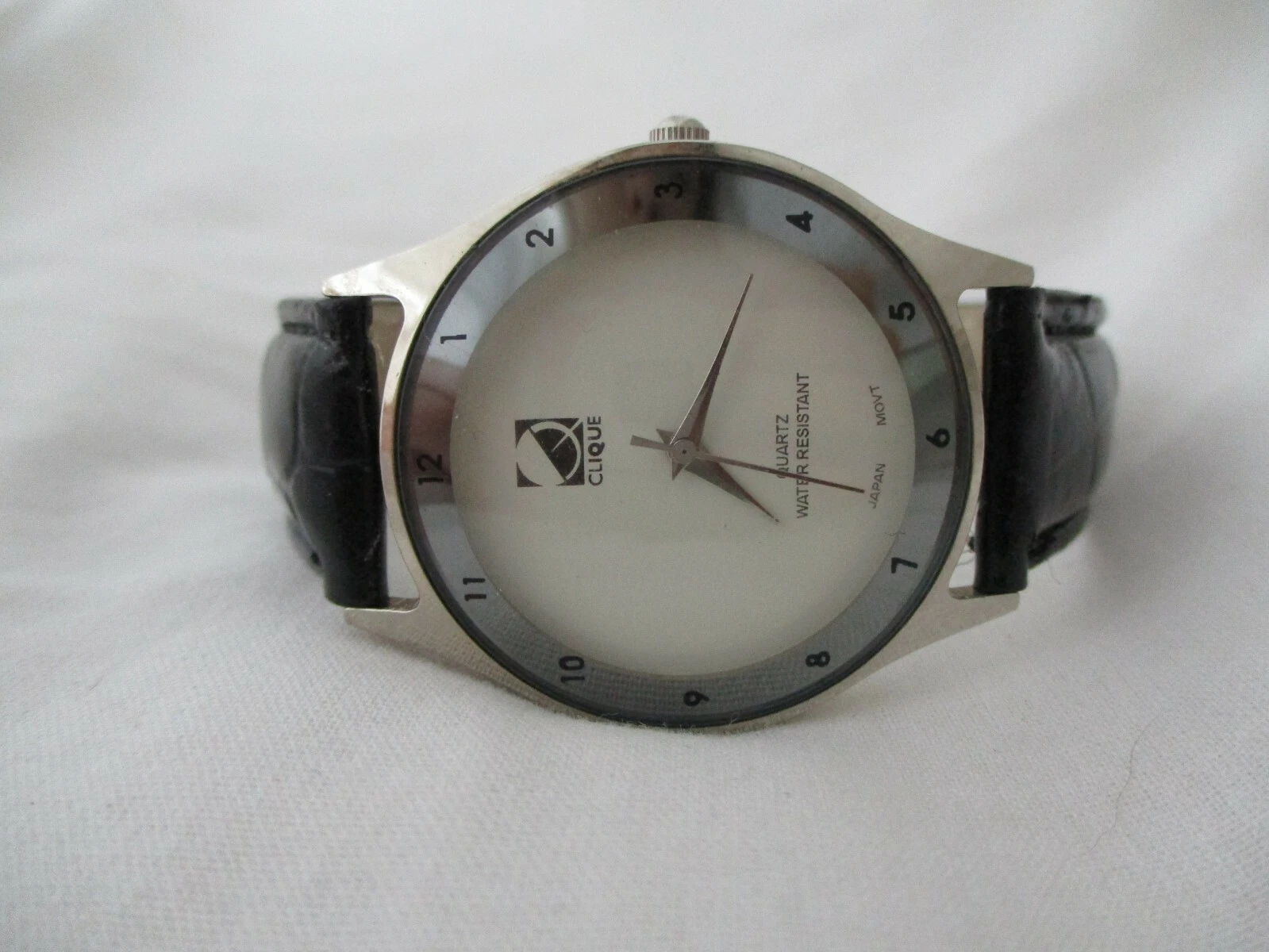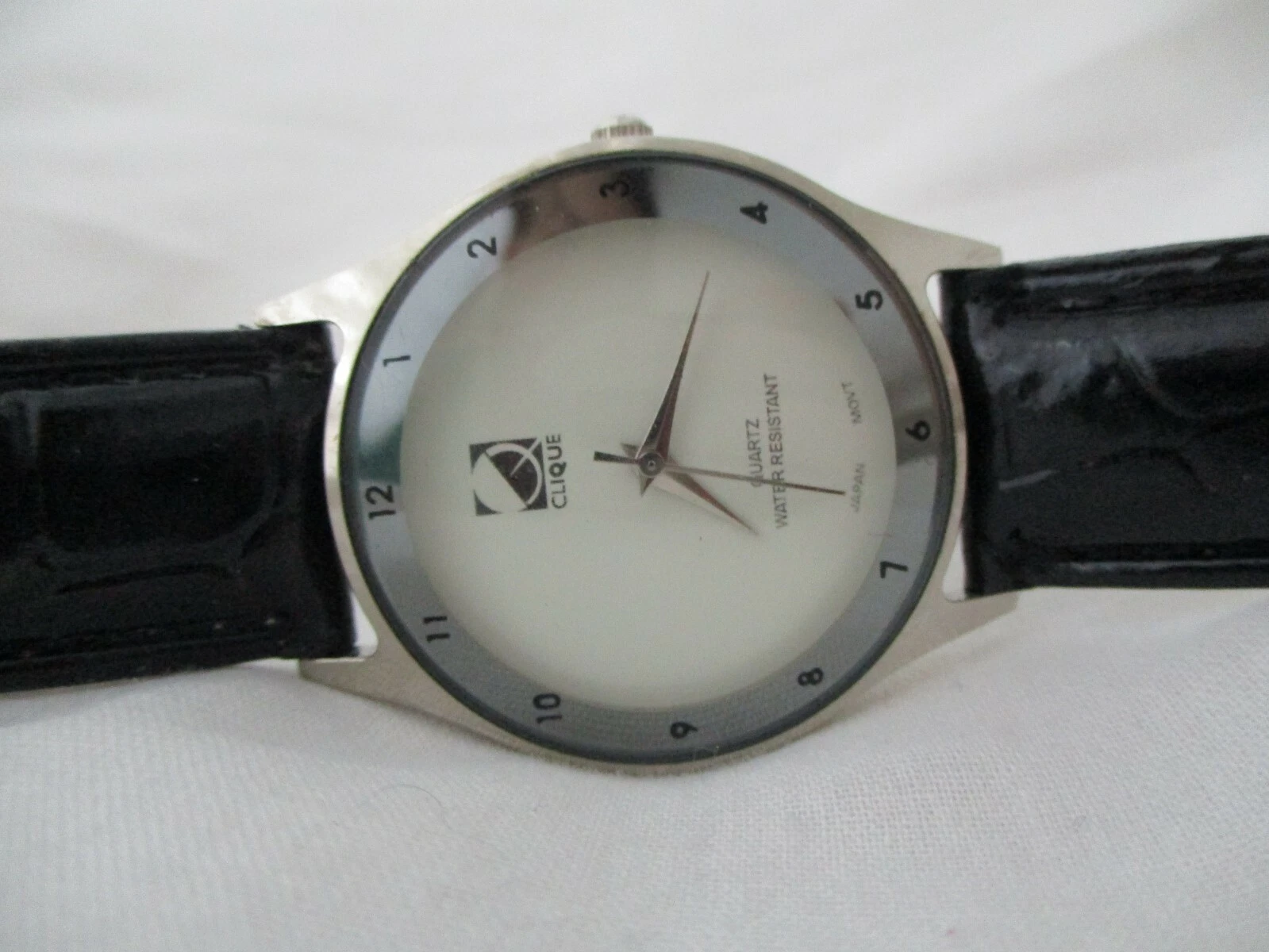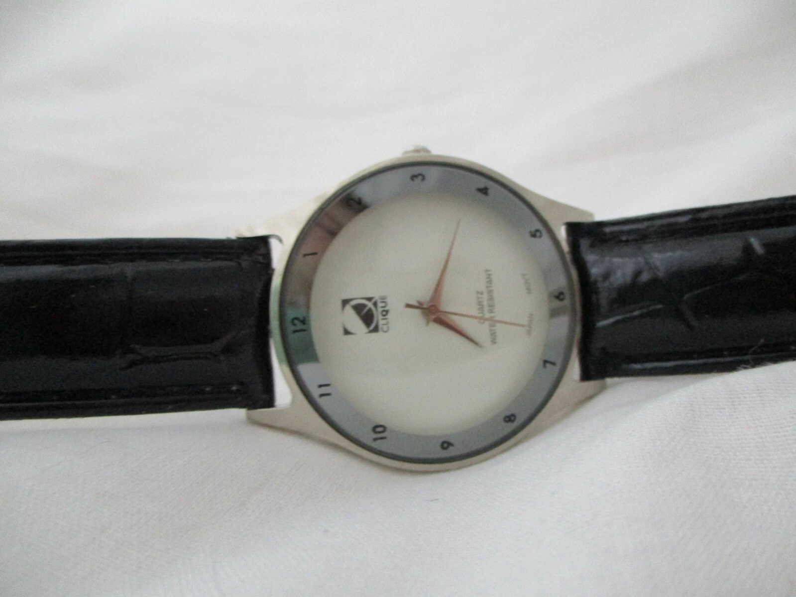 Clique Watch, Silvertone Case, White Dial, Black Patent Buckle Band, WORKING!
