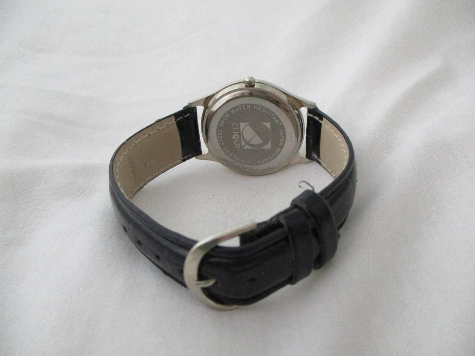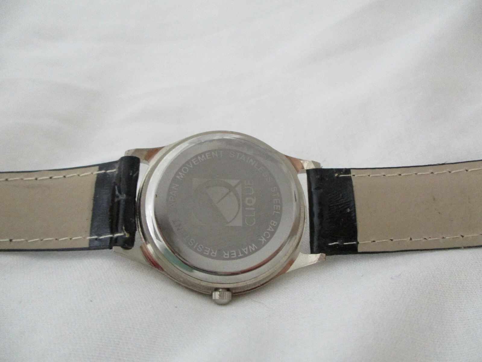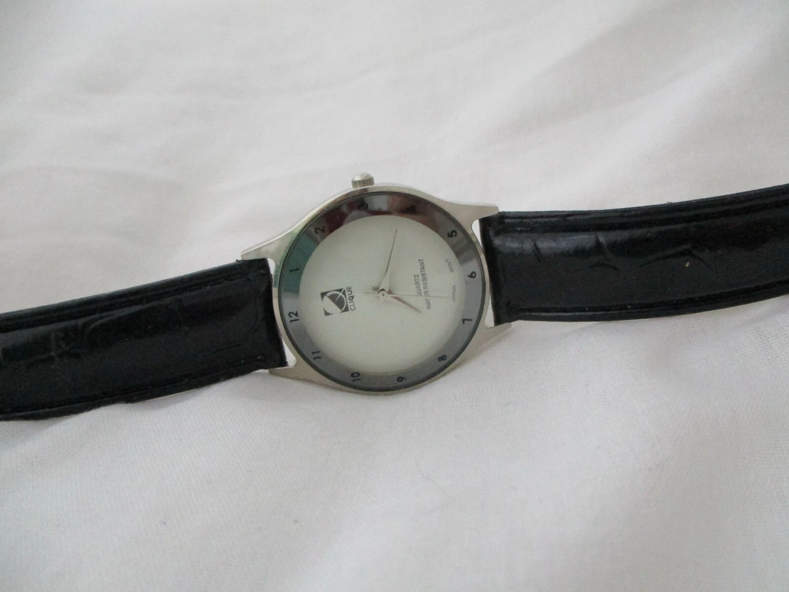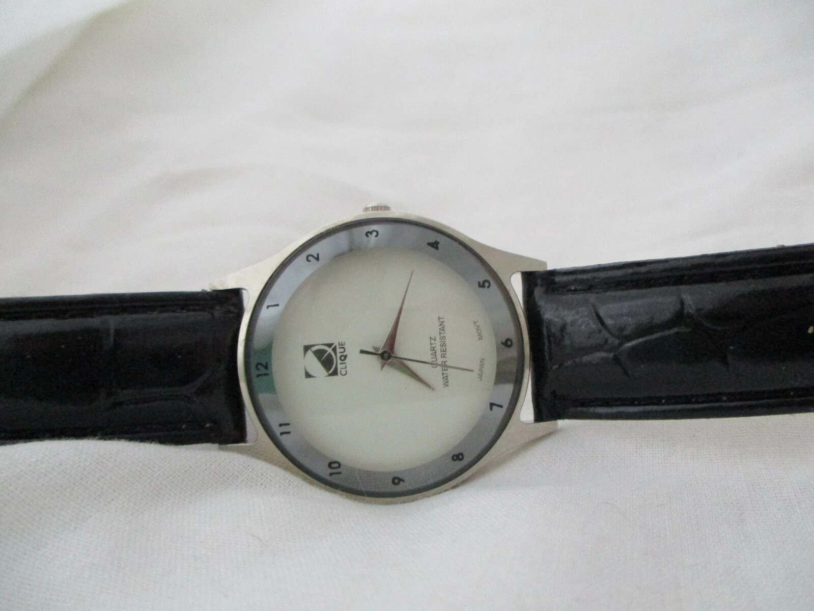 Clique Watch, Silvertone Case, White Dial, Black Patent Buckle Band, WORKING!