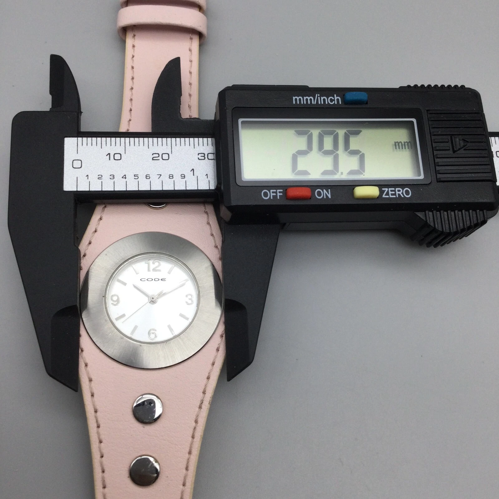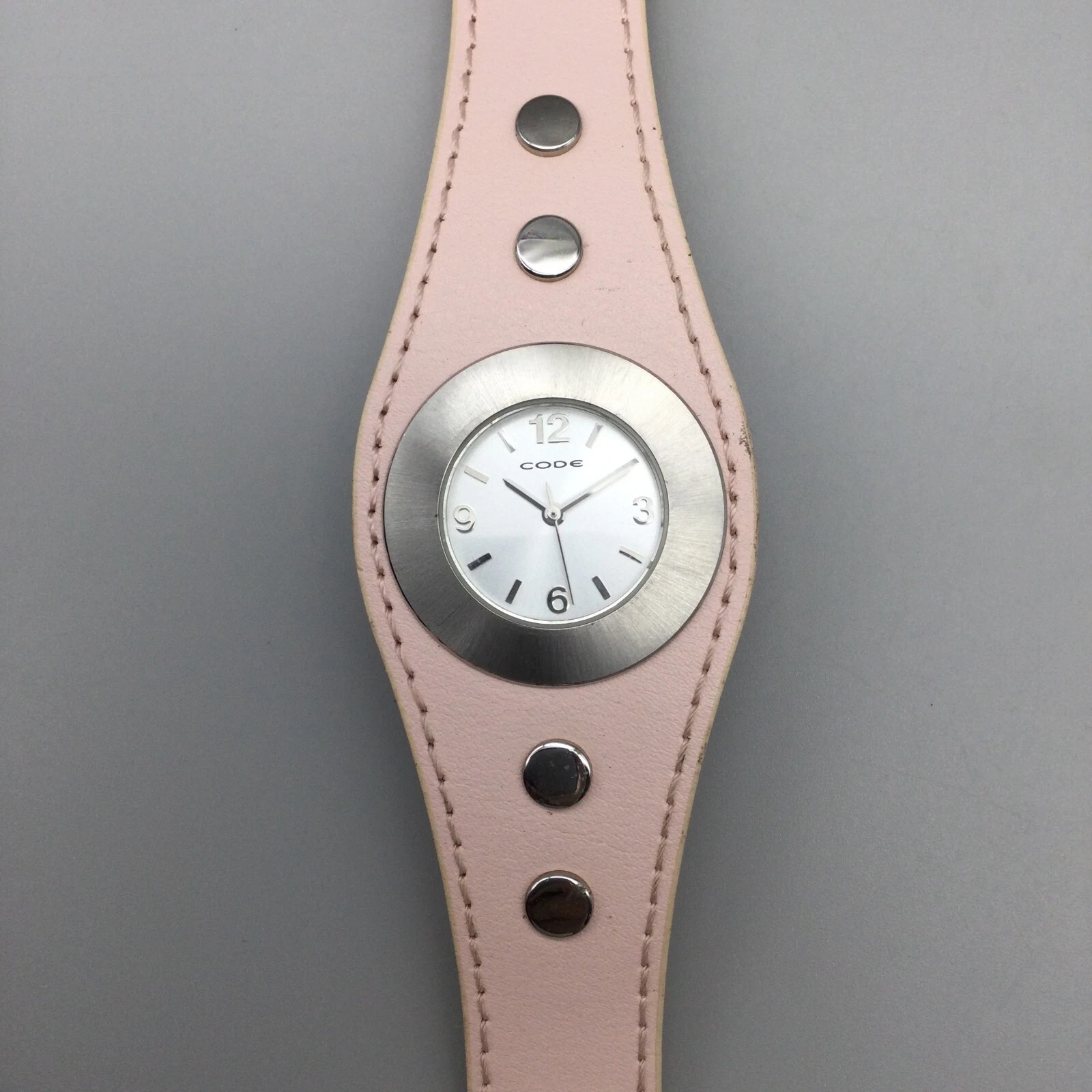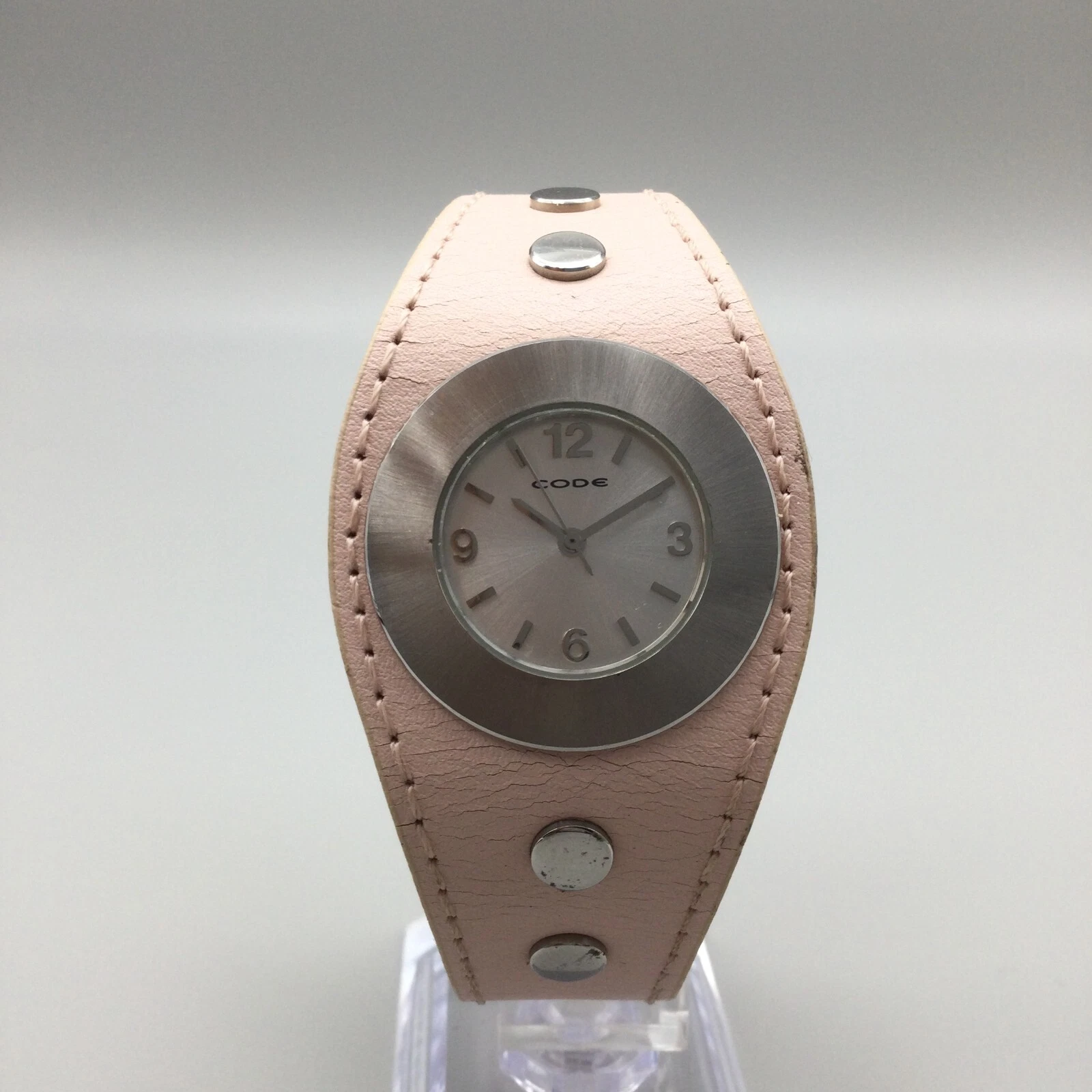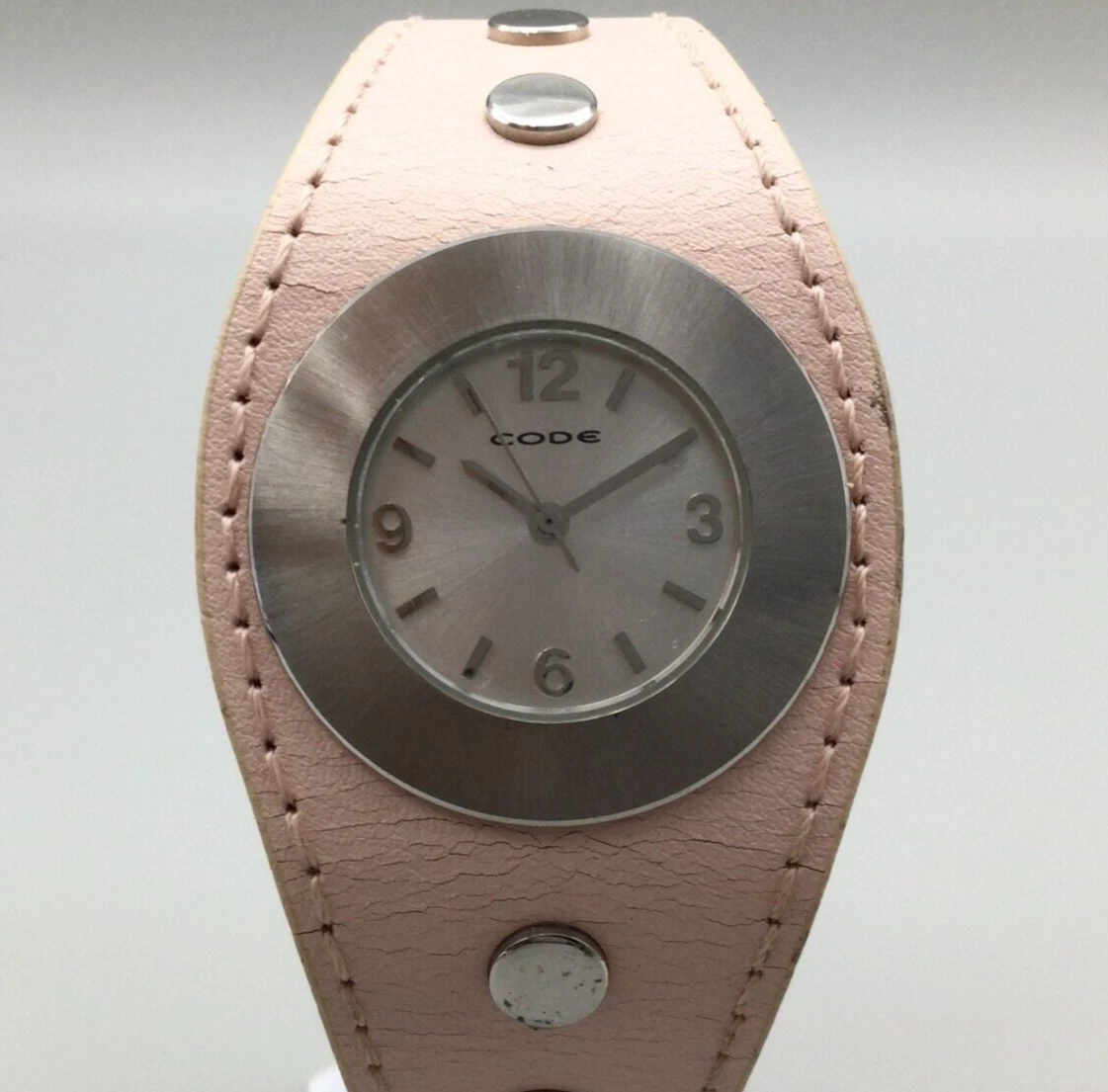 Code Watch Women Silver Tone 30M Pink Wide Leather Cuff Band New Battery