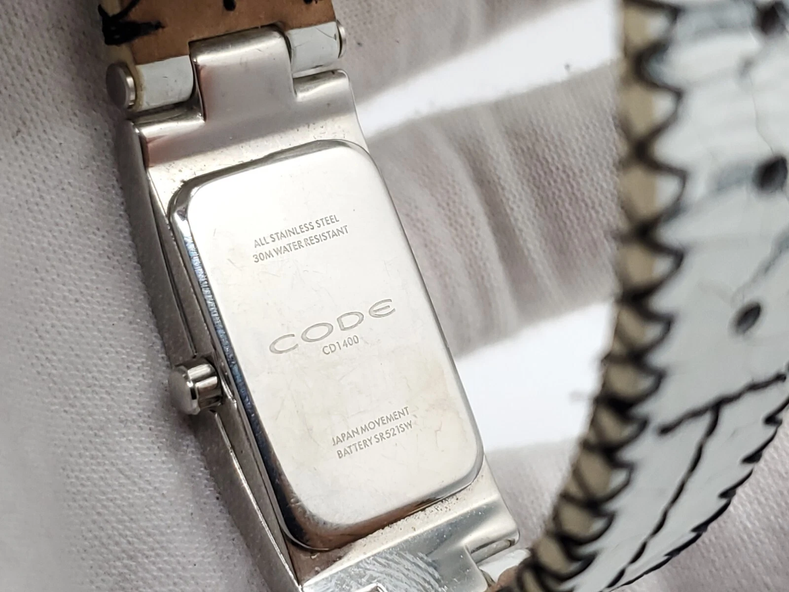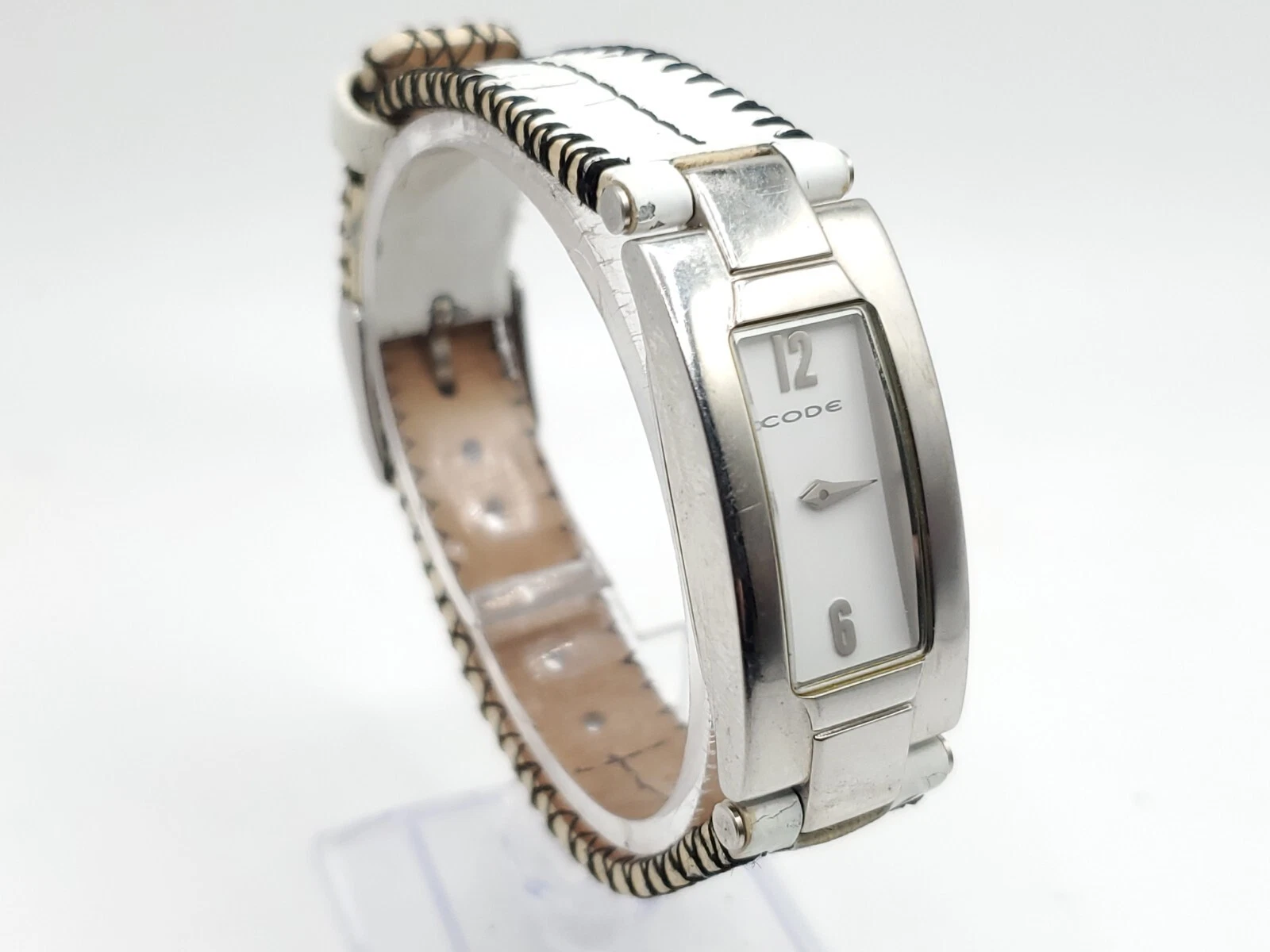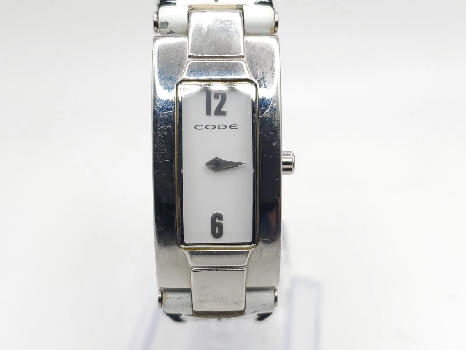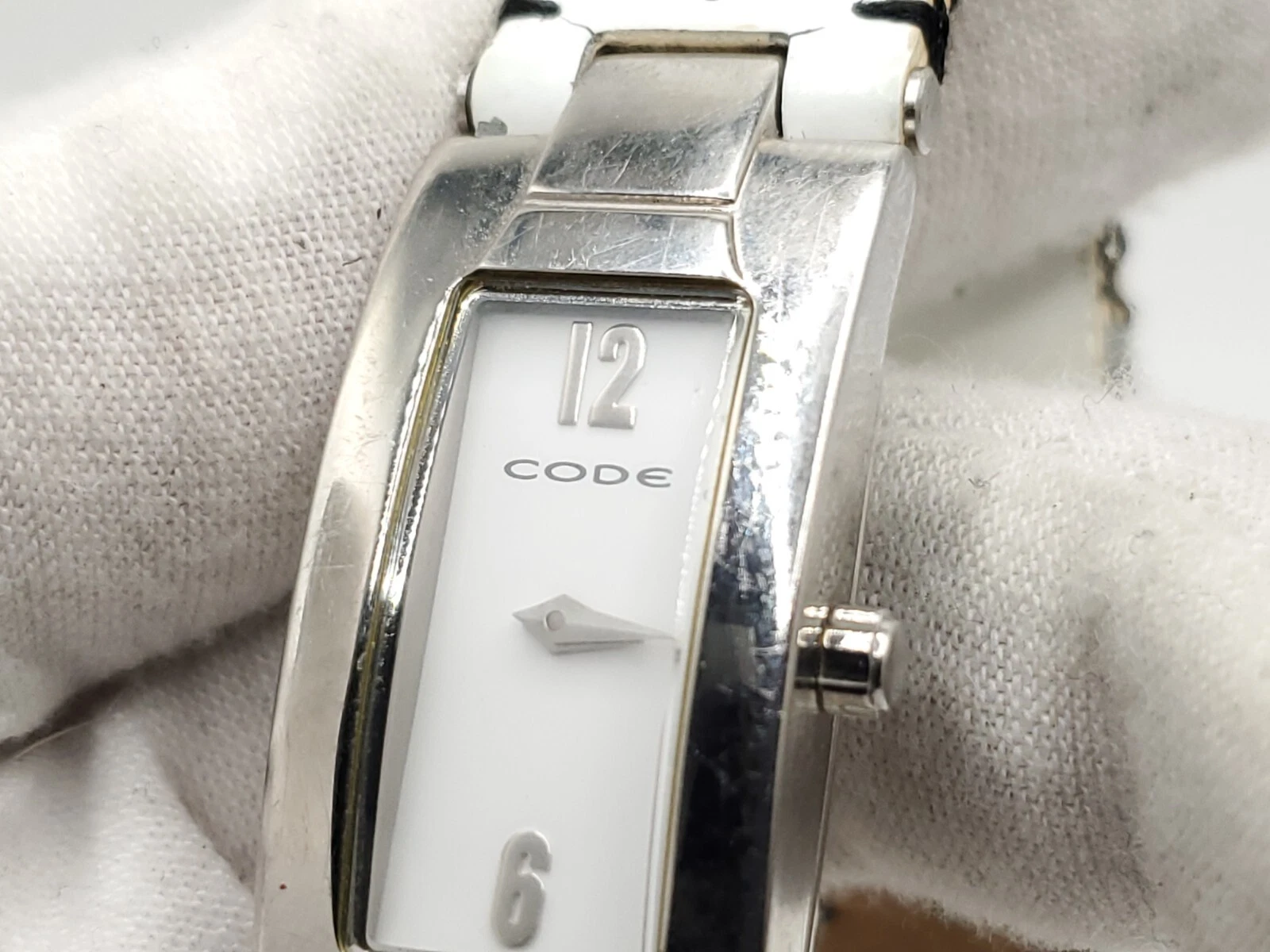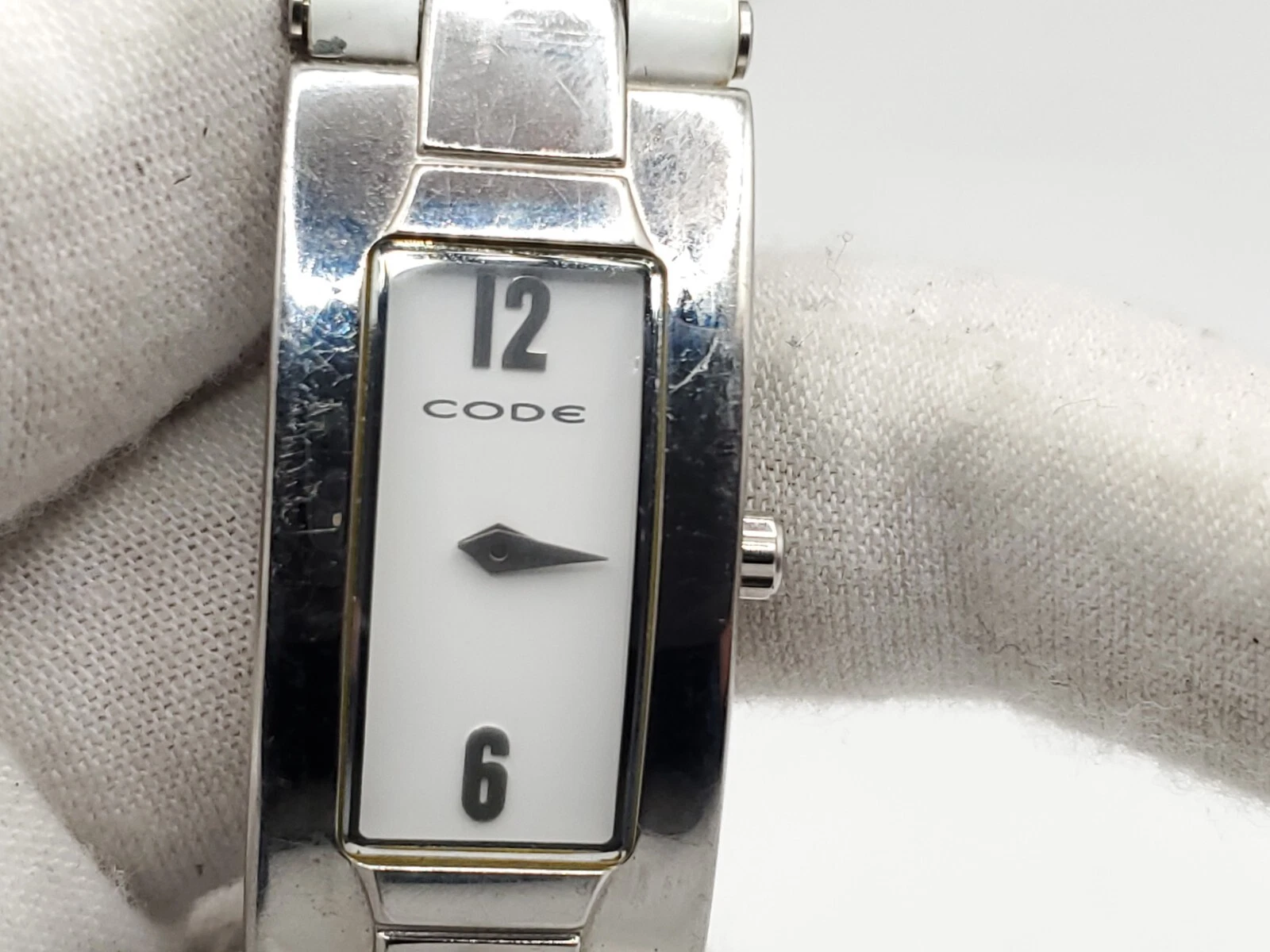 Code Quartz Womens Watch New Battery Siver Tone White Dial Rectangle 17mm