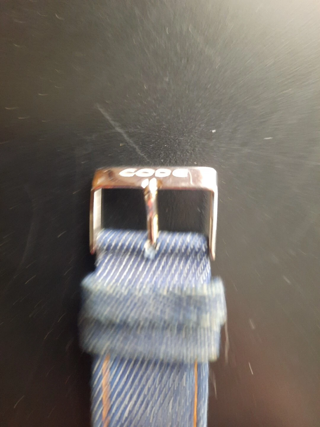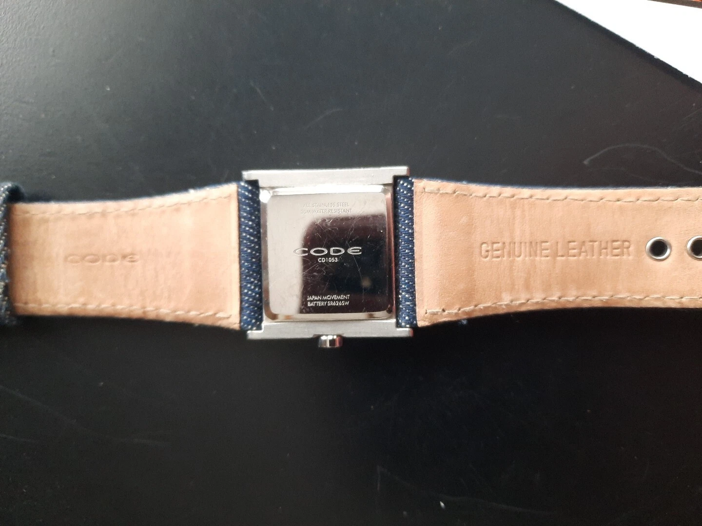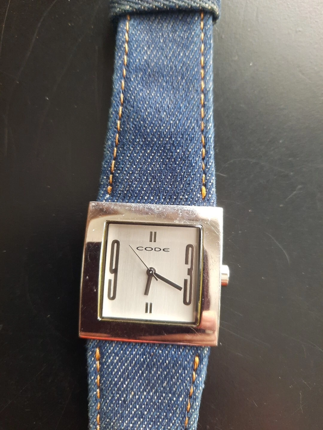 CODE Woman's Quartz Watch All Stainless Blue Denim & Leather Band, new battery