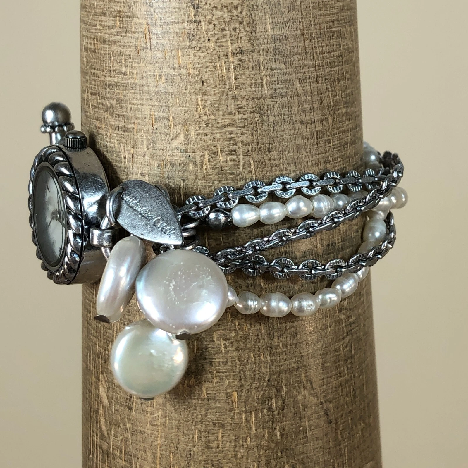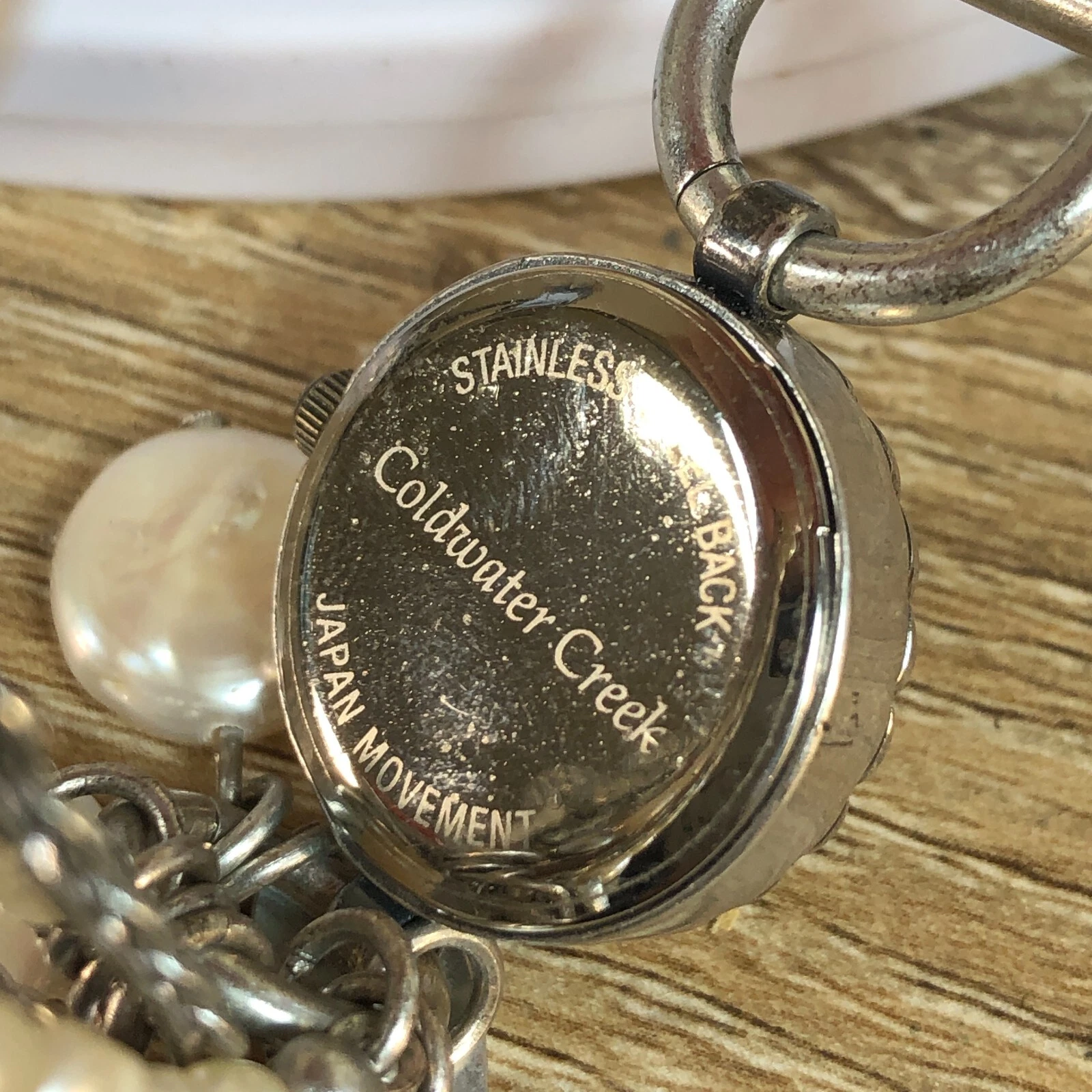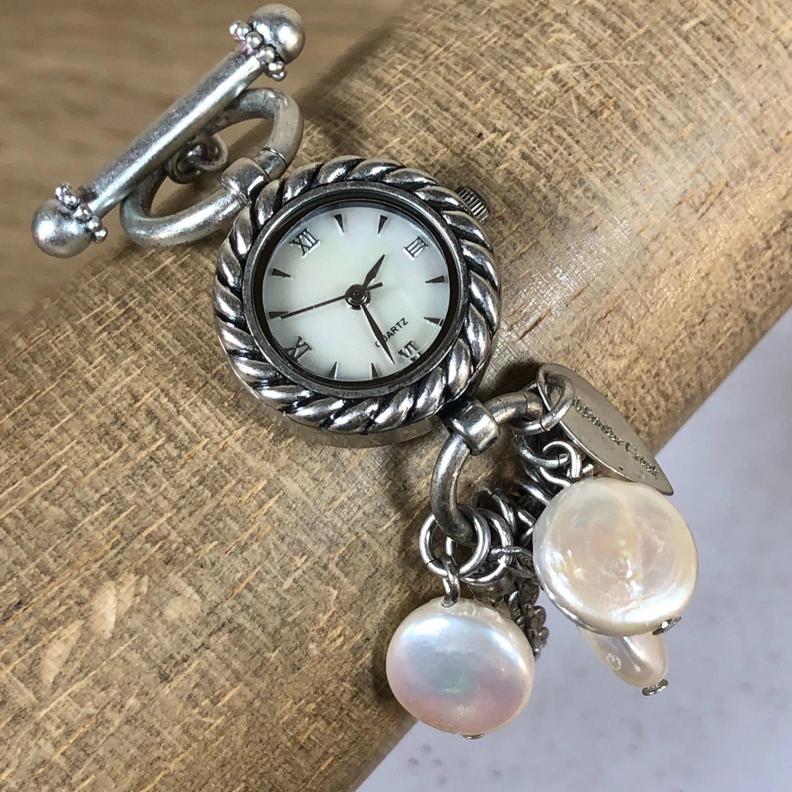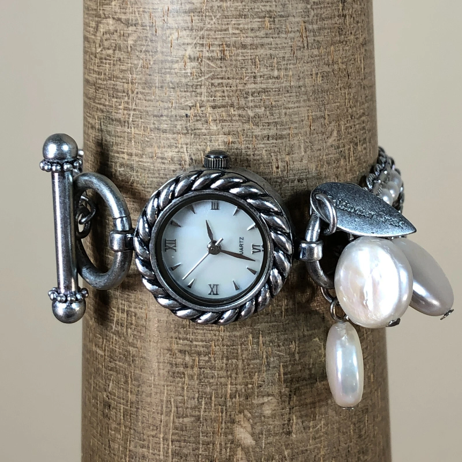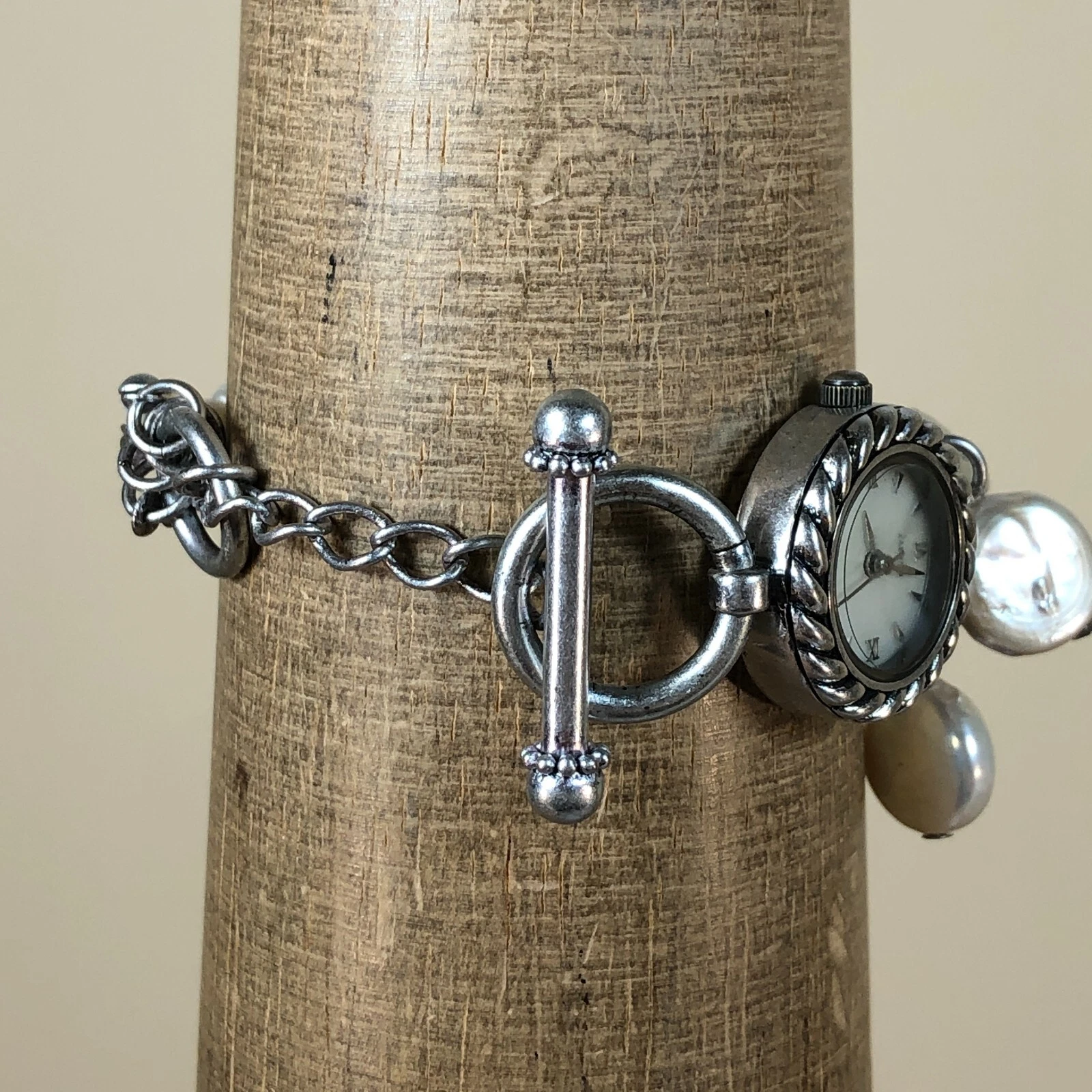 Coldwater Creek Women Mother of Pearl Faux Pearl Chain Toggle Band Watch 6 1/4"