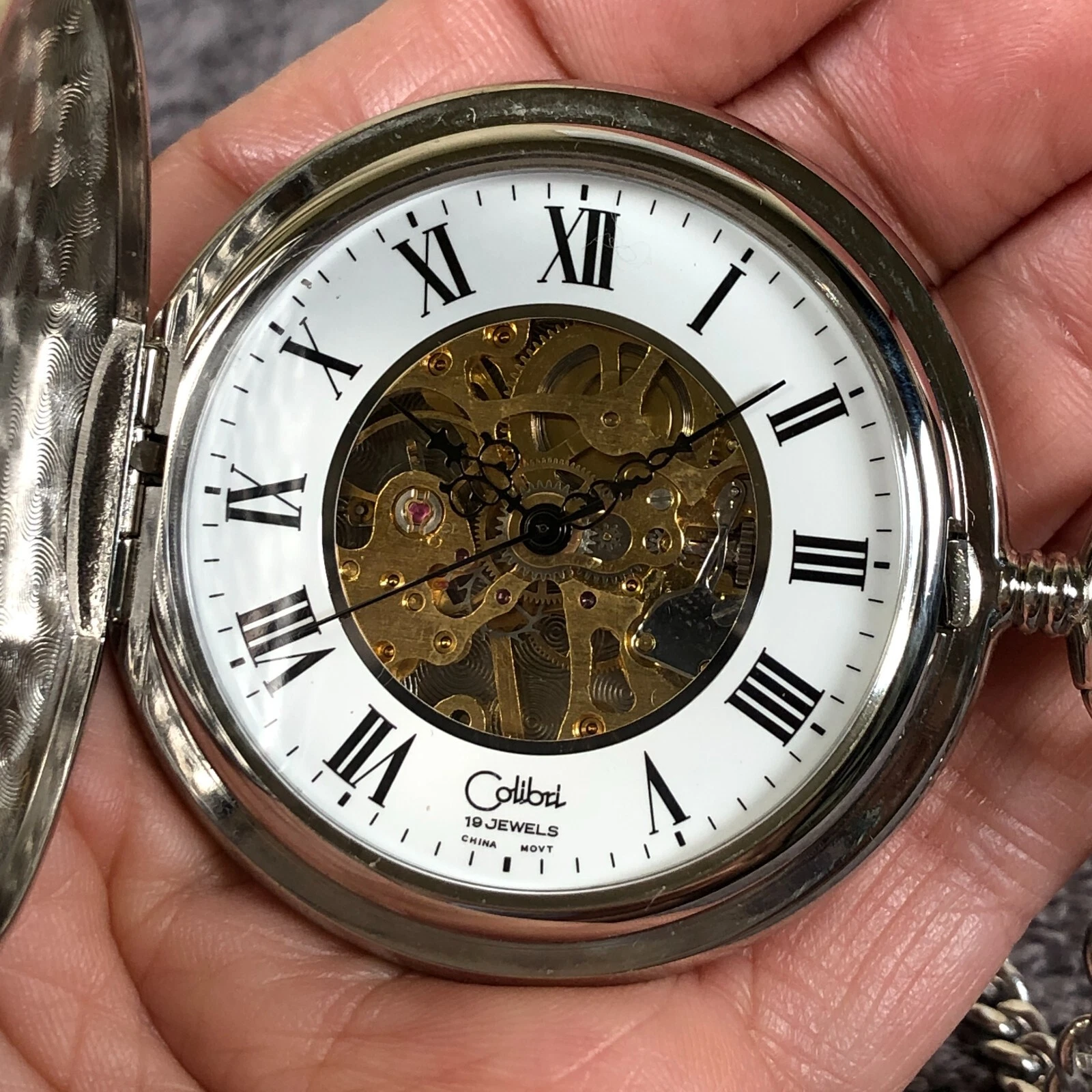 Colibri Casual 19 Jewels Silver Tone Skeleton Mechanical Wind Pocket Watch