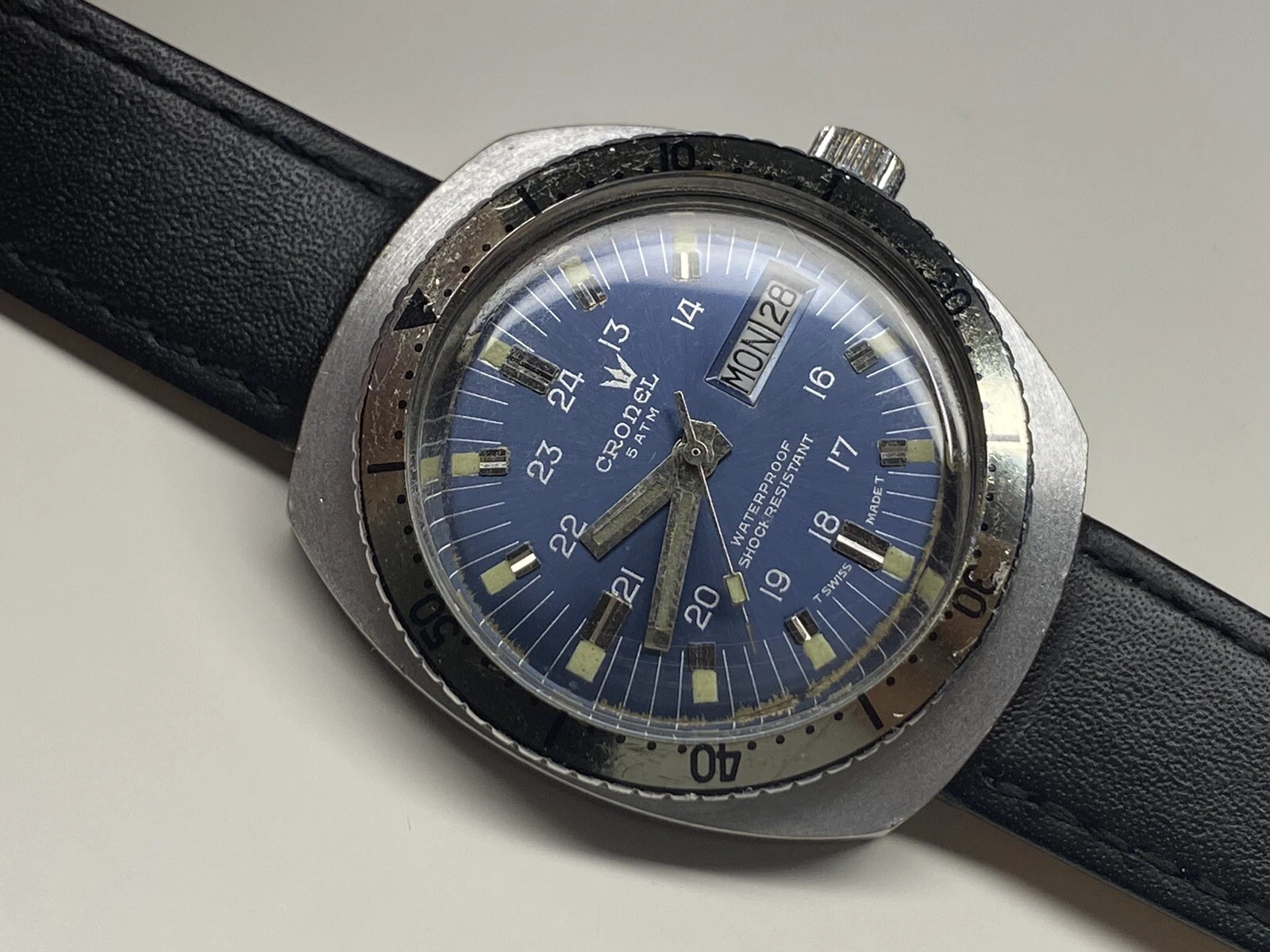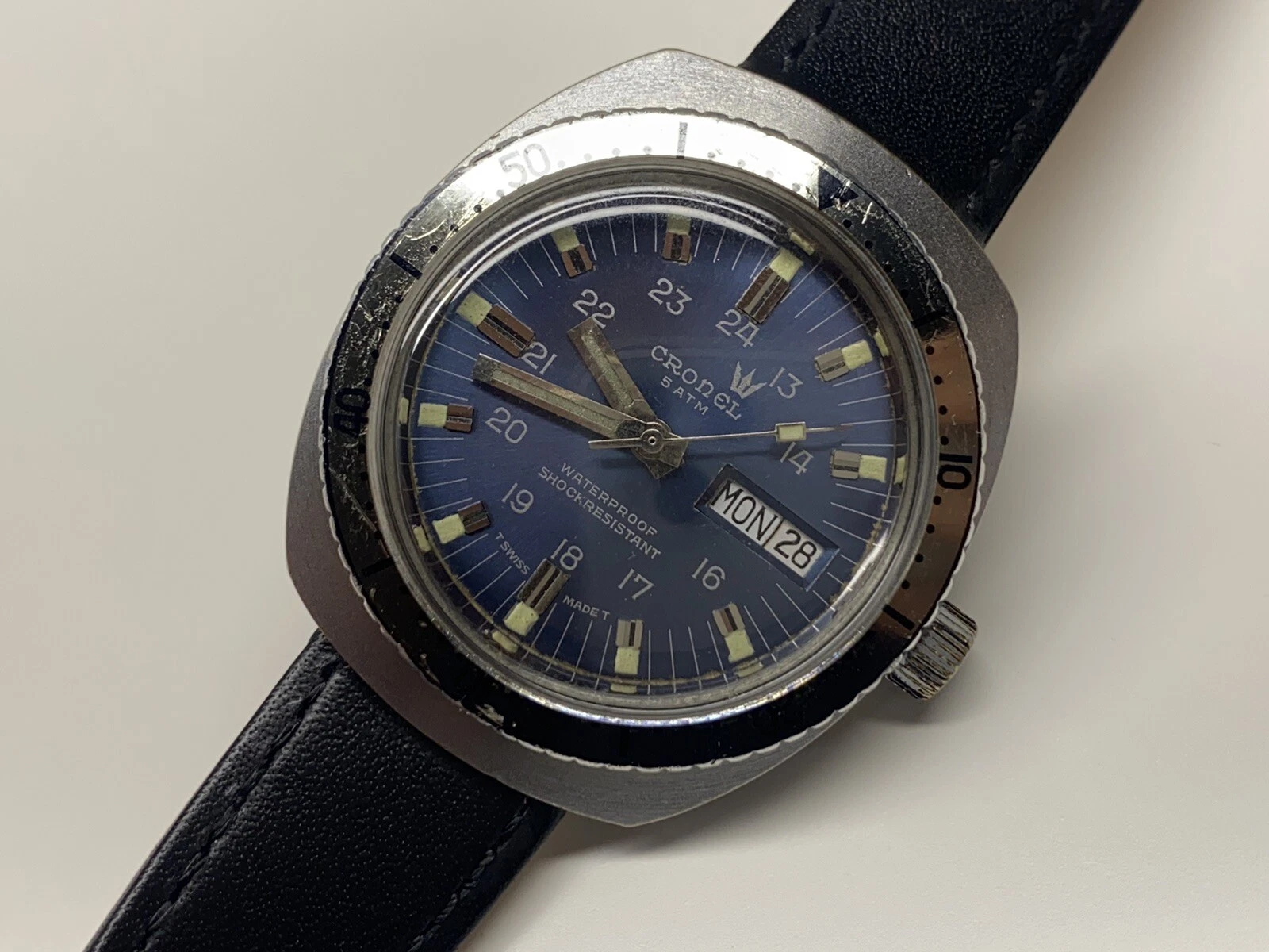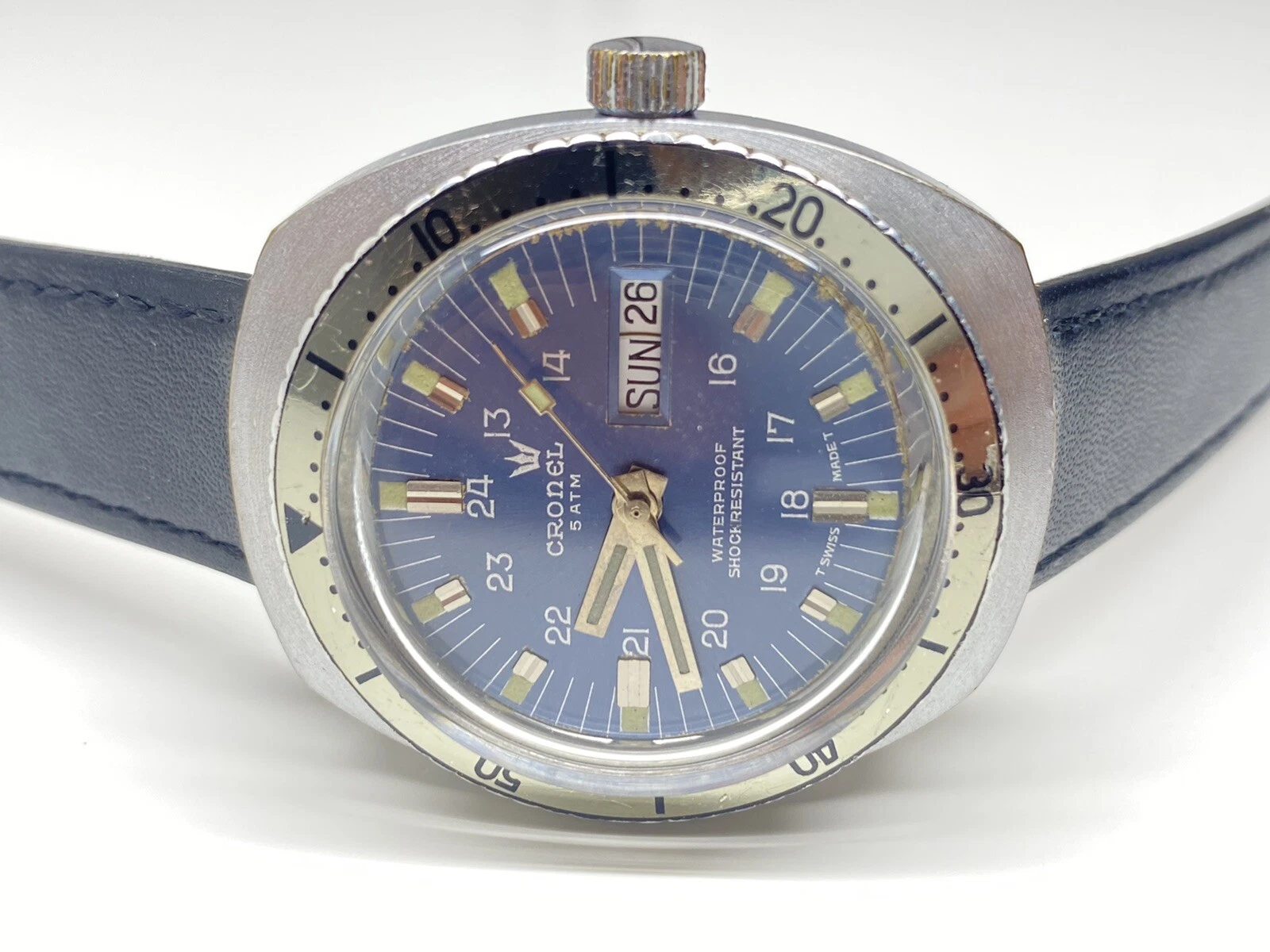 vintage cronel 5 atm day/date waterproof shock resistant swiss diver wristwatch