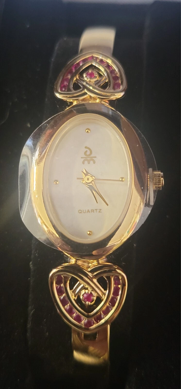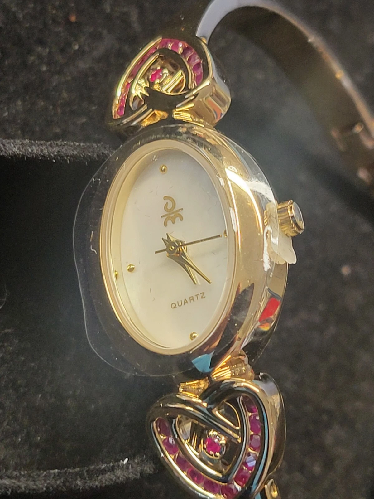 DANBURY MINT LADIES WATCH MOTHER OF PEARL HEART RUBY GOLD TONE 6.25”