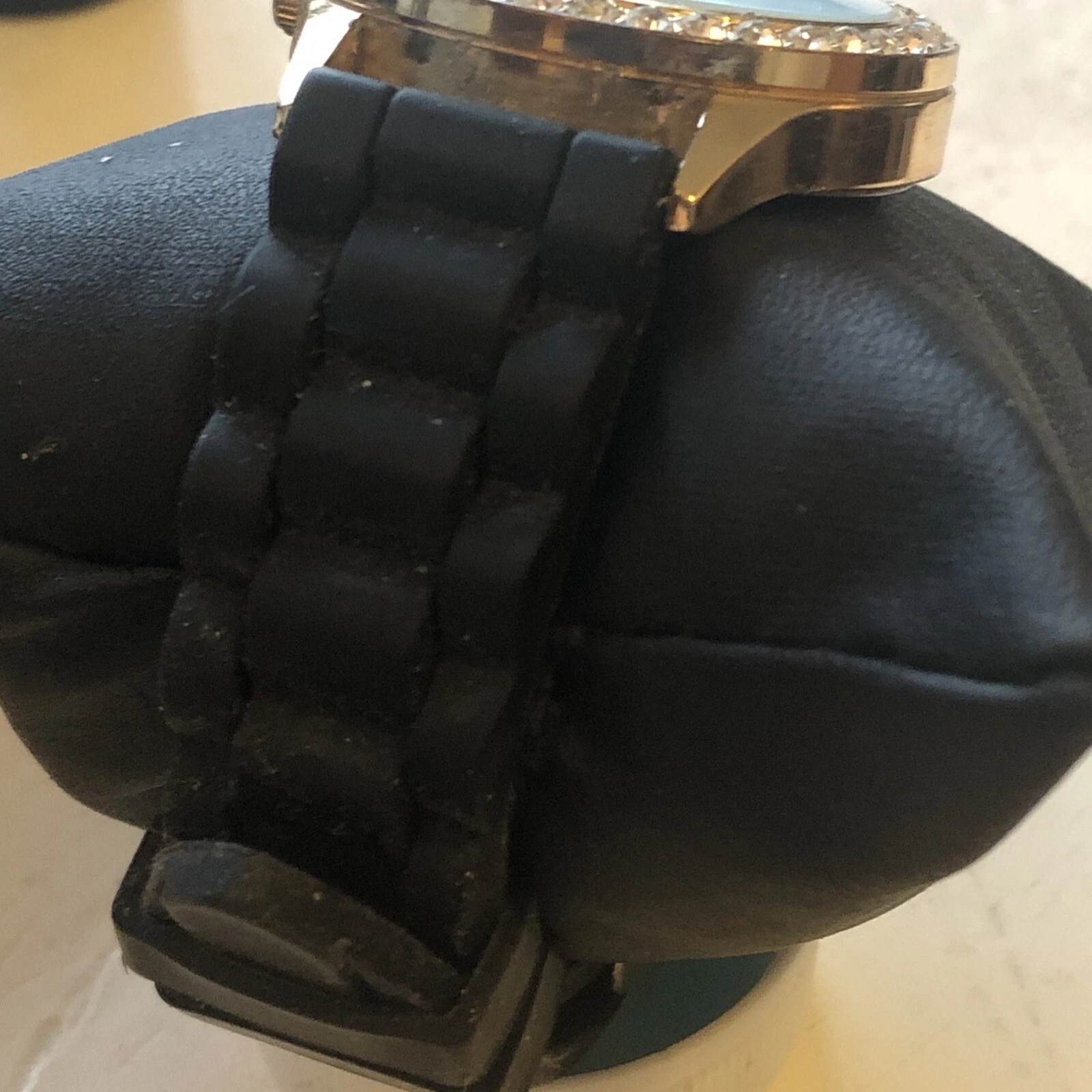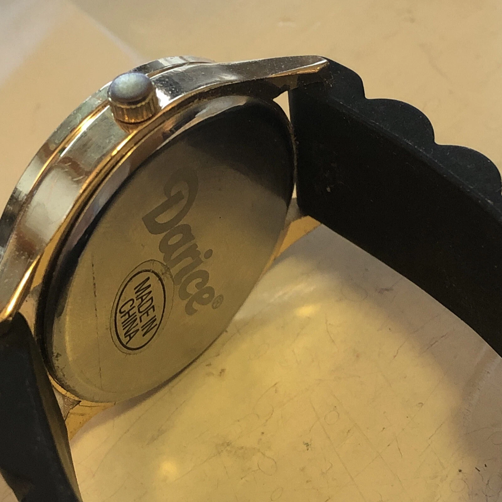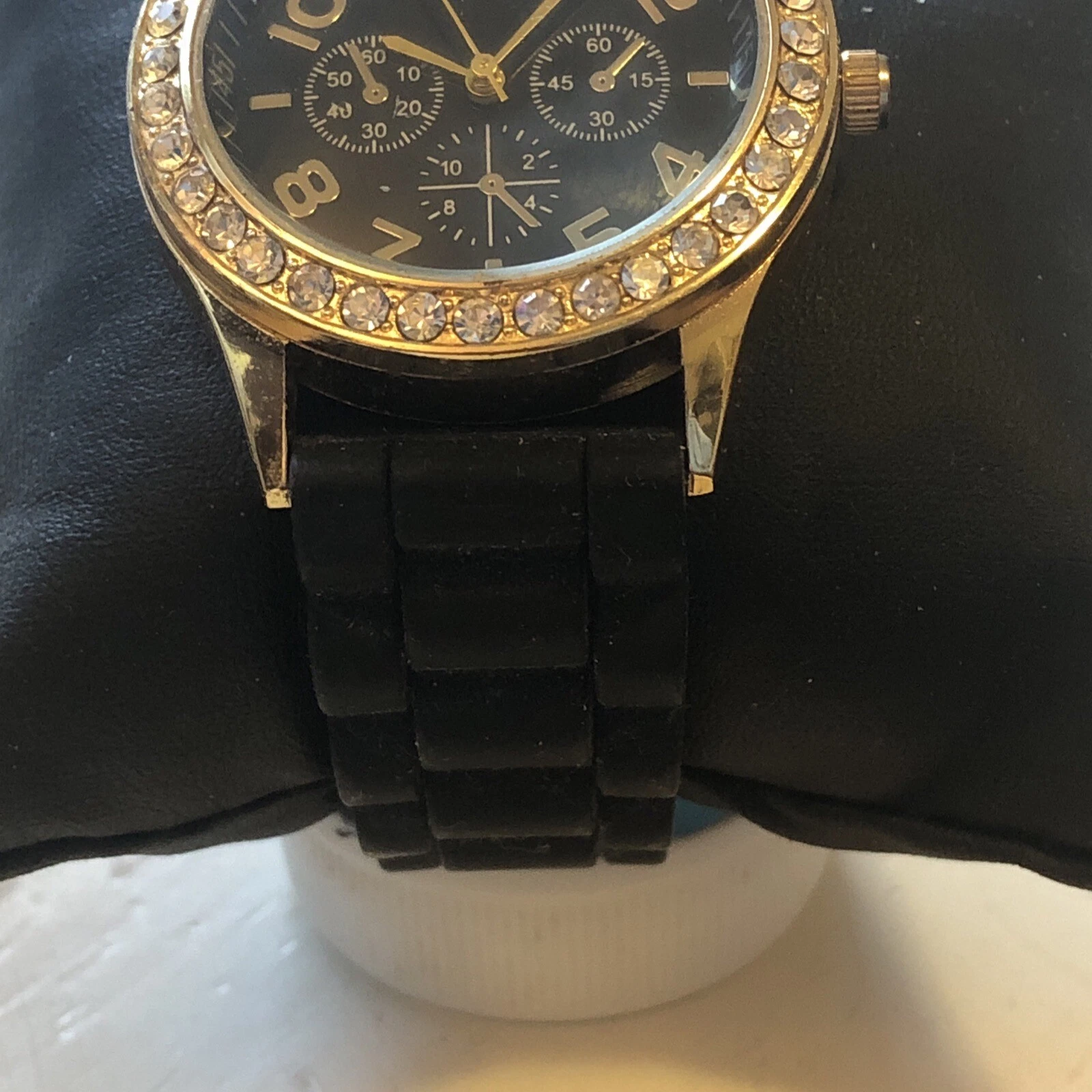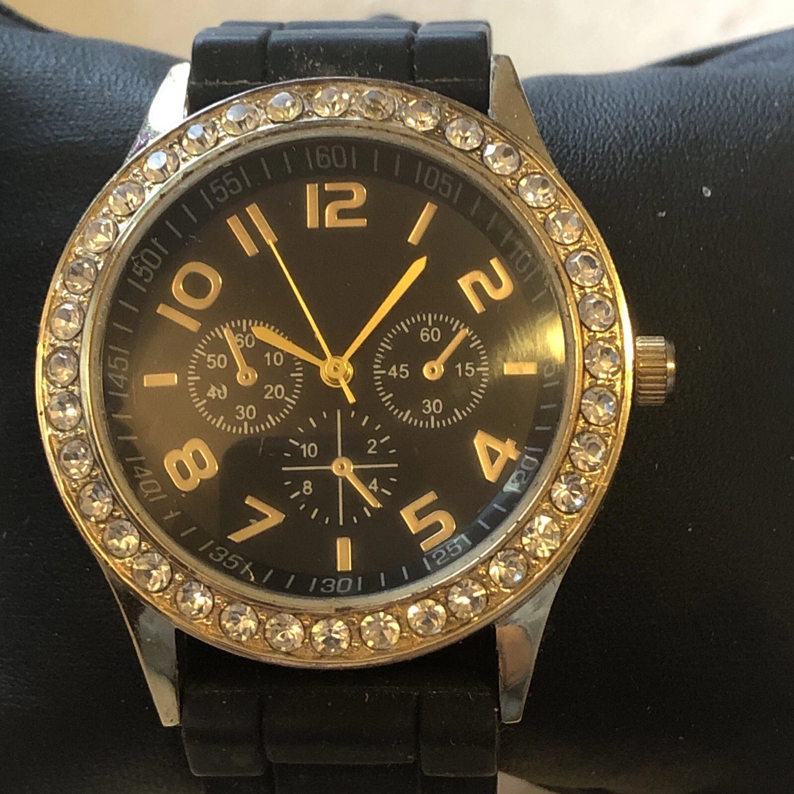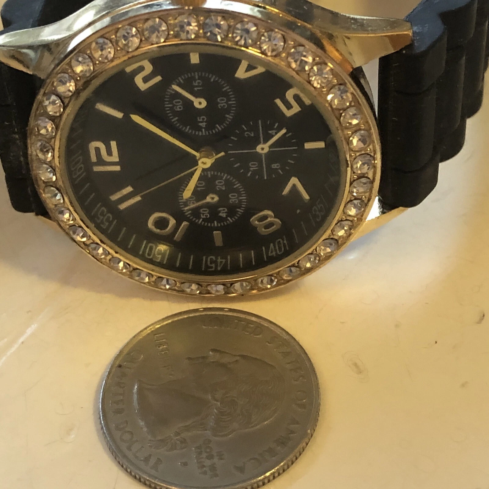 NWOT Woman's Darice Black Silicone Rhinestone Fashion Watch Gold Color Trim