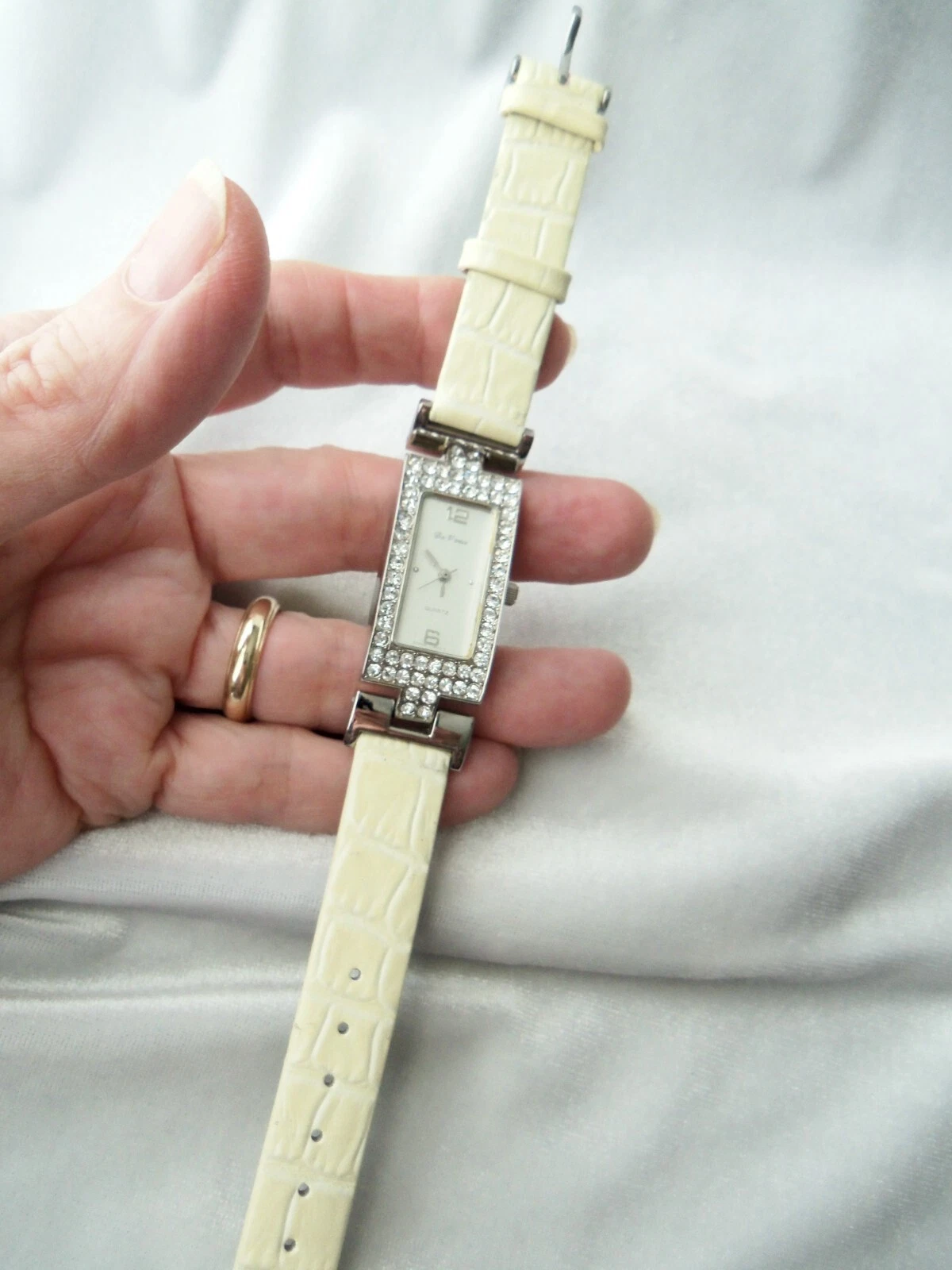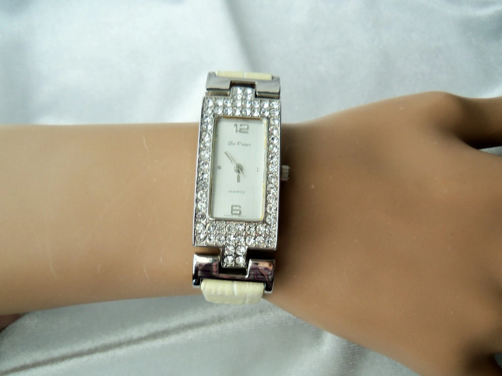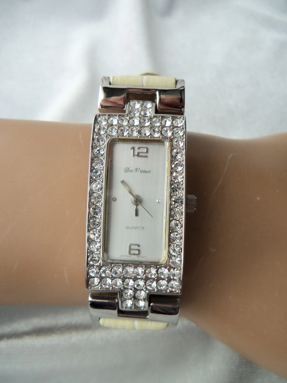 Da Vinci Crystal Rhinestone Bezel Cream Faux Leather Band Watch New Battery