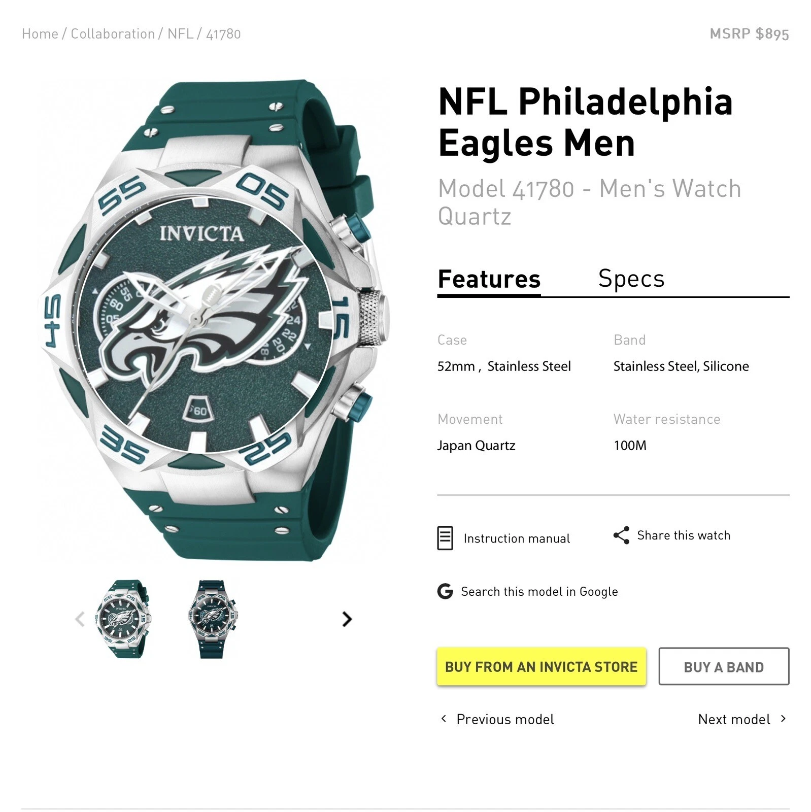 Invicta Men's 52mm NFL Philadelphia Eagles Quartz Watch Silver/Green 41780
