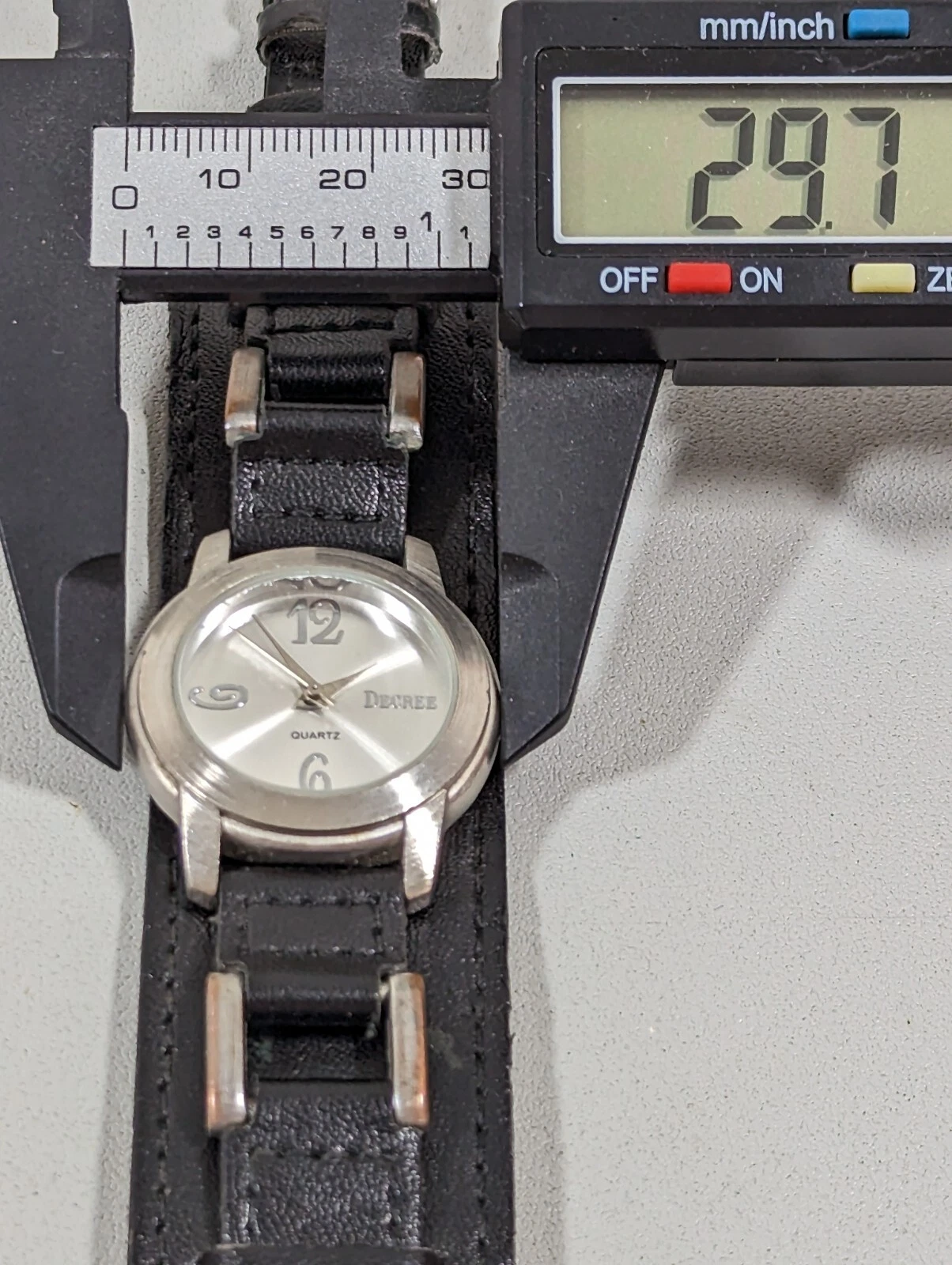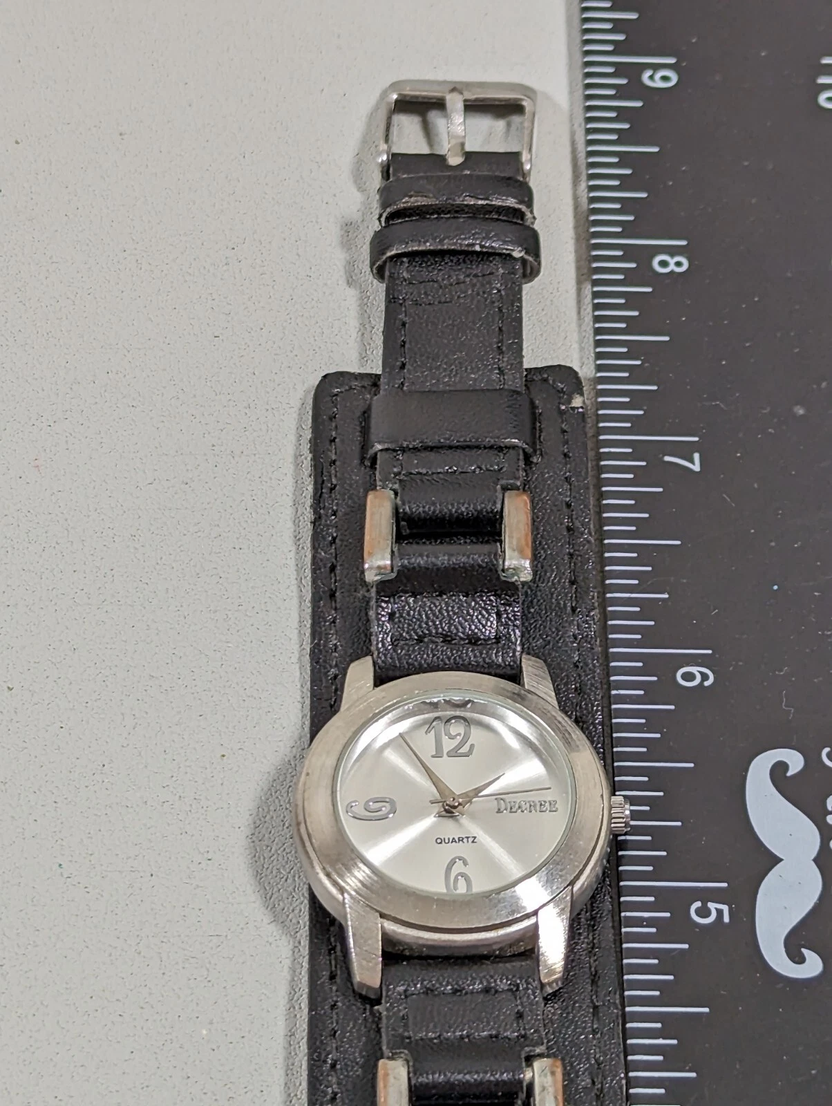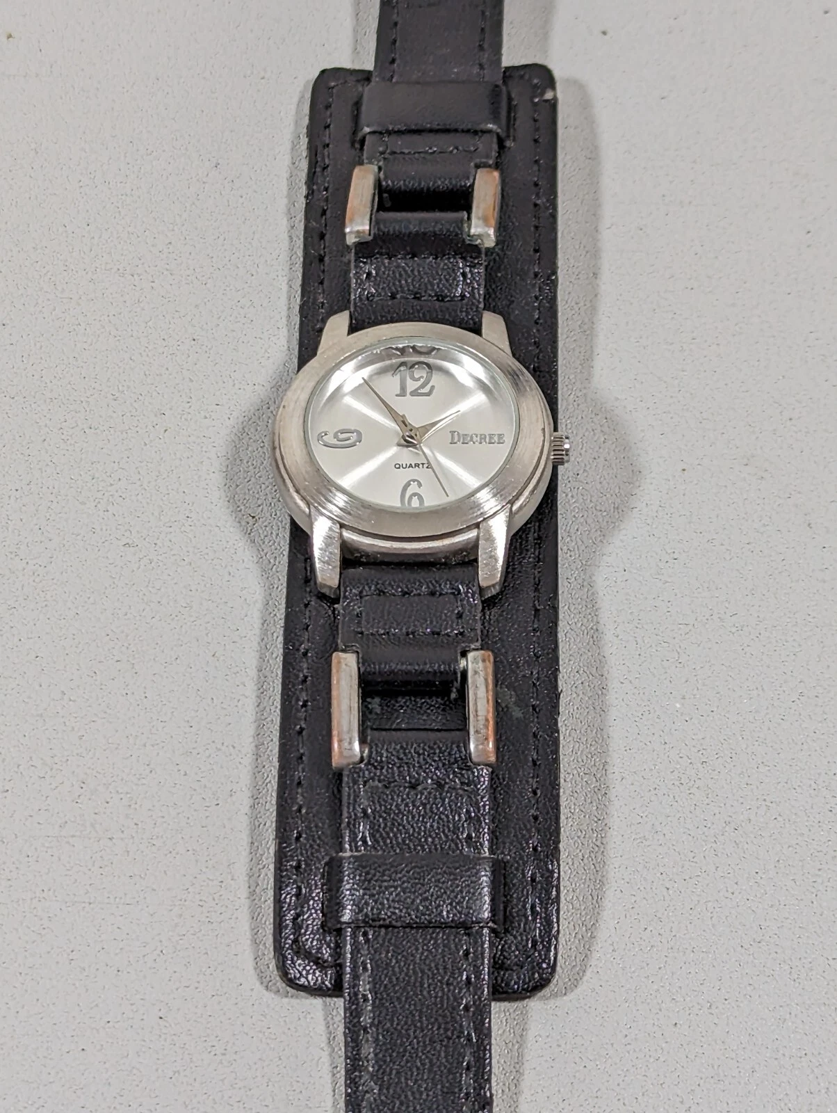 Decree Silver Tone Round Case Black Faux Leather Band Watch