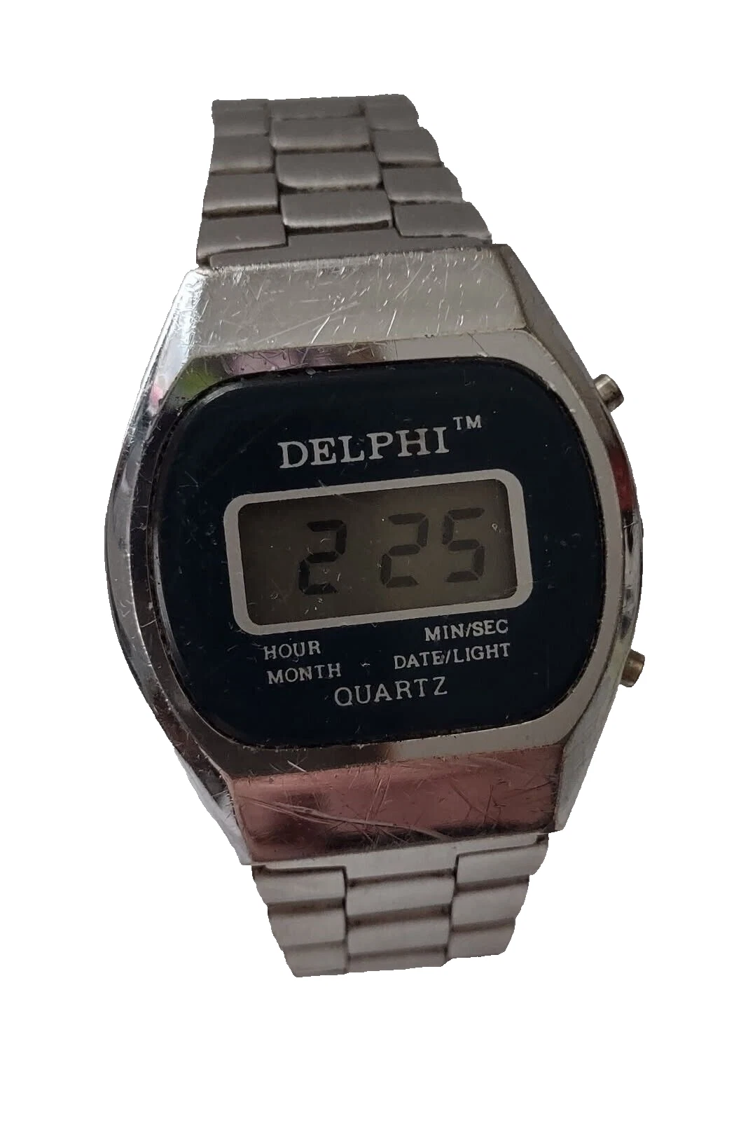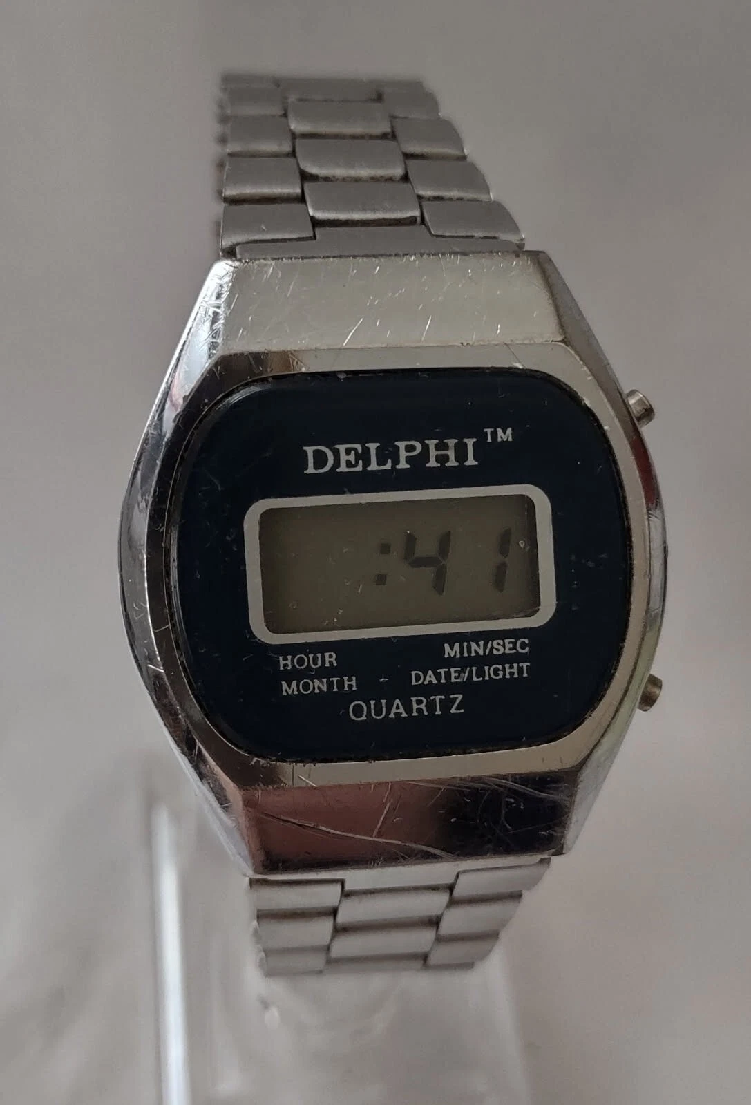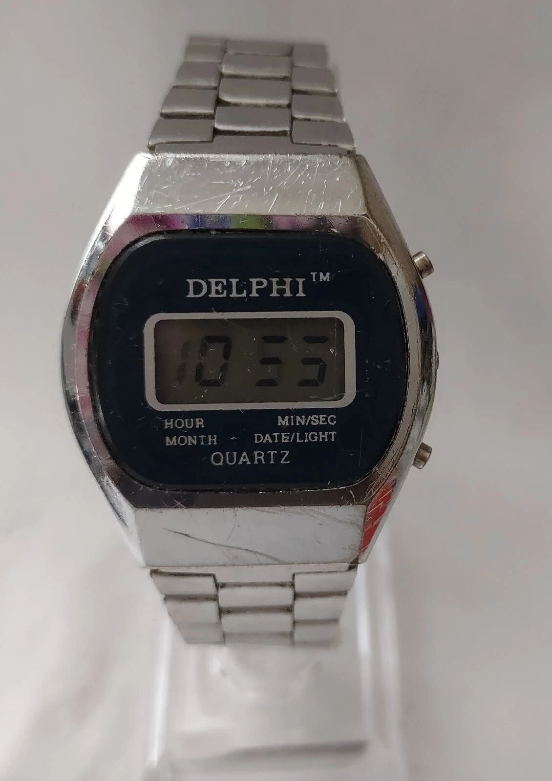 Vintage Delphi Wrist Watch Men Silver Black Digital Quartz Date Light Steel Band