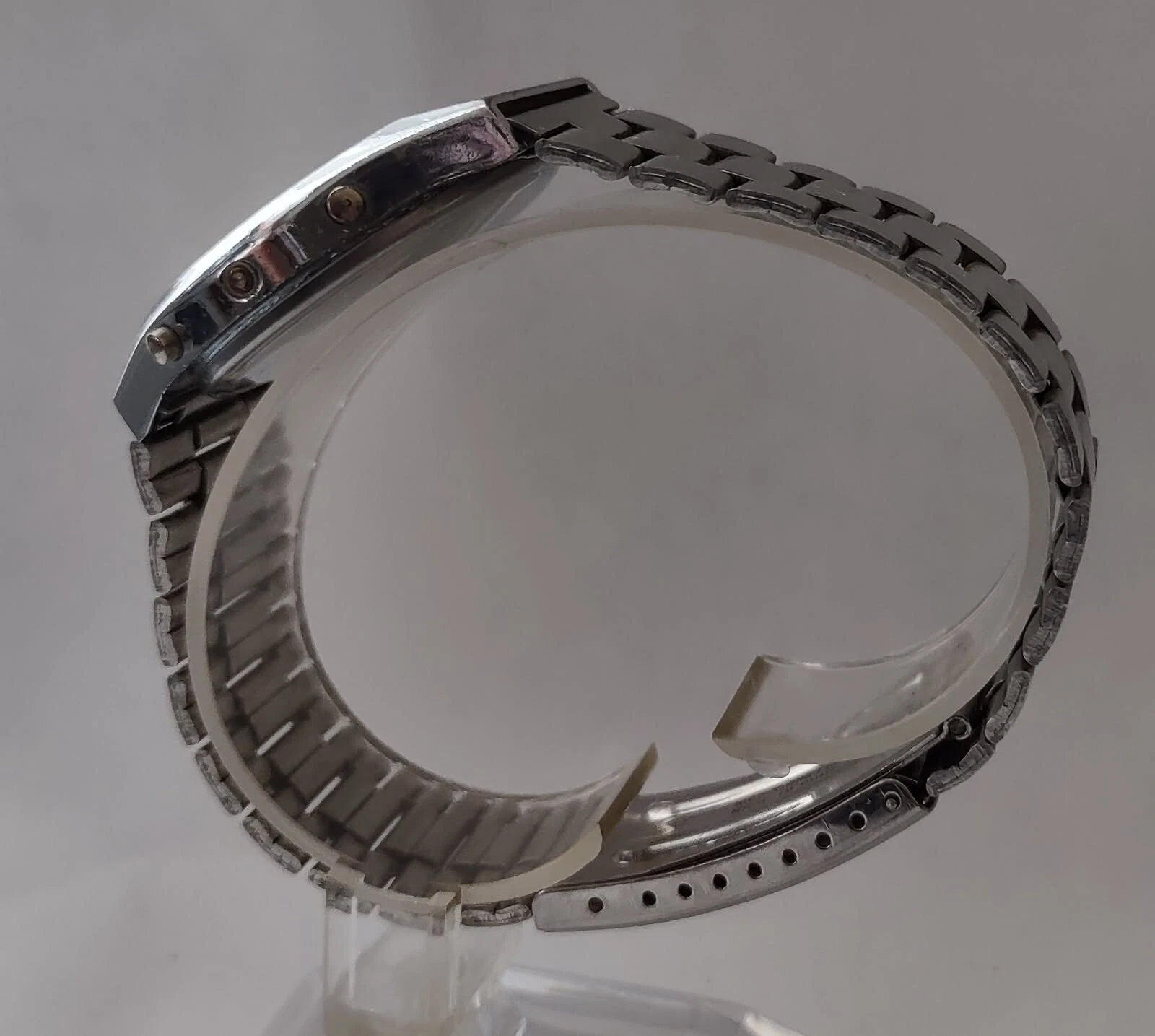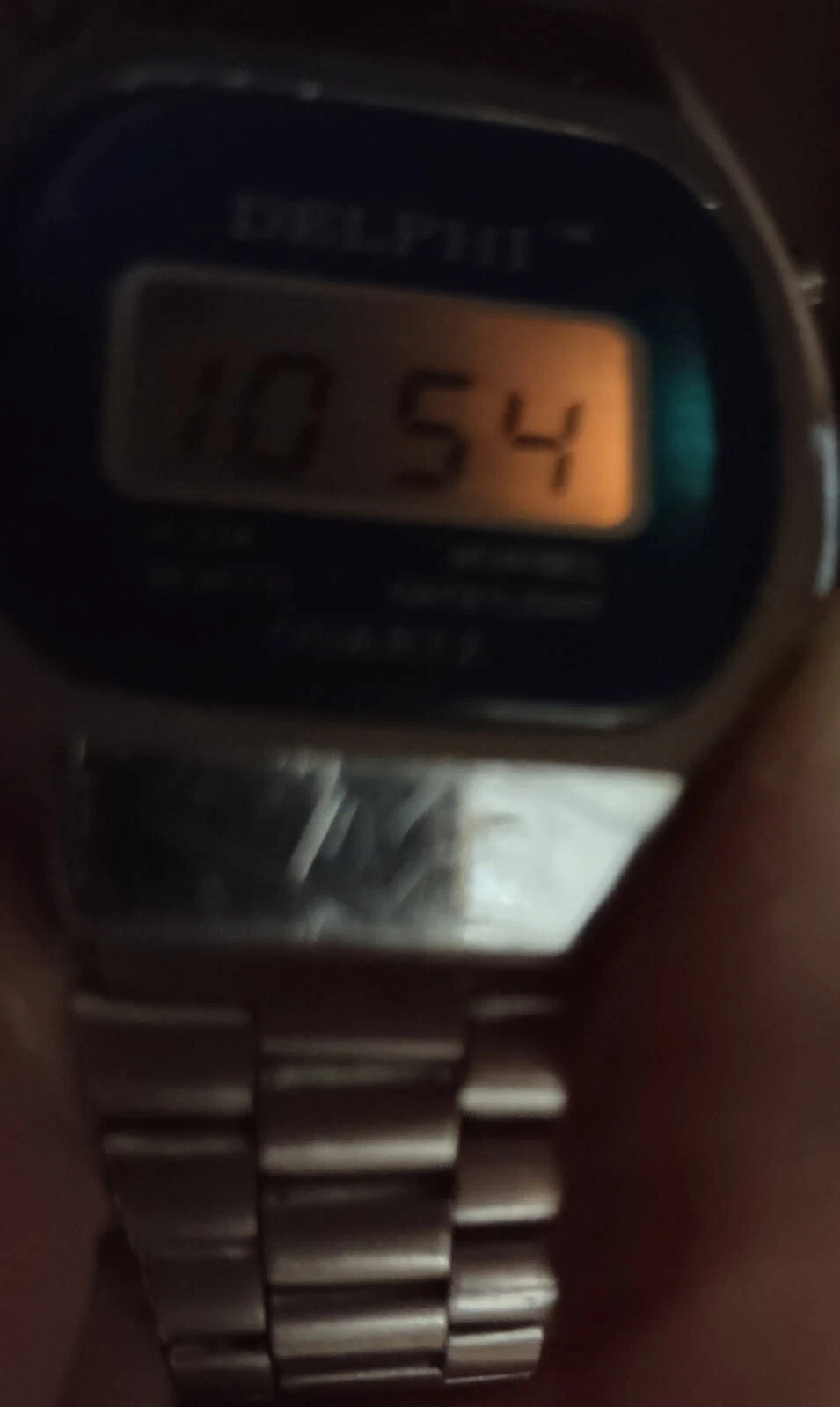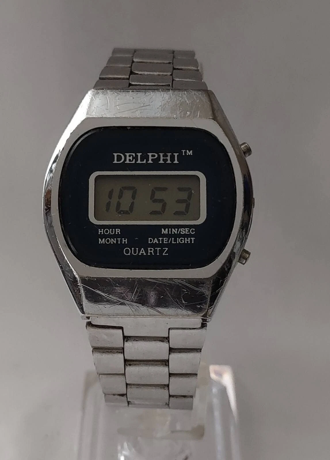 Vintage Delphi Wrist Watch Men Silver Black Digital Quartz Date Light Steel Band