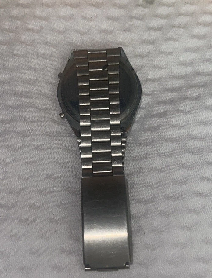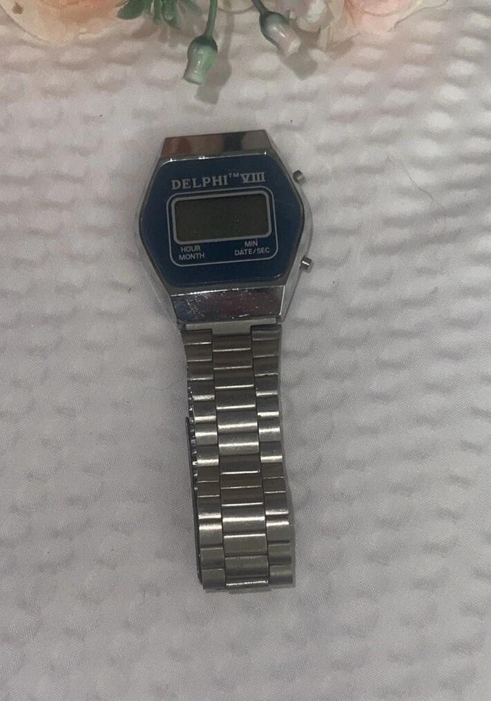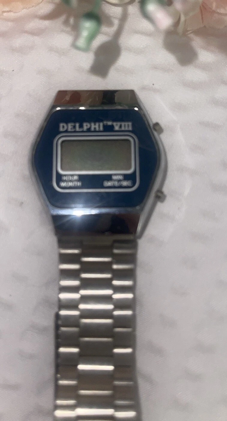 Vintage Delphi TM VIII Digital LCD Wrist Watch Silver Tone Womens Blue Face