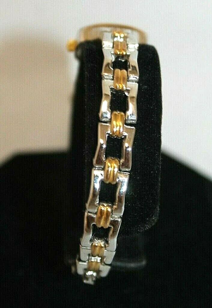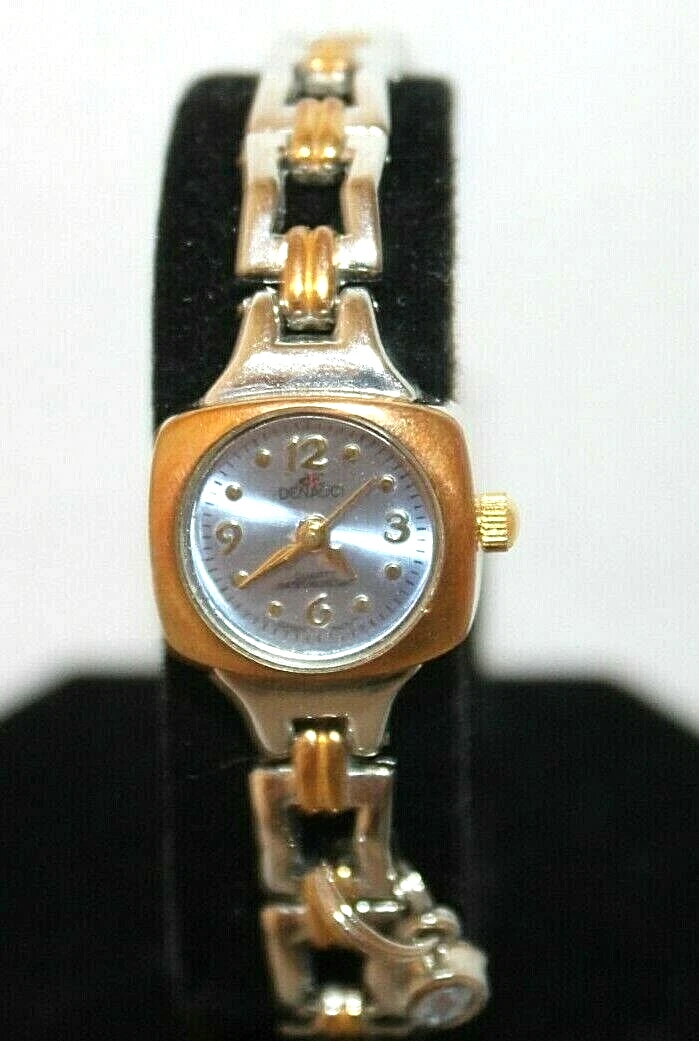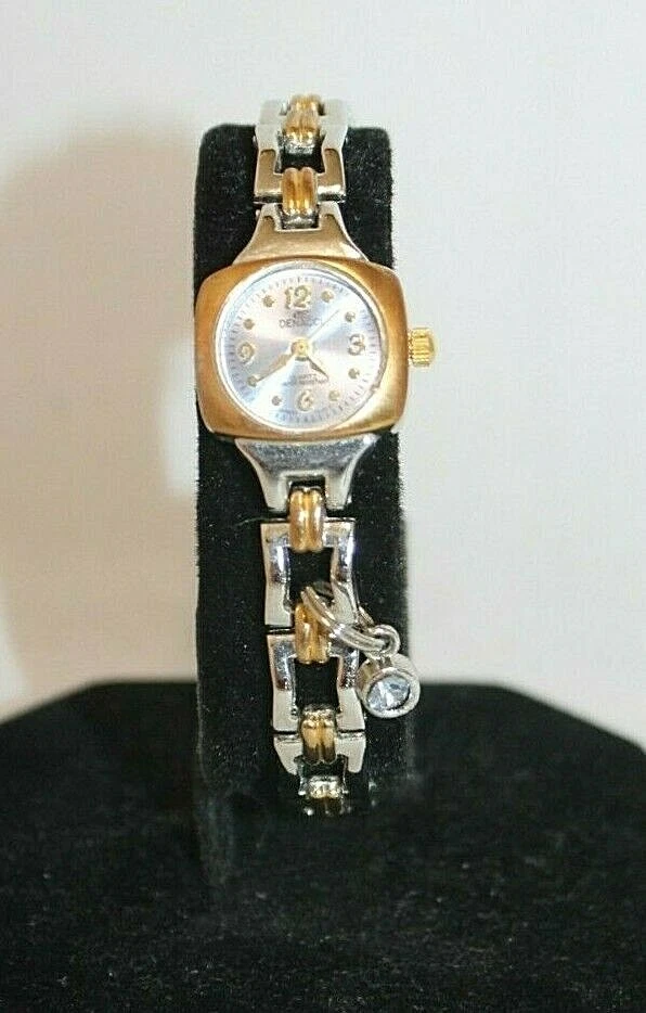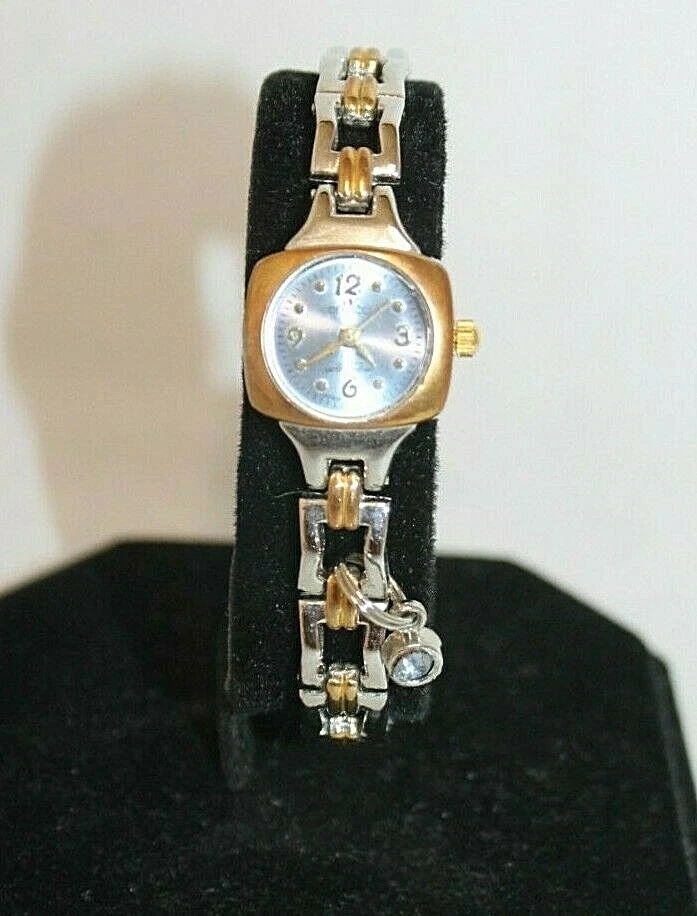 DENACCI GOLD & SILVER WRIST WATCH STAINLESS STEEL BACK 8" LONG BLUE BLING CHARM