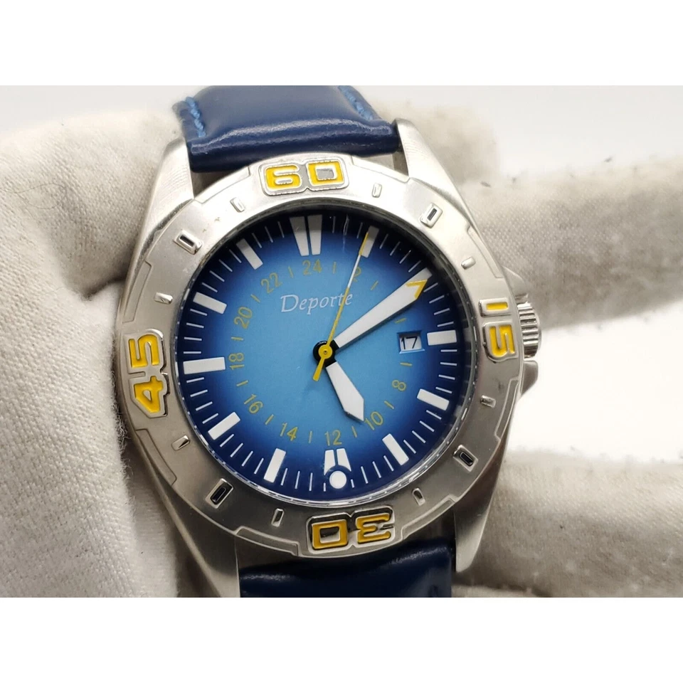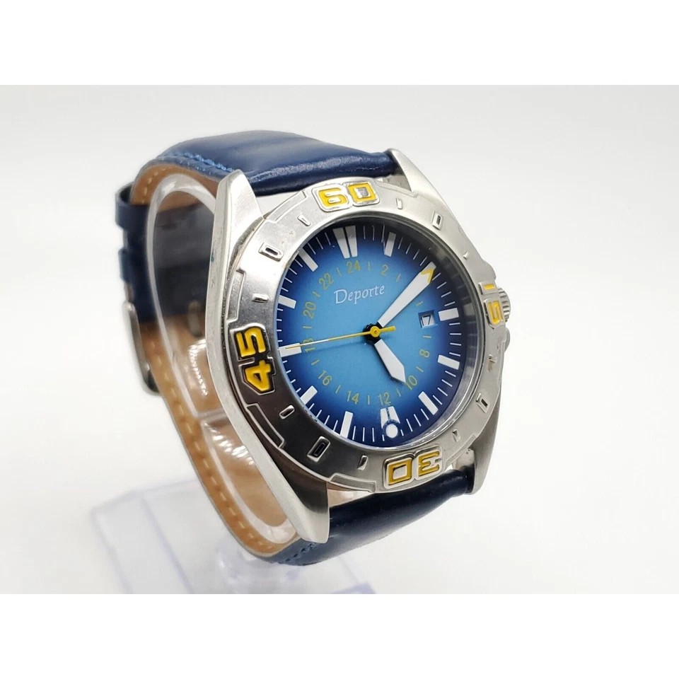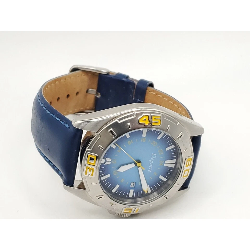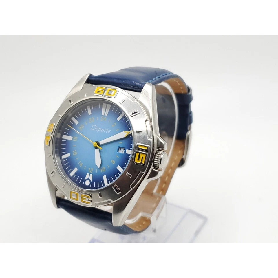 Deporte Watch Mens New Battery Blue/Yellow Date Dial 40mm Blue Band