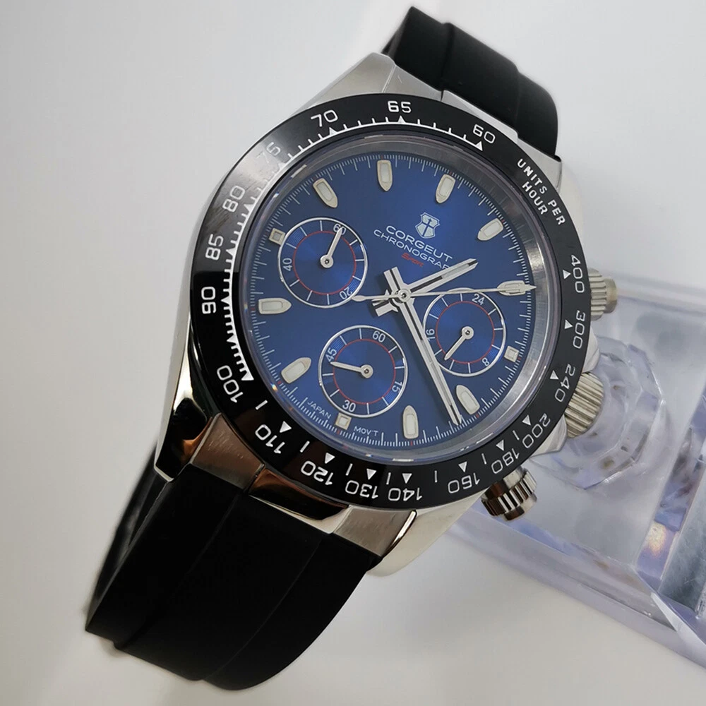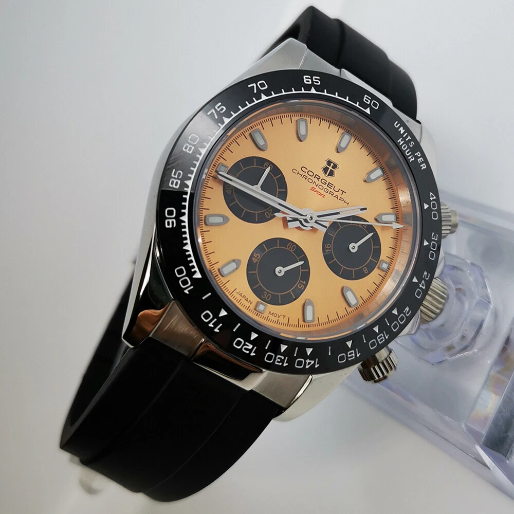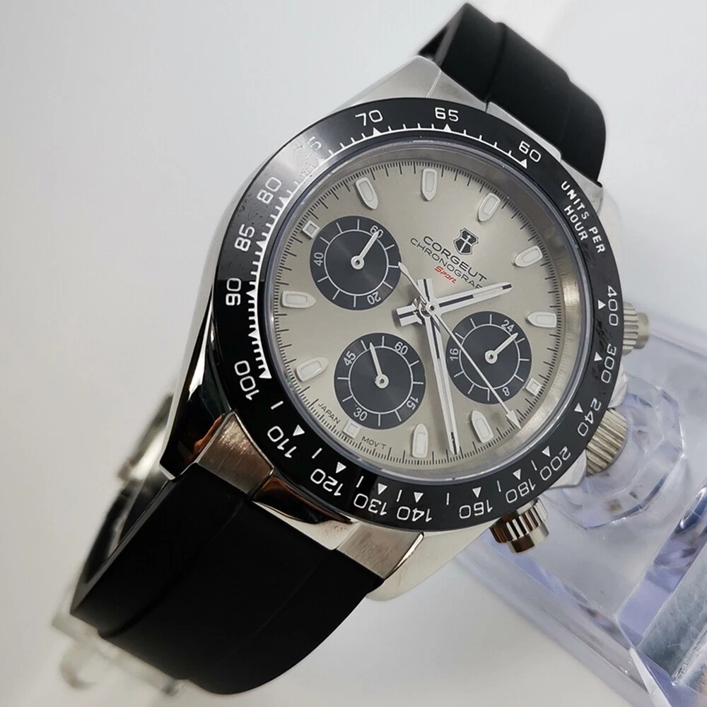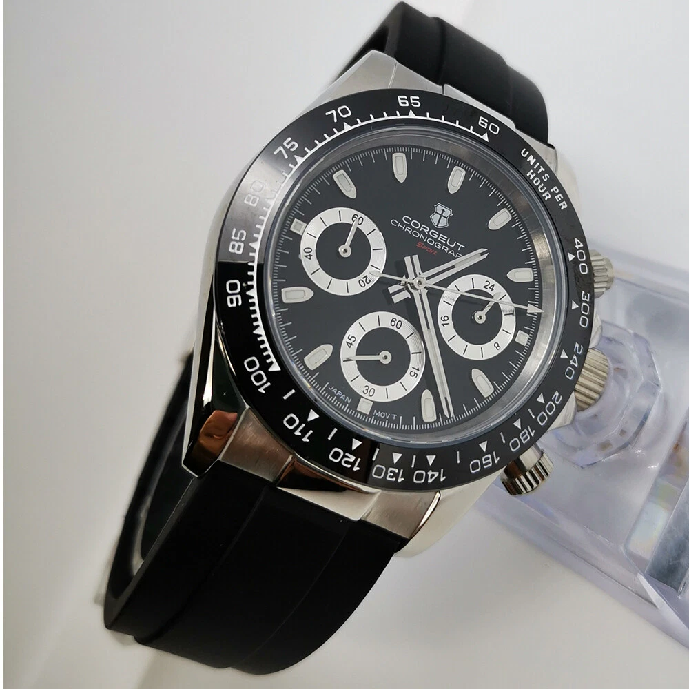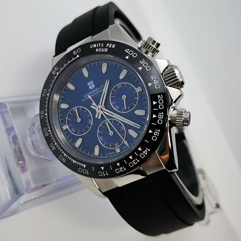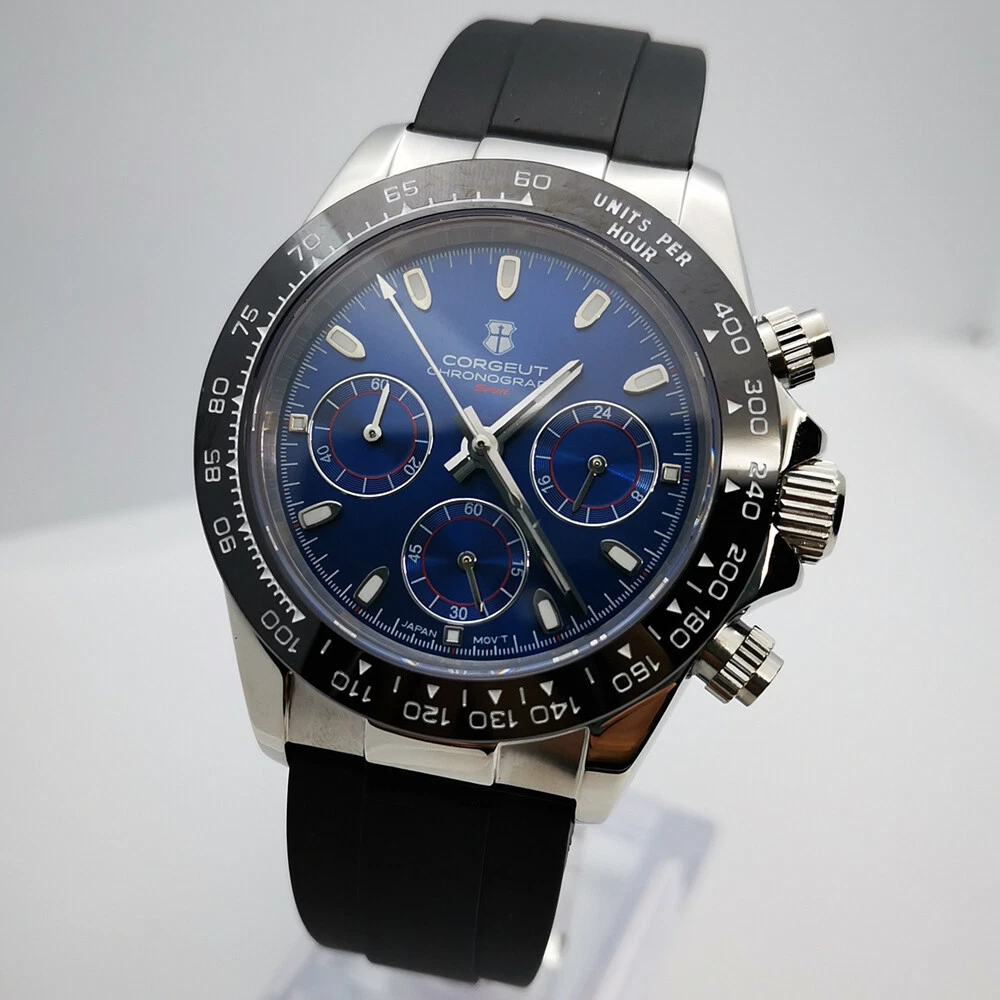 40mm Corgeut chronograph sapphire glass rubber strap sport quartz mens watch