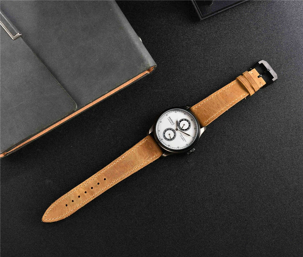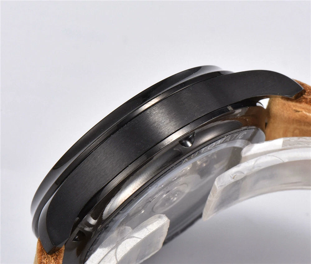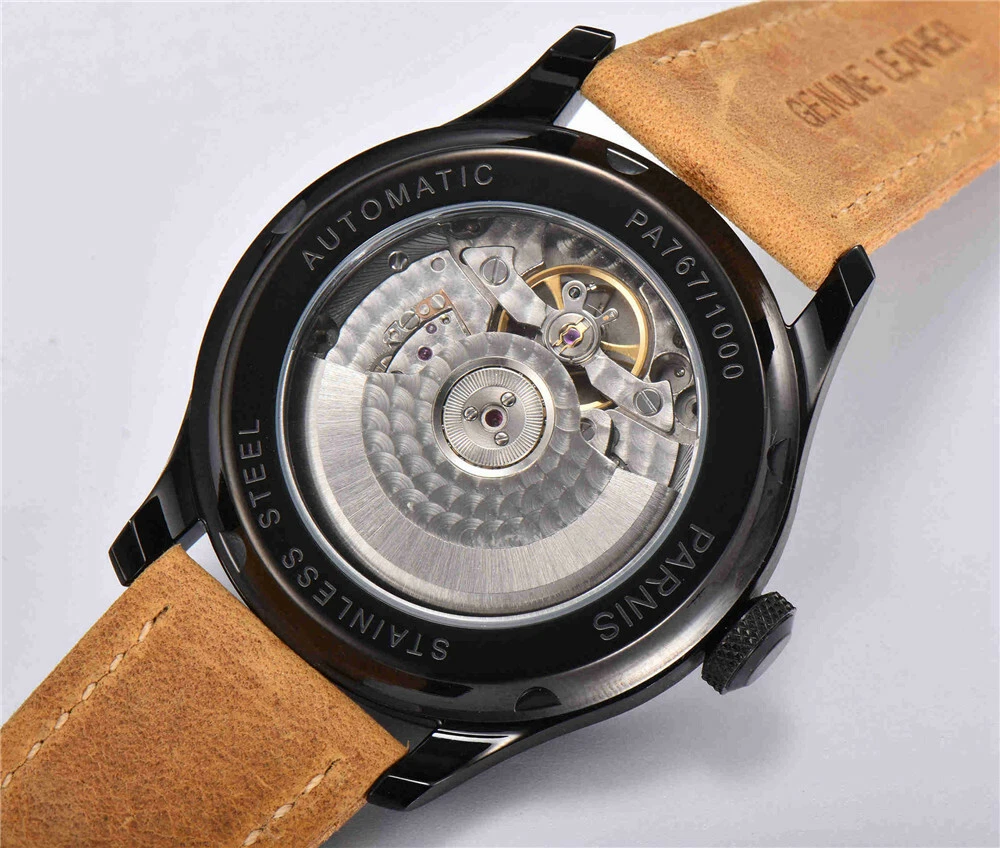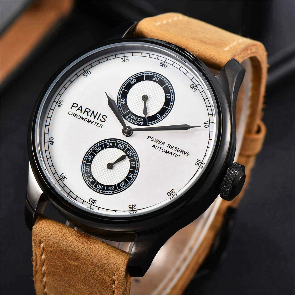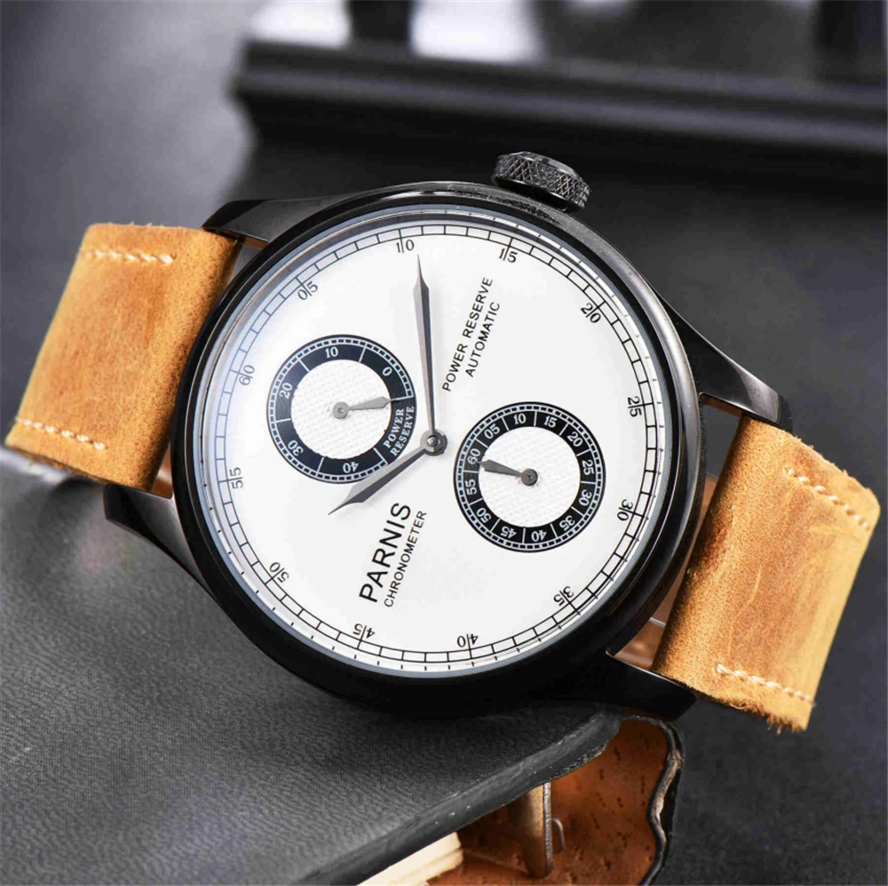 43m PARNIS White Dial PVD Case Leather Bands Power Reserve Automatic Mens Watch