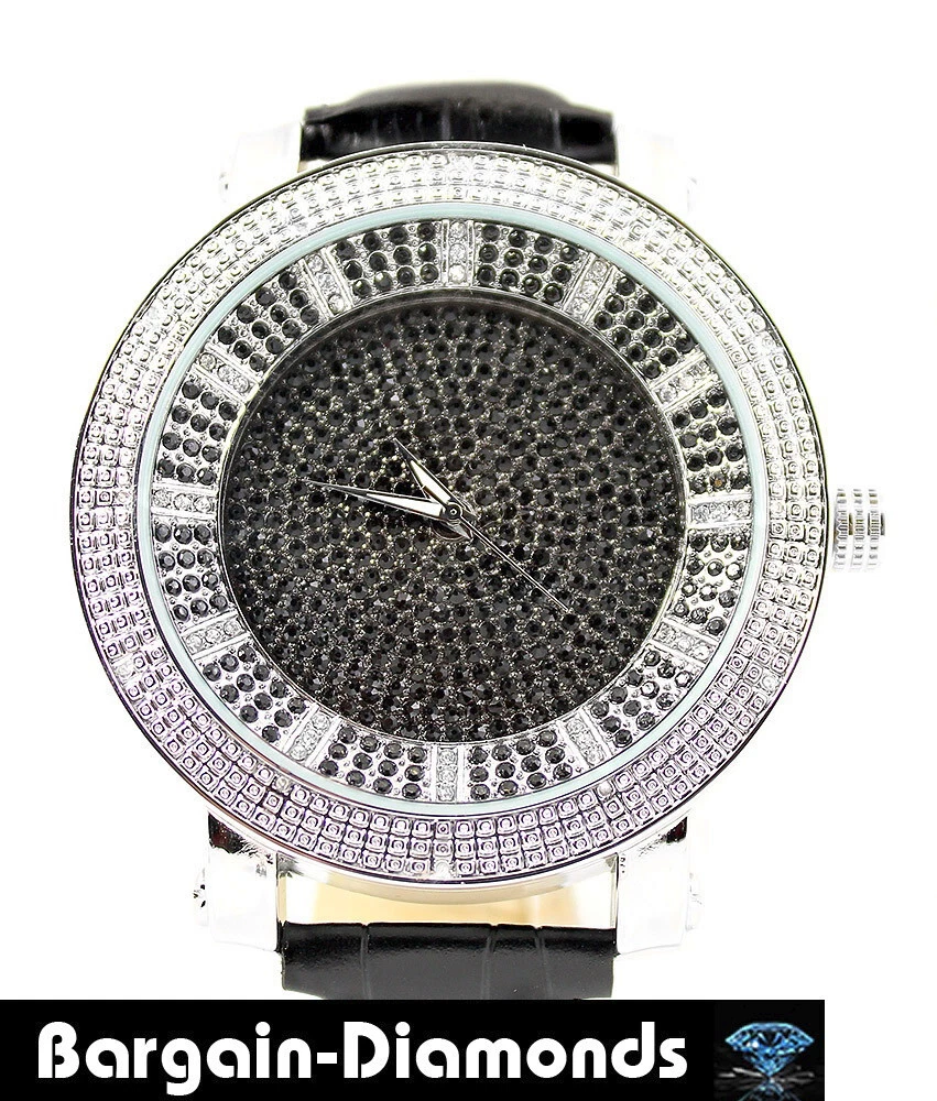 Mens 60mm Natural Diamond Silver tone Clubbing Watch Black XL Dial 8"-10"Leather