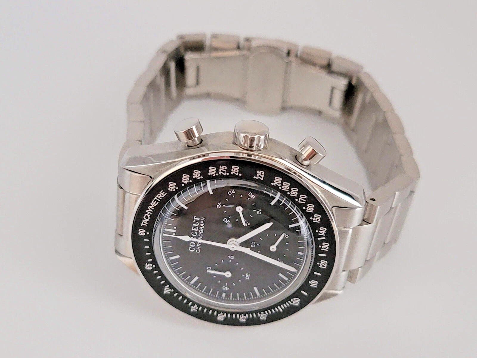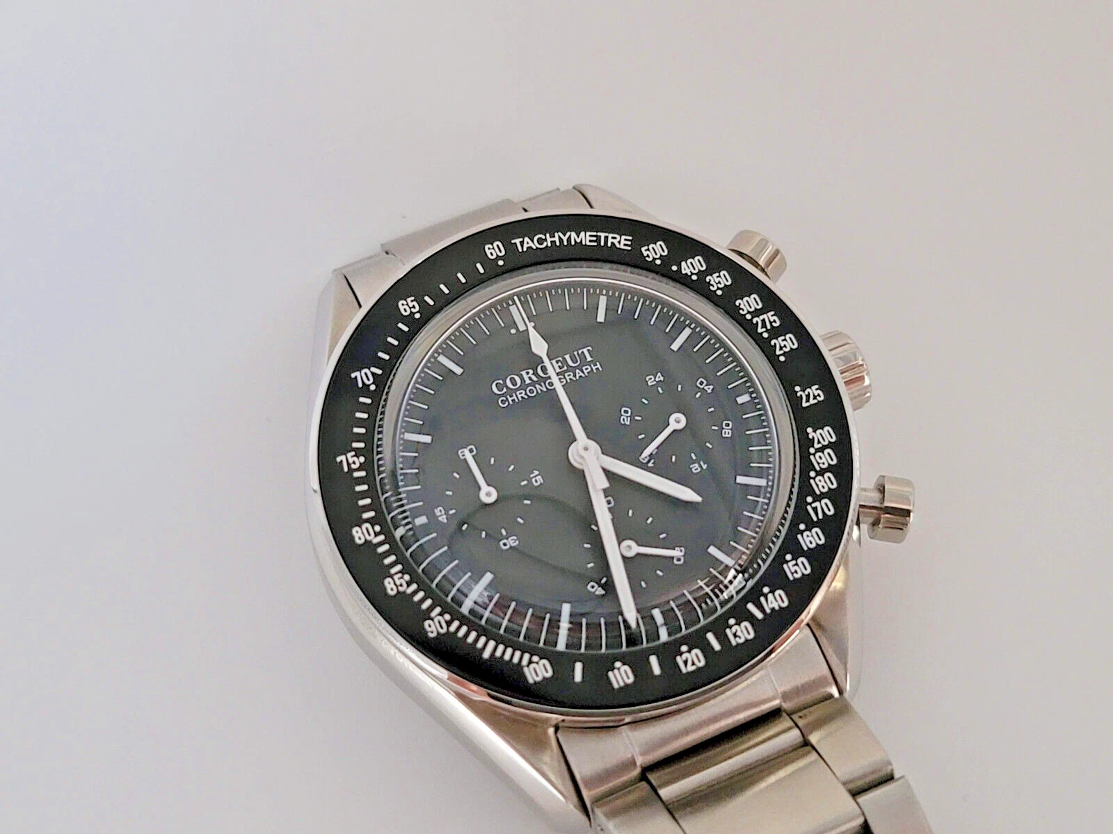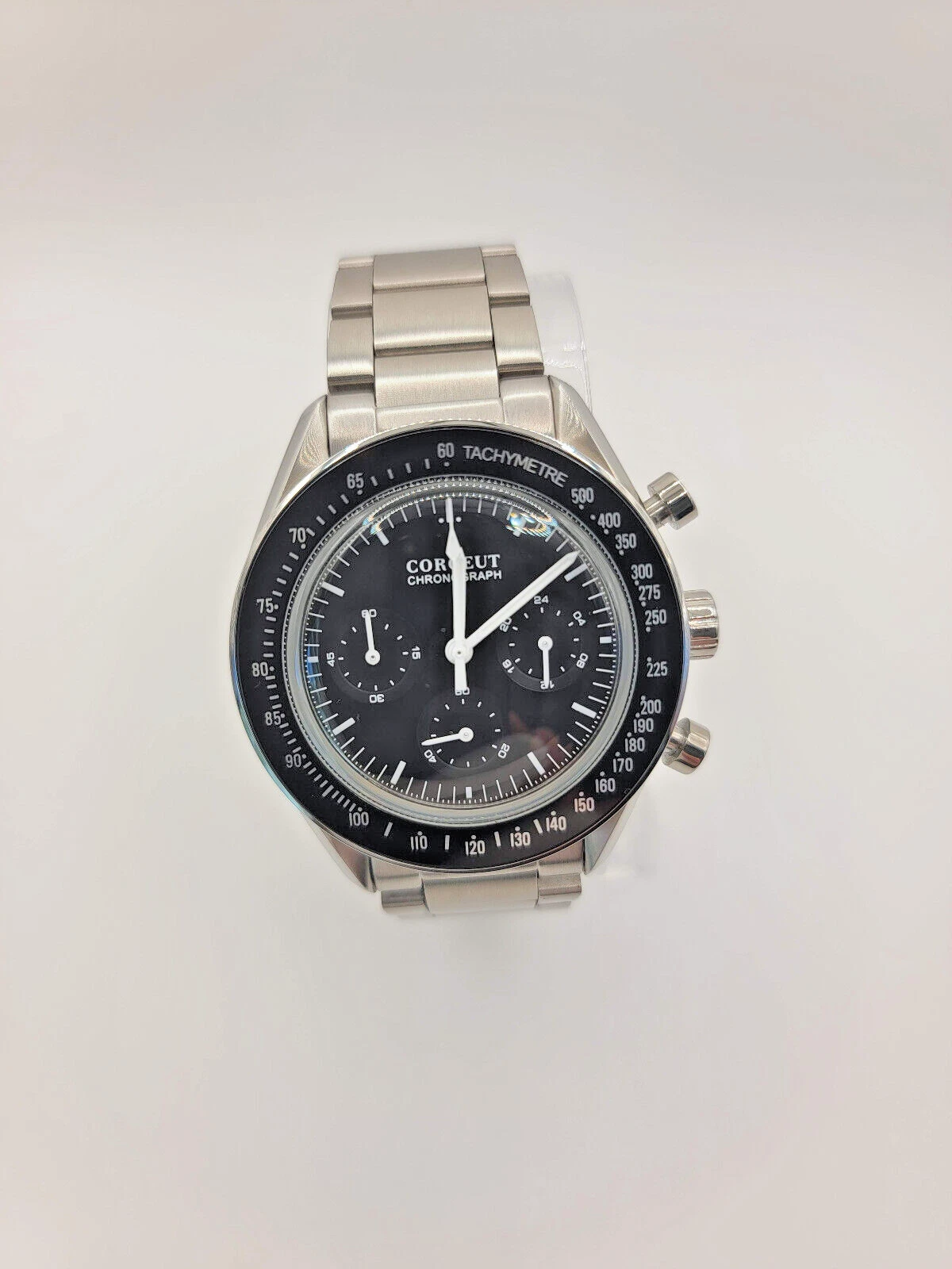 40mm corgeut black dial steel bracelet quartz full chronograph mens watch