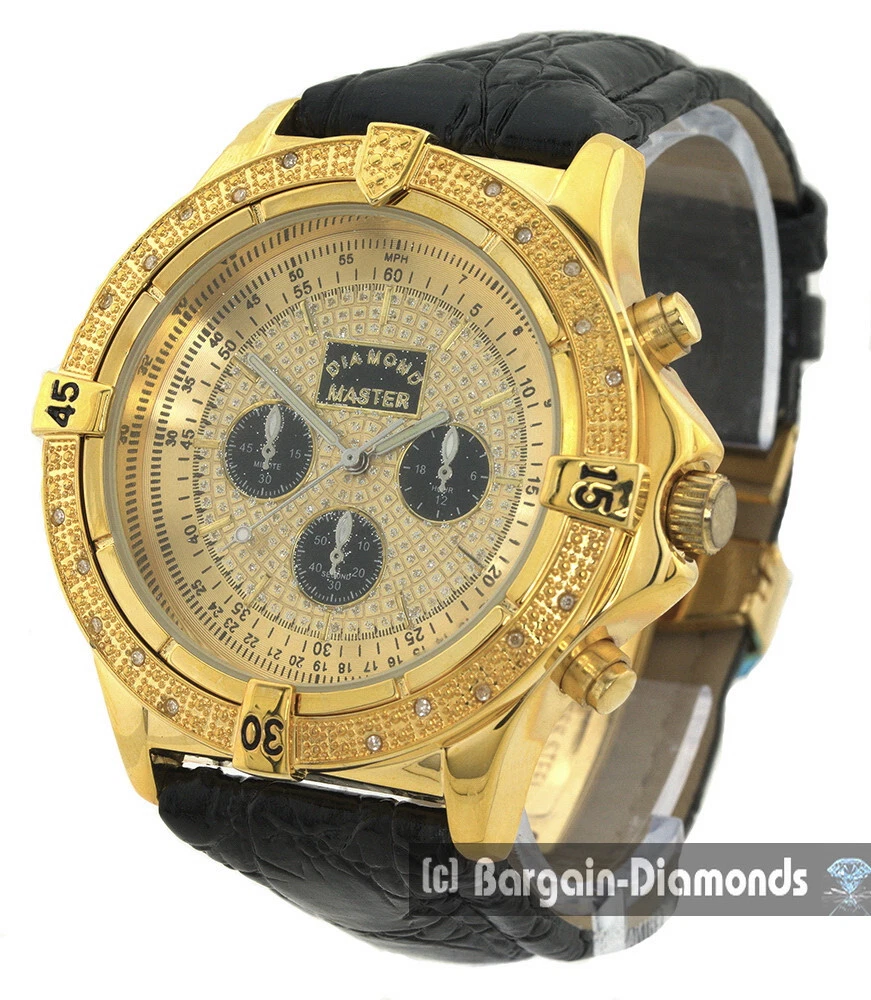 Mens 22 Natural Diamond Goldtone Clubbing Watch Gold Dial Black Strap Deployment