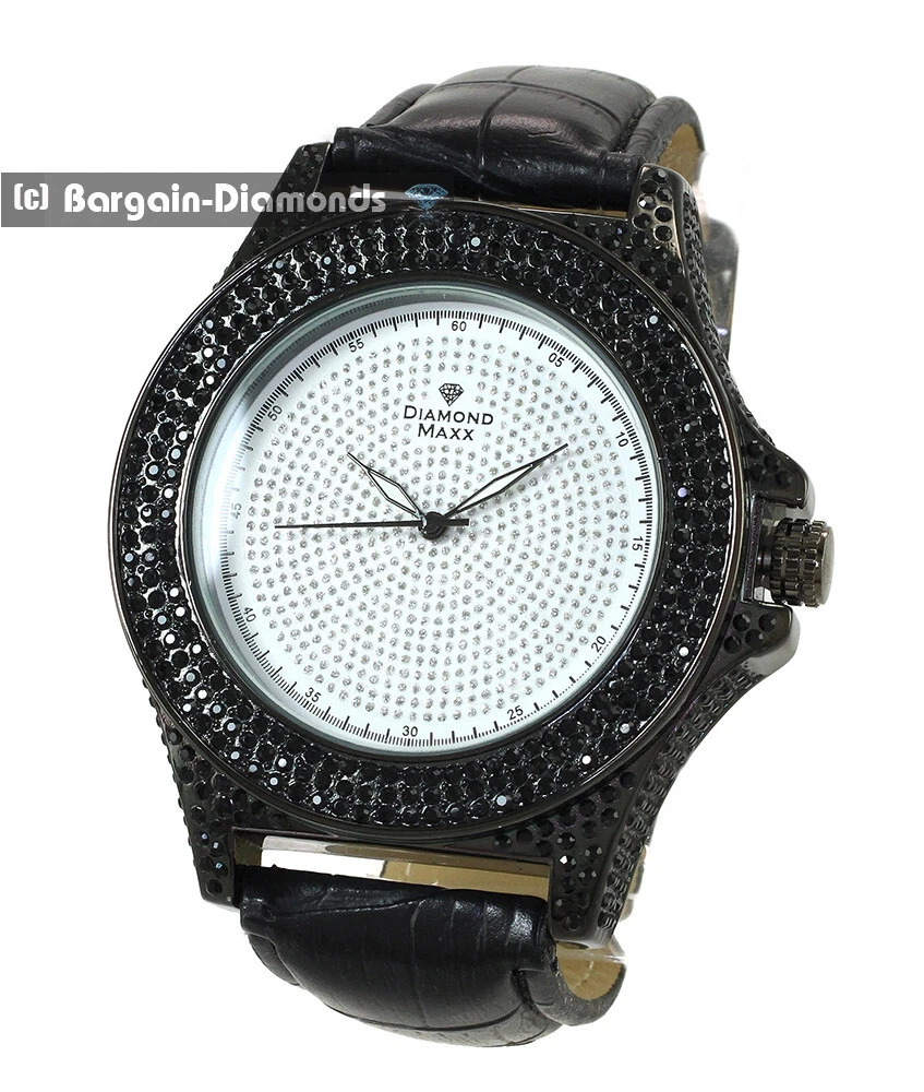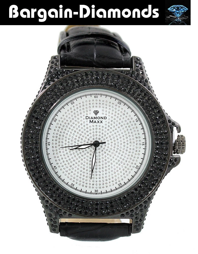 Mens 50 mm Diamond Black CZ Ice Out White Dial Clubbing Watch Leather 8"-10"