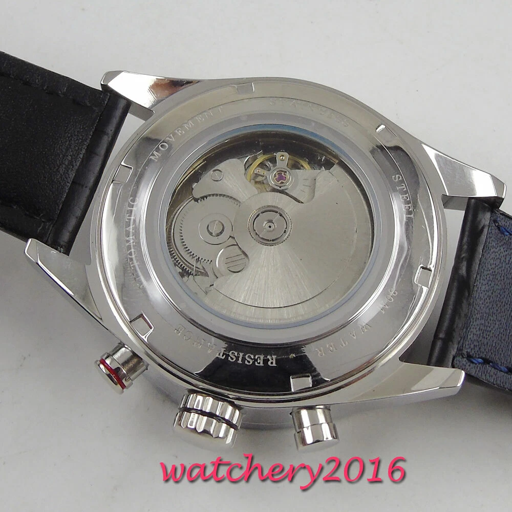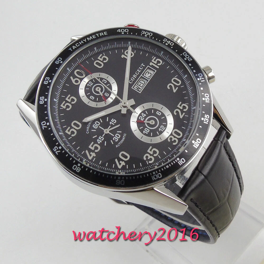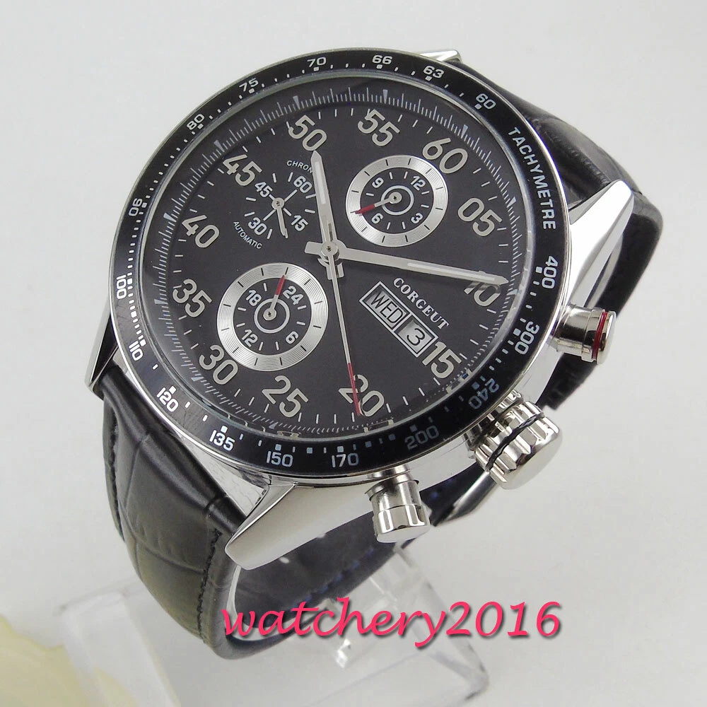 44mm Automatic Men's Watch Auto Date Week Black Dial Leather Strap 24 hours