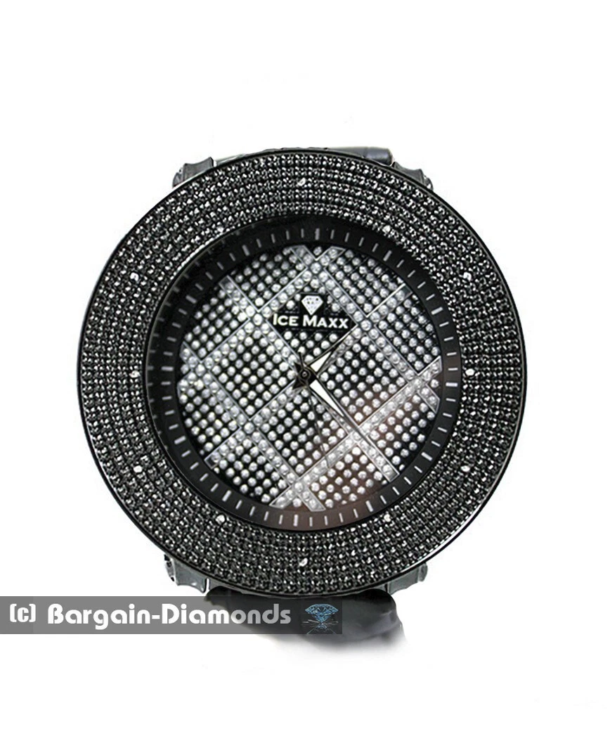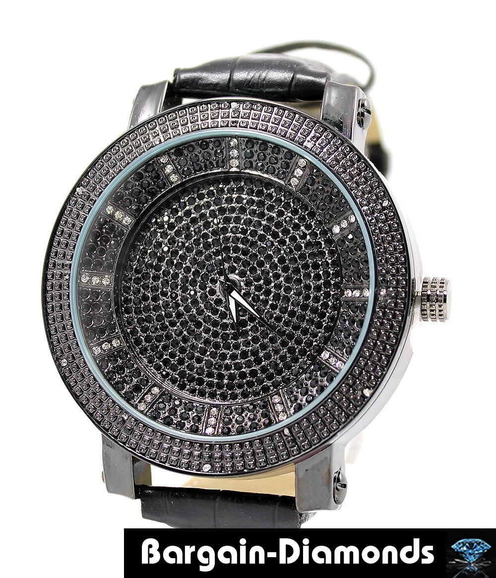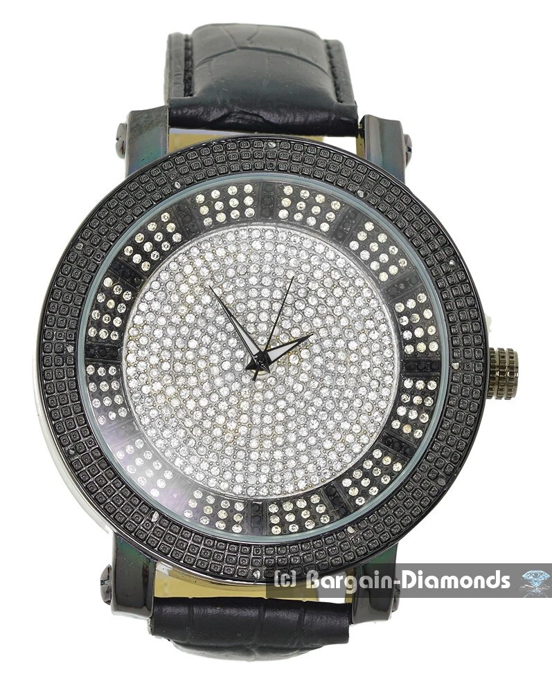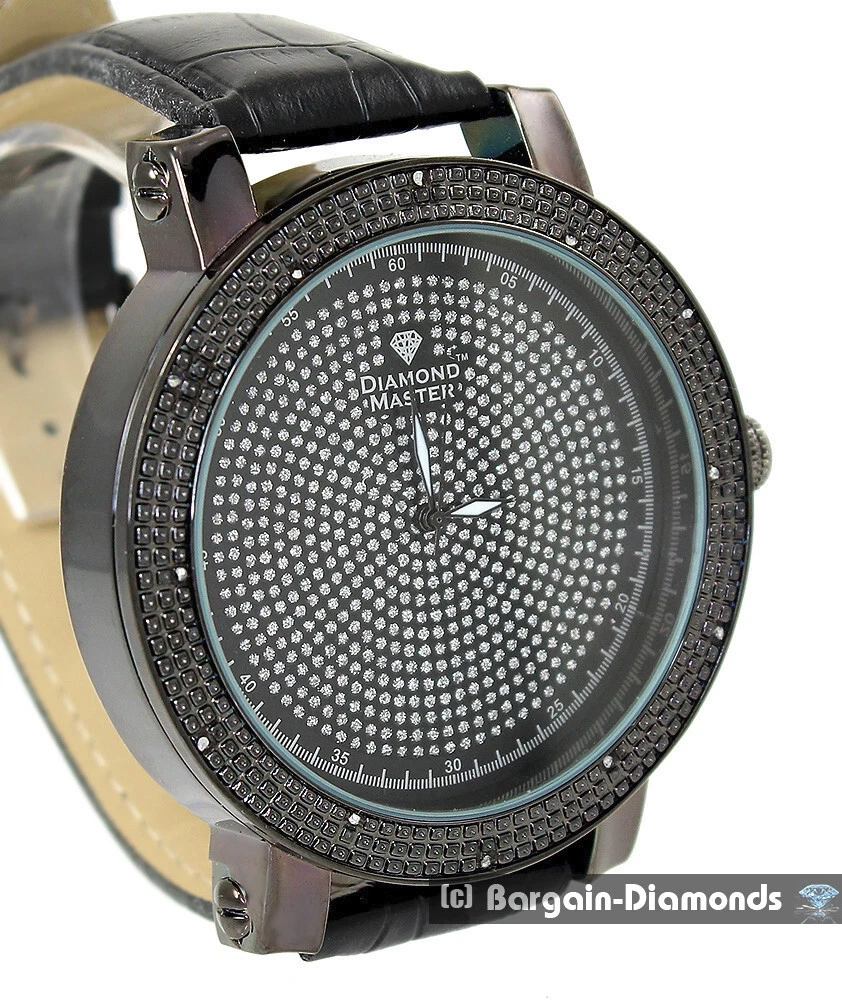 Mens 60 mm Black Natural Diamond Black-White CZ Dial Clubbing Watch  9"-10.5"