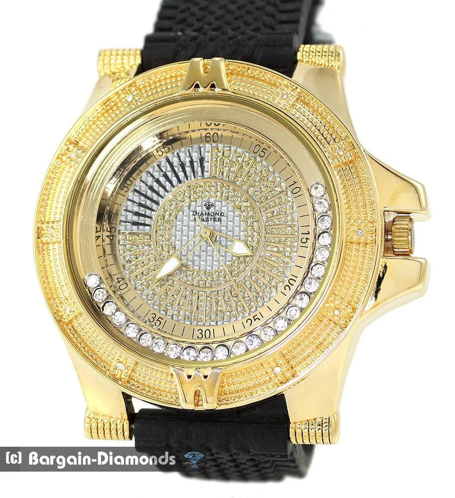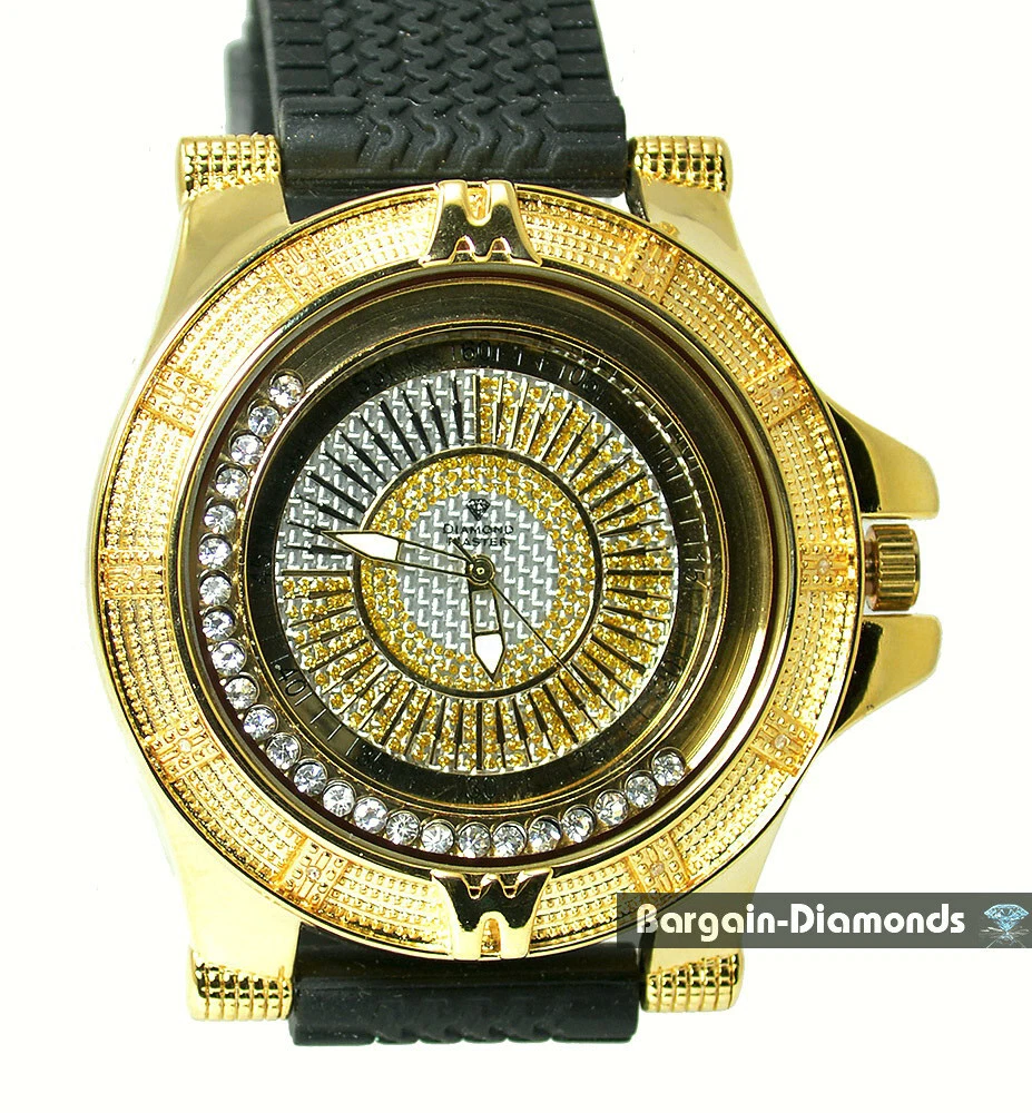 Mens Big Natural Diamond Gold tone Clubbing Watch CZ Race Gold Dial Sport Strap