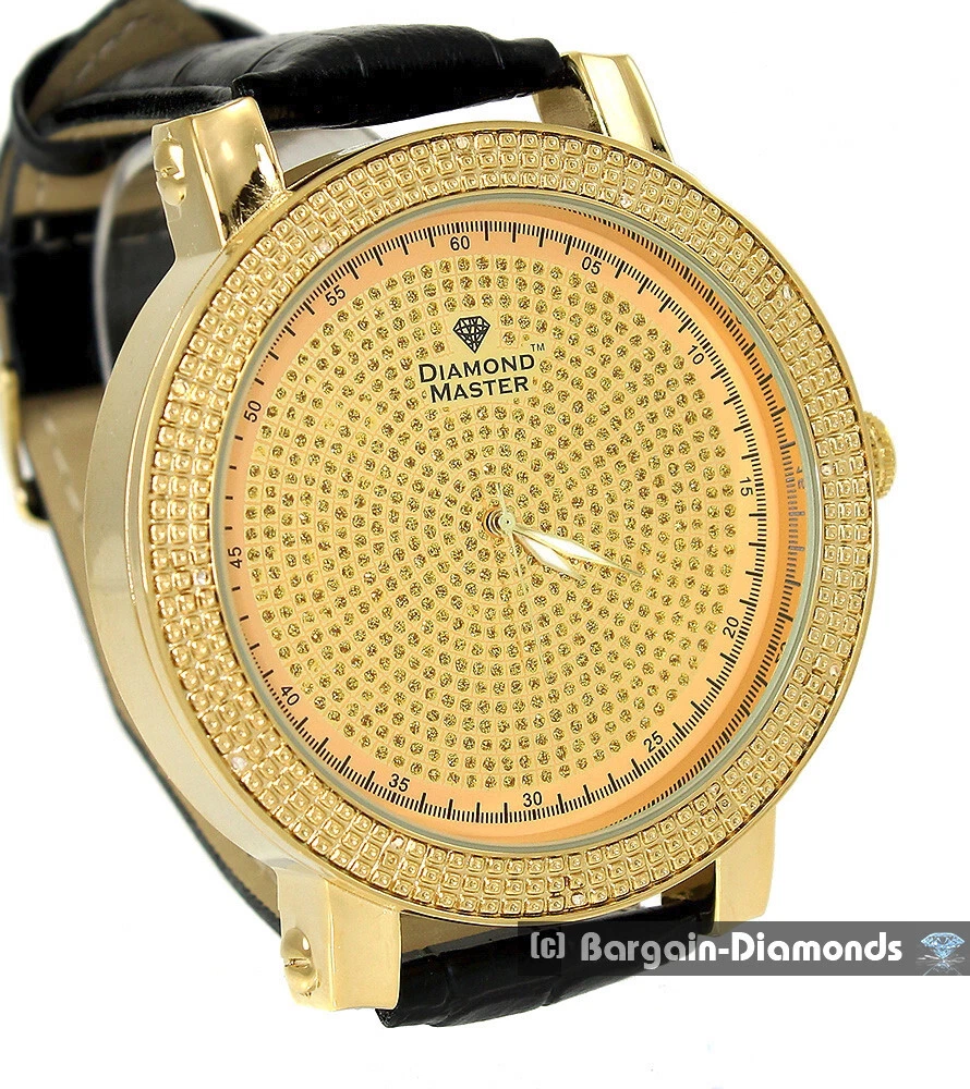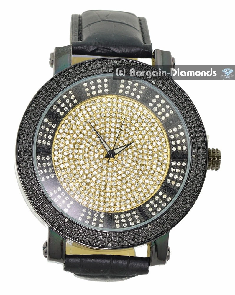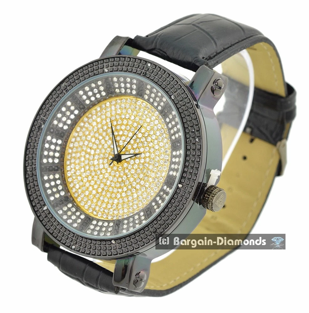 Mens Big 60mm Natural Diamond Black Clubbing Watch Gold CZs Dial 10" Leather