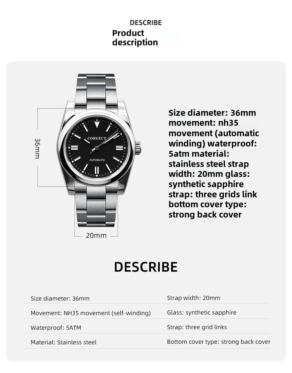 Brand name, men's, luminous, waterproof, oyster, automatic, mechanical watch