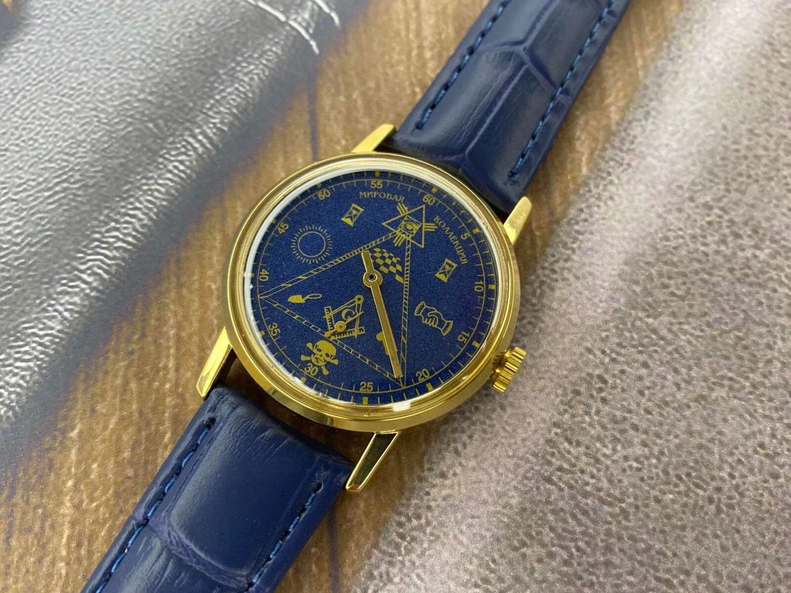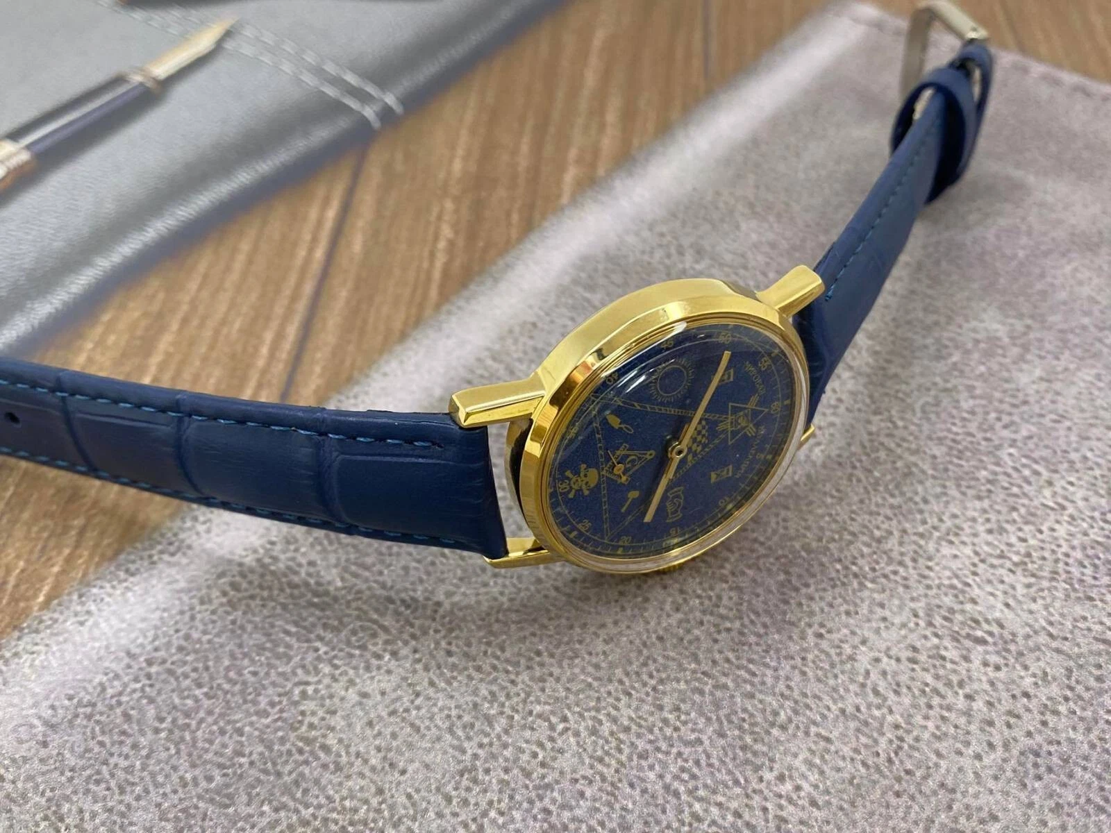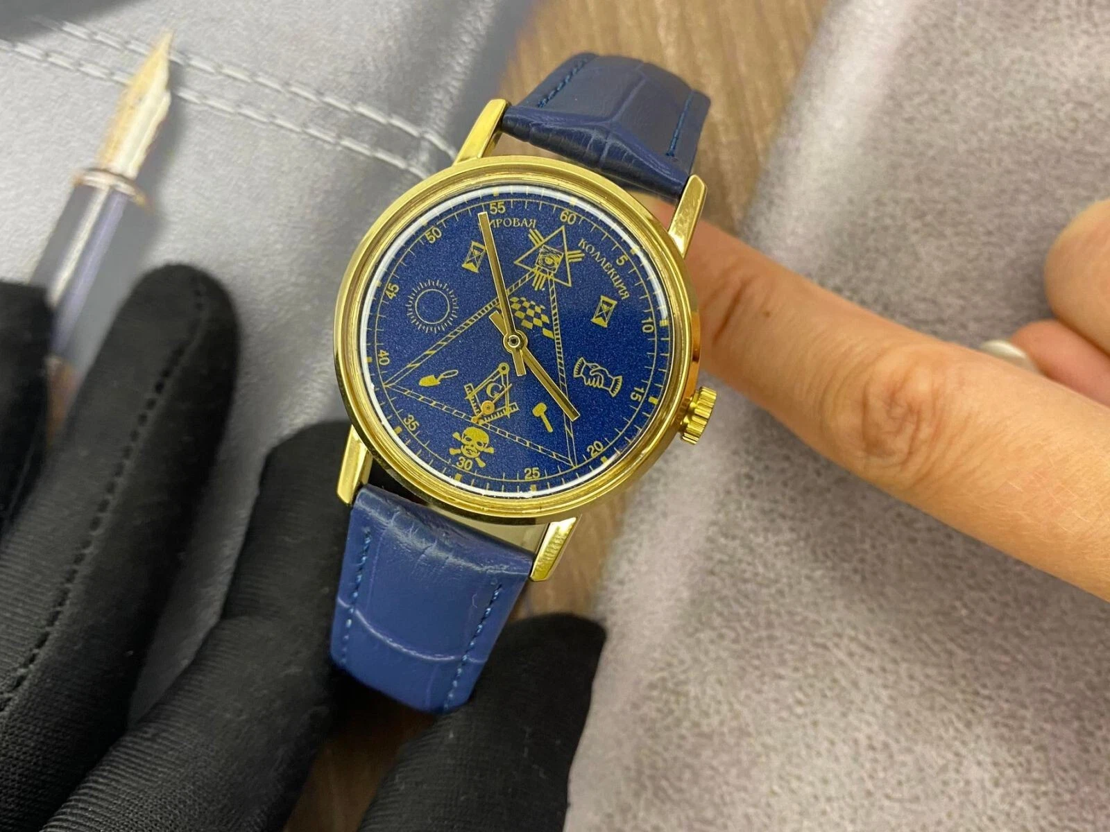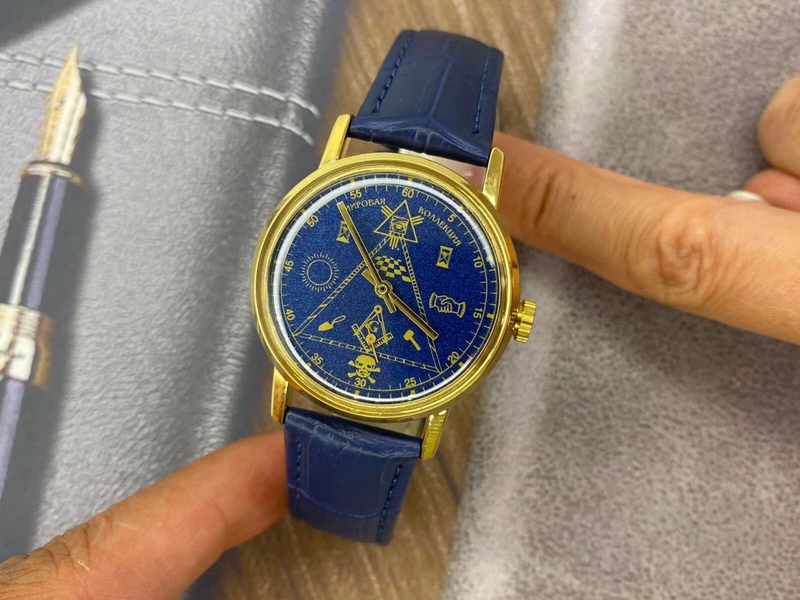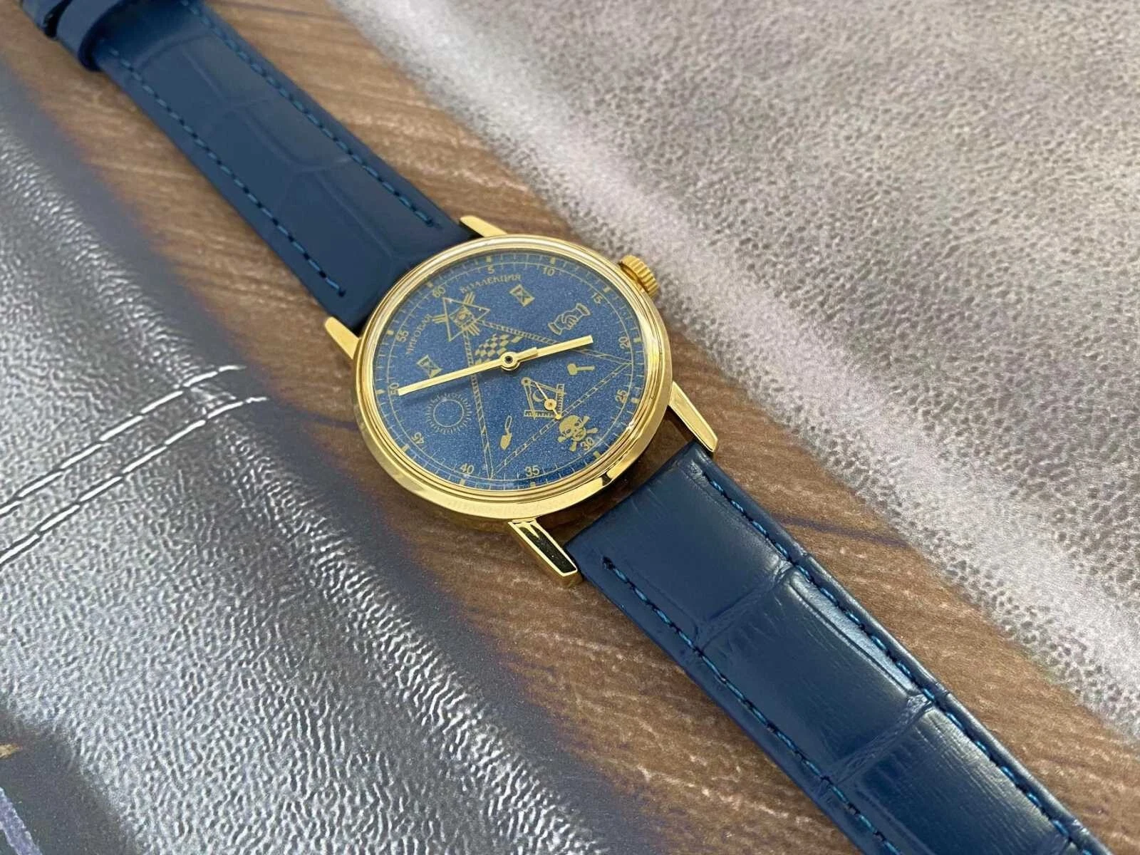 Pobeda Masonic Watch Wrist Blue Dial Strap Leather Men's Soviet Russian 34 mm