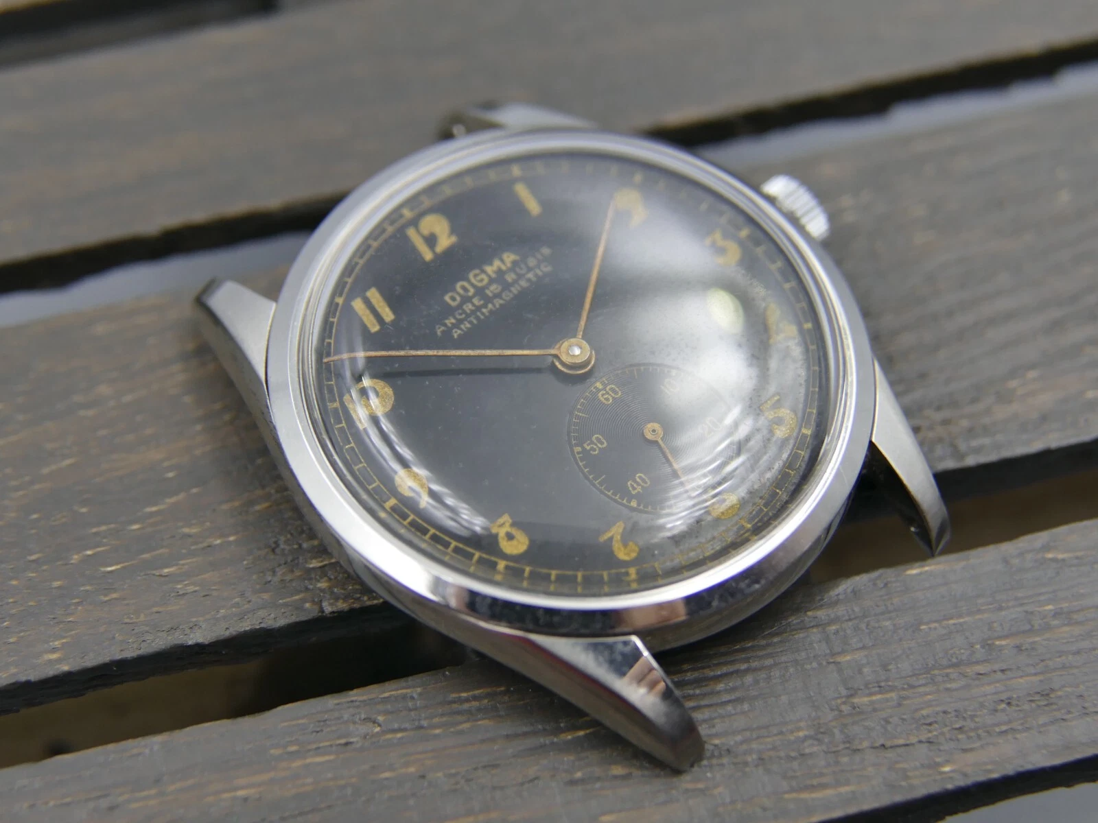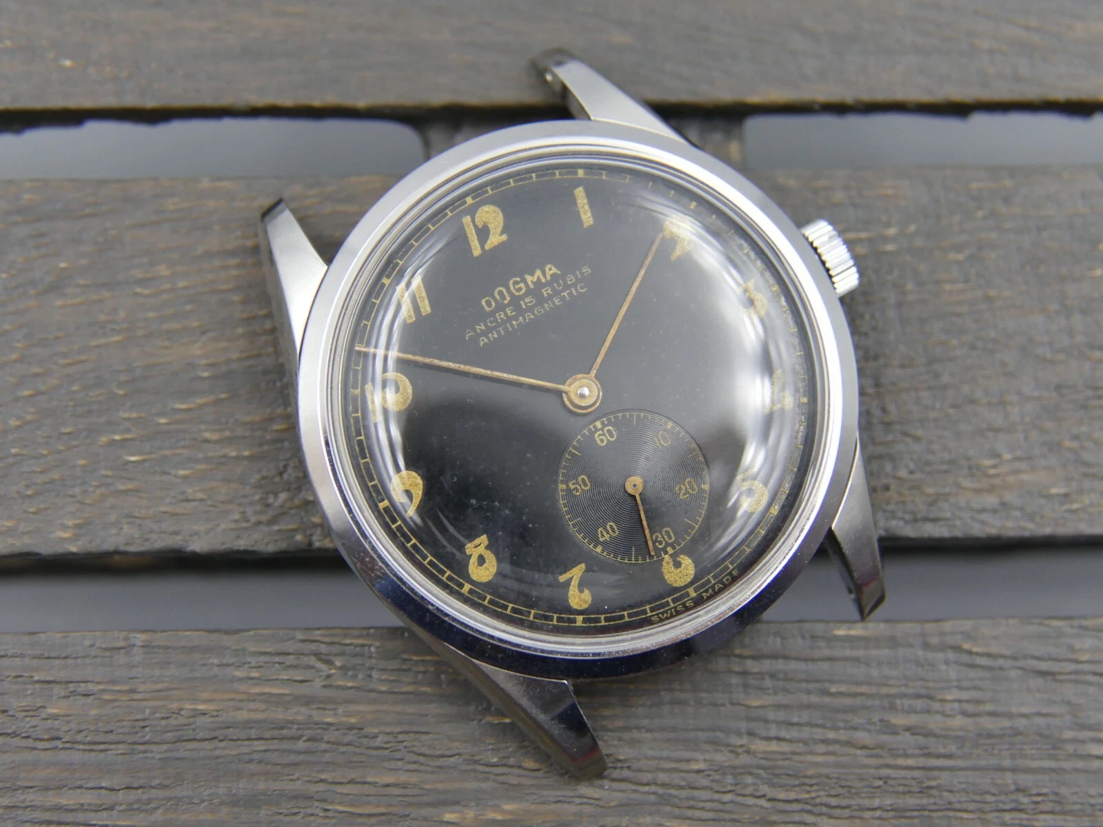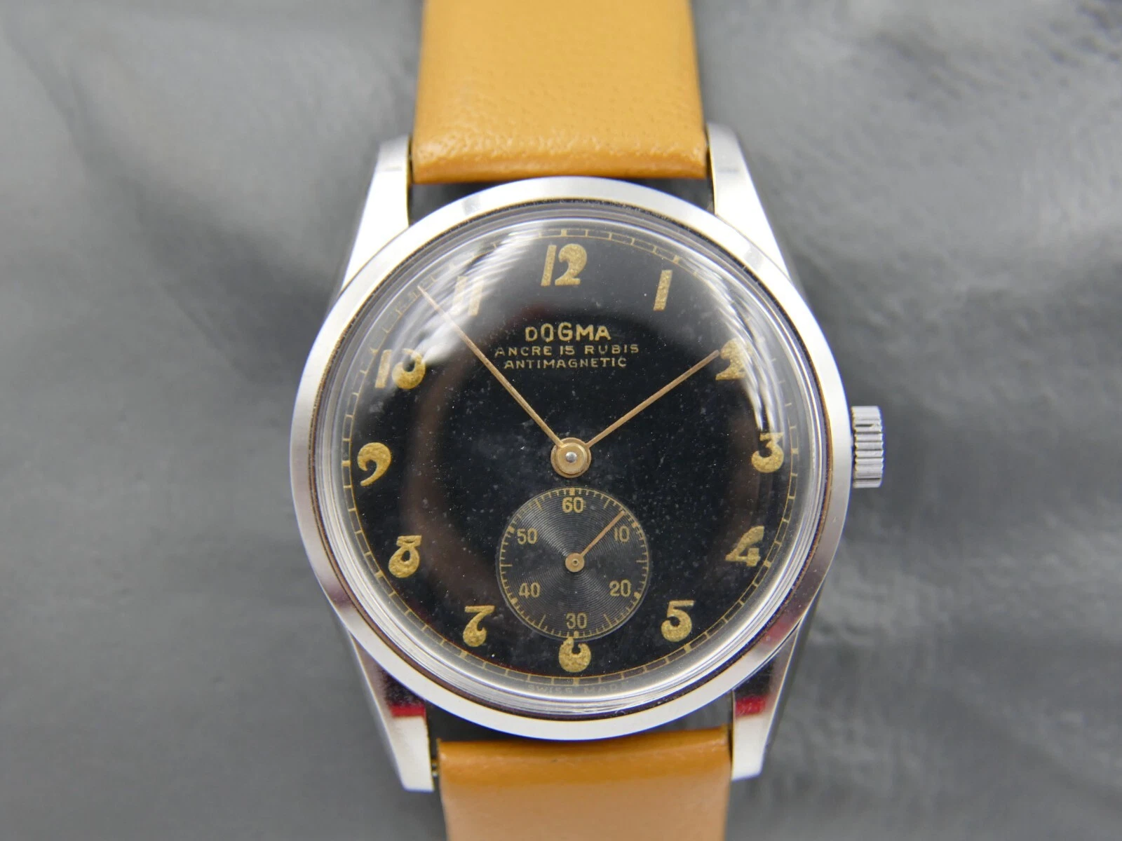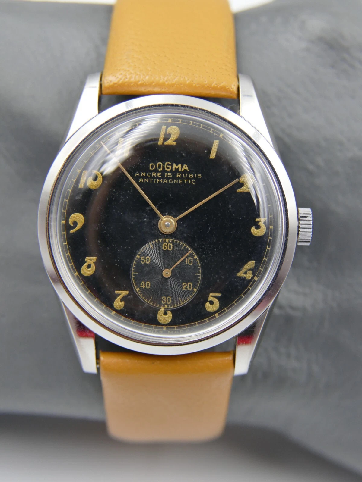 vintage watch mens Dogma hand wind black dial steel case ref 1736 mint 34.5mm