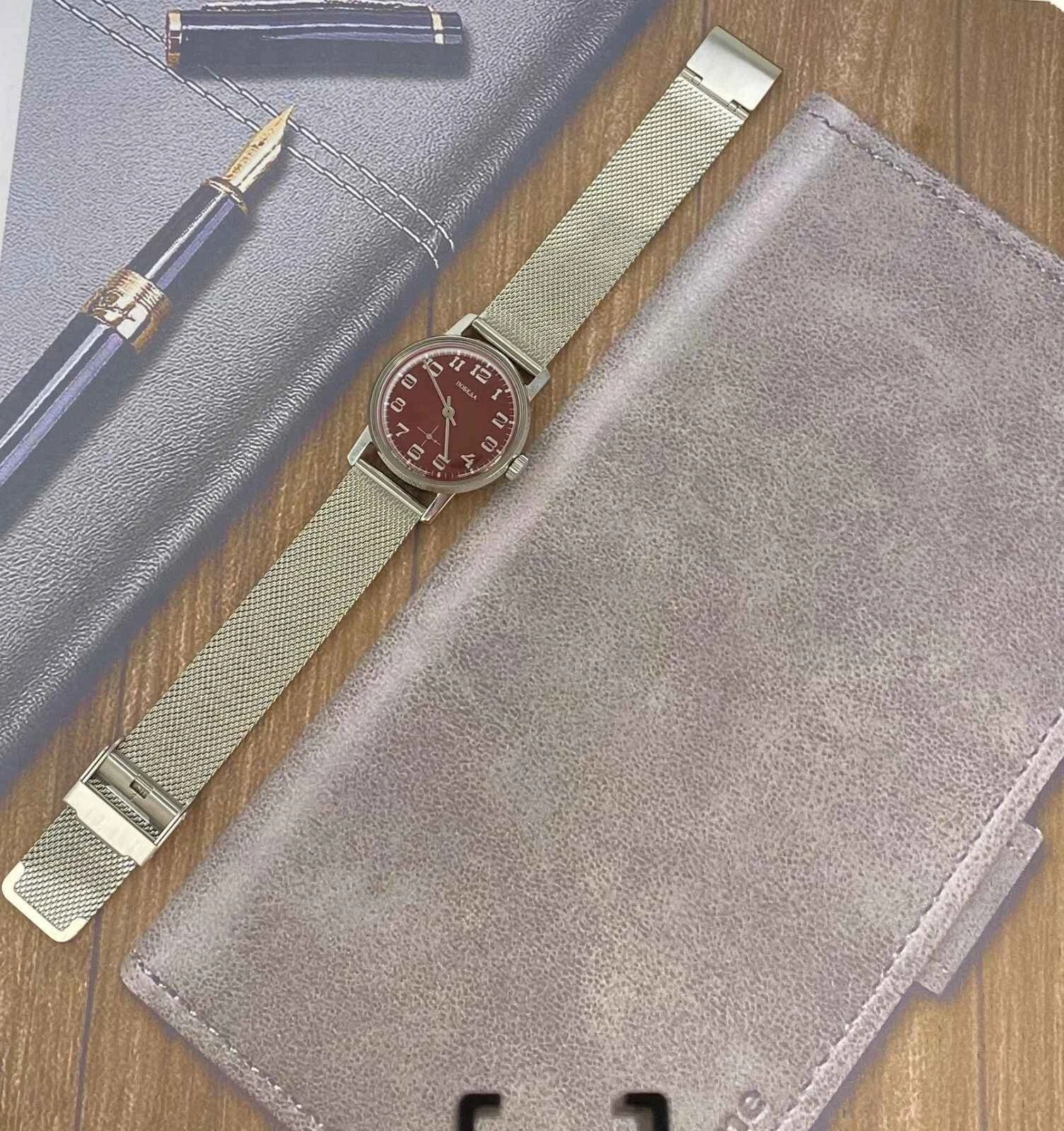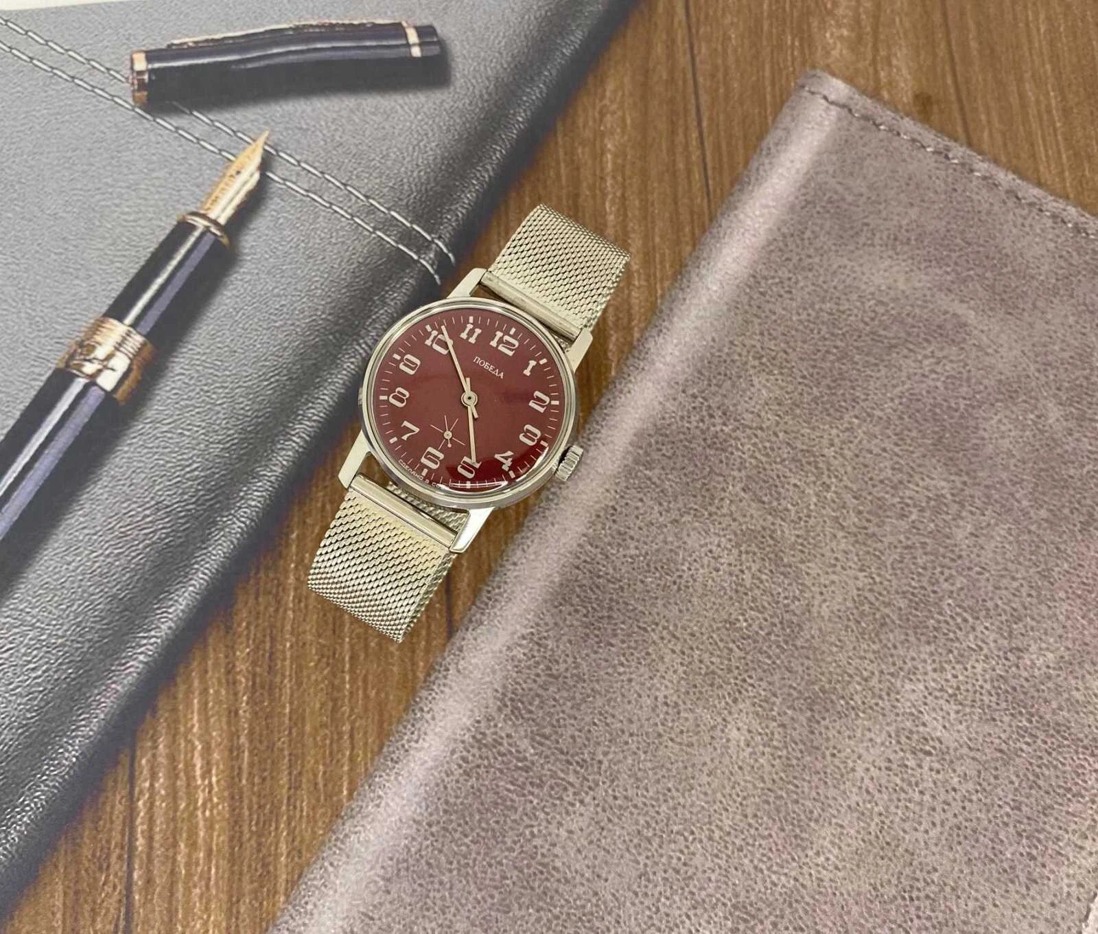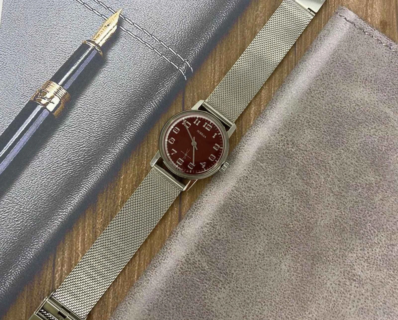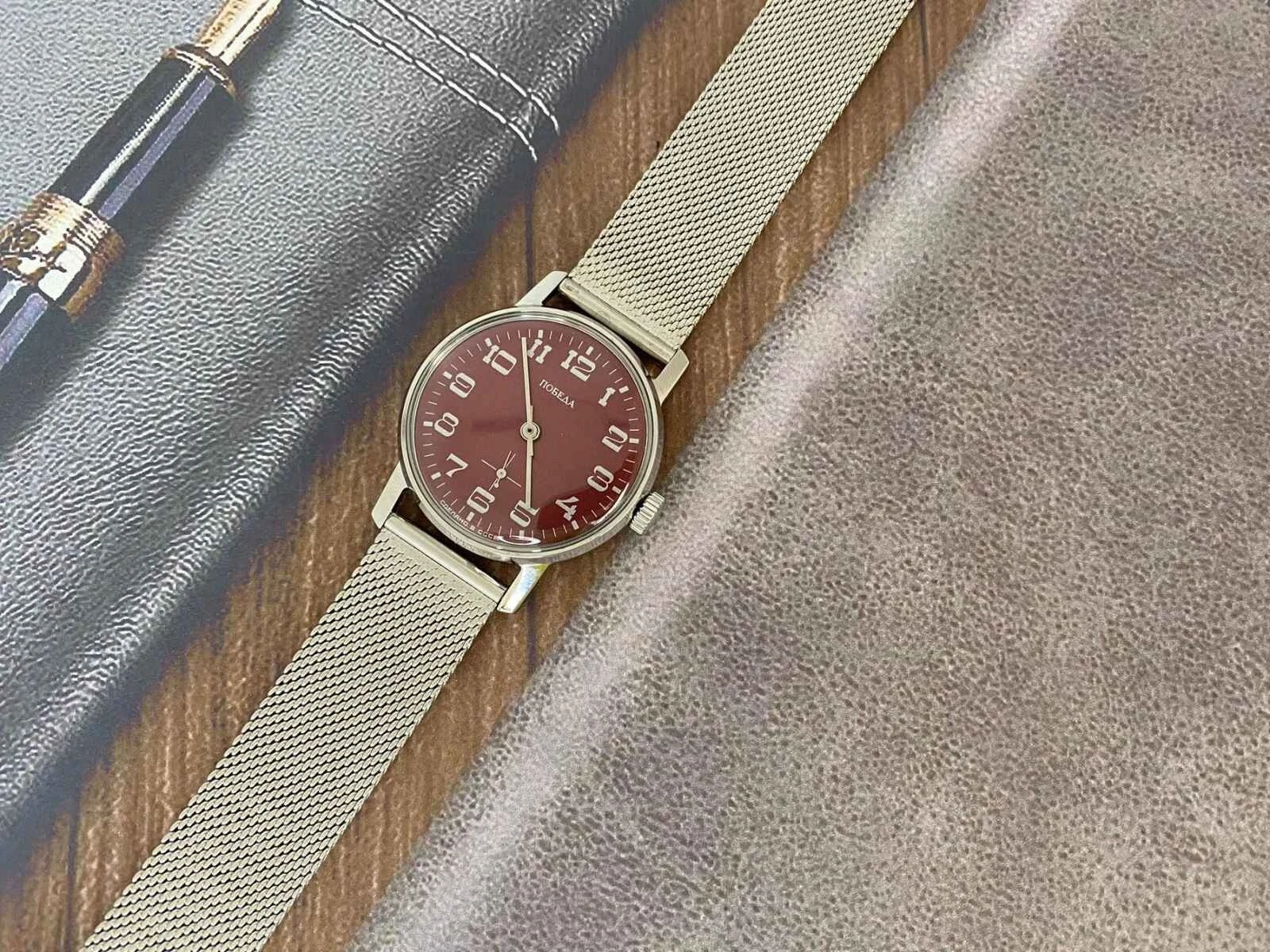 pobeda Watch Mechanical Classic Red Dial Men's Soviet Russian Strap Silver, 35 m