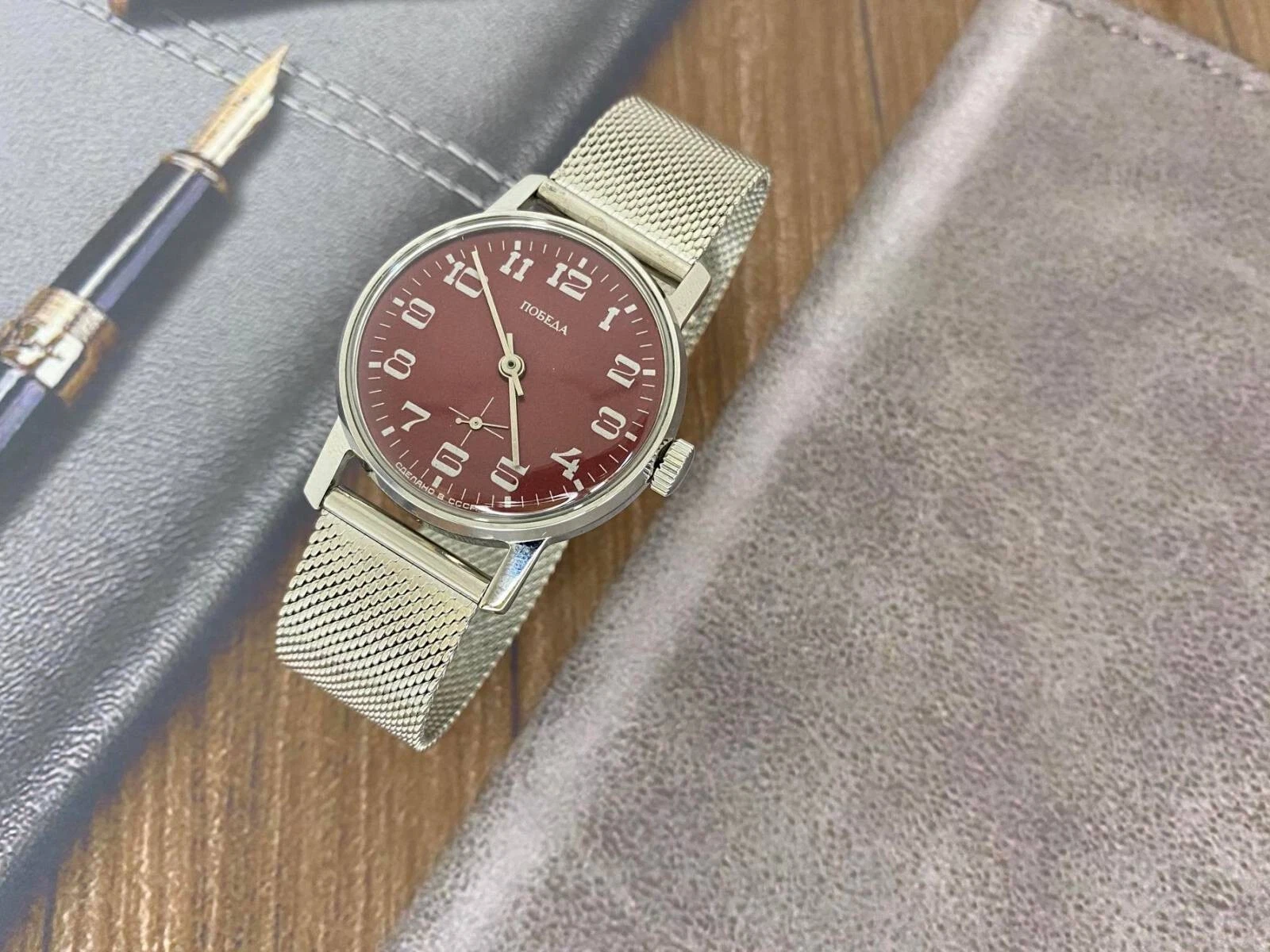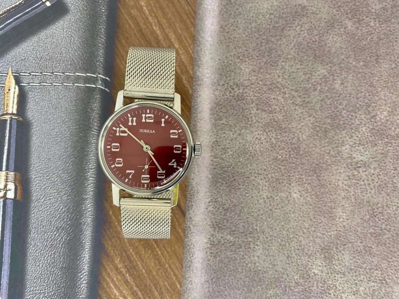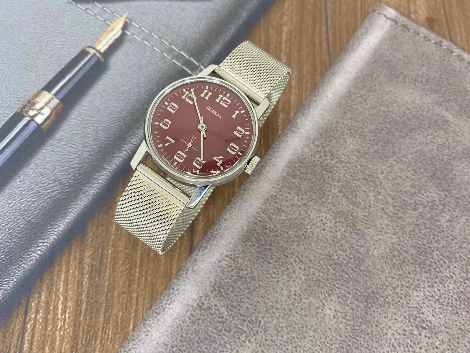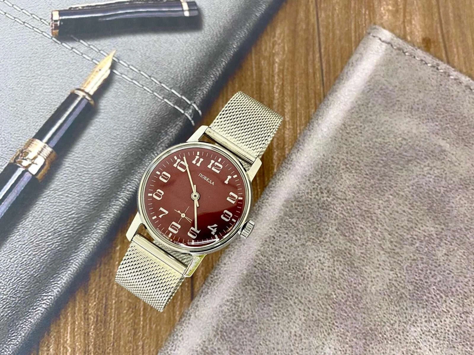 pobeda Watch Mechanical Classic Red Dial Men's Soviet Russian Strap Silver, 35 m