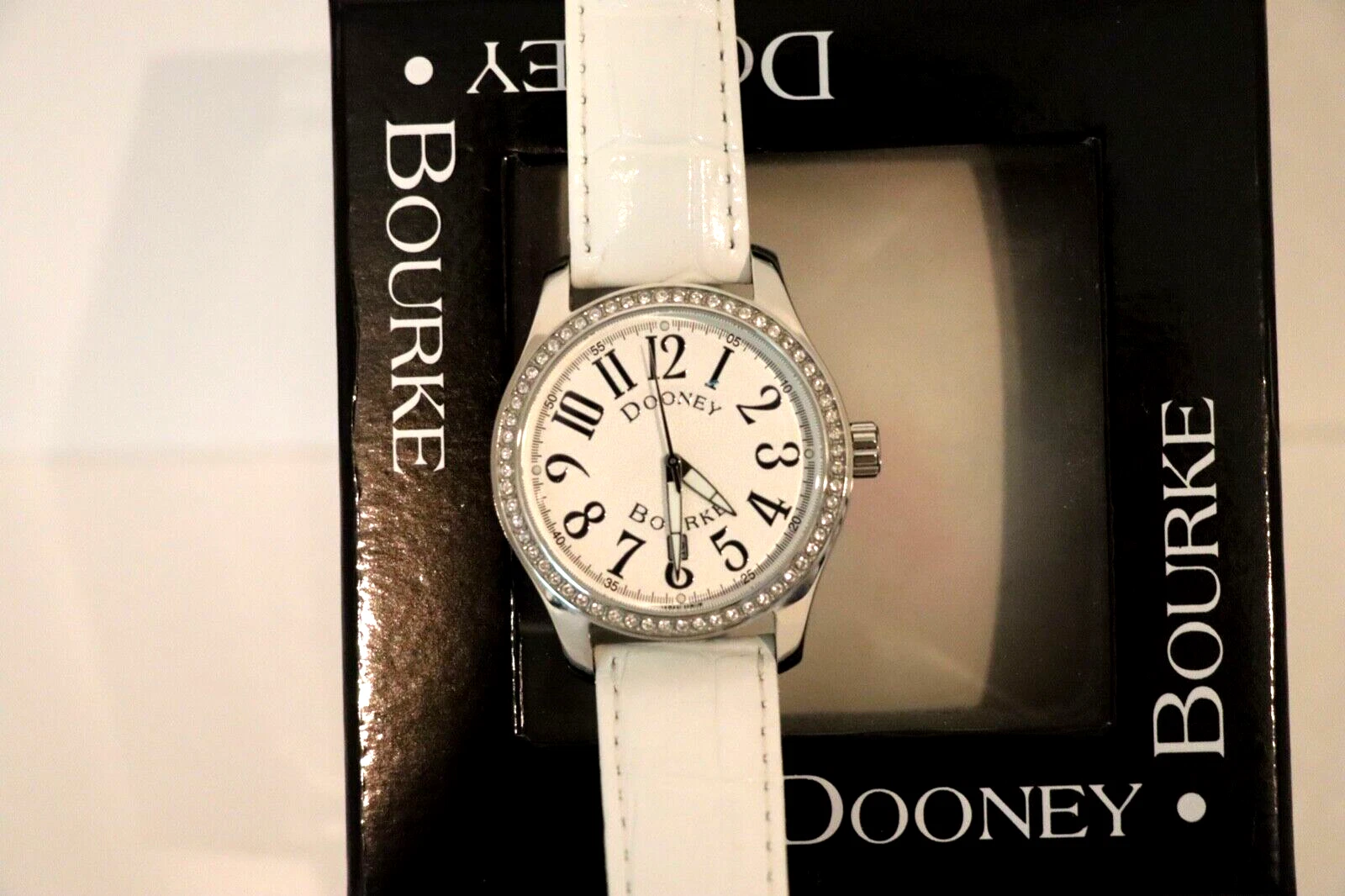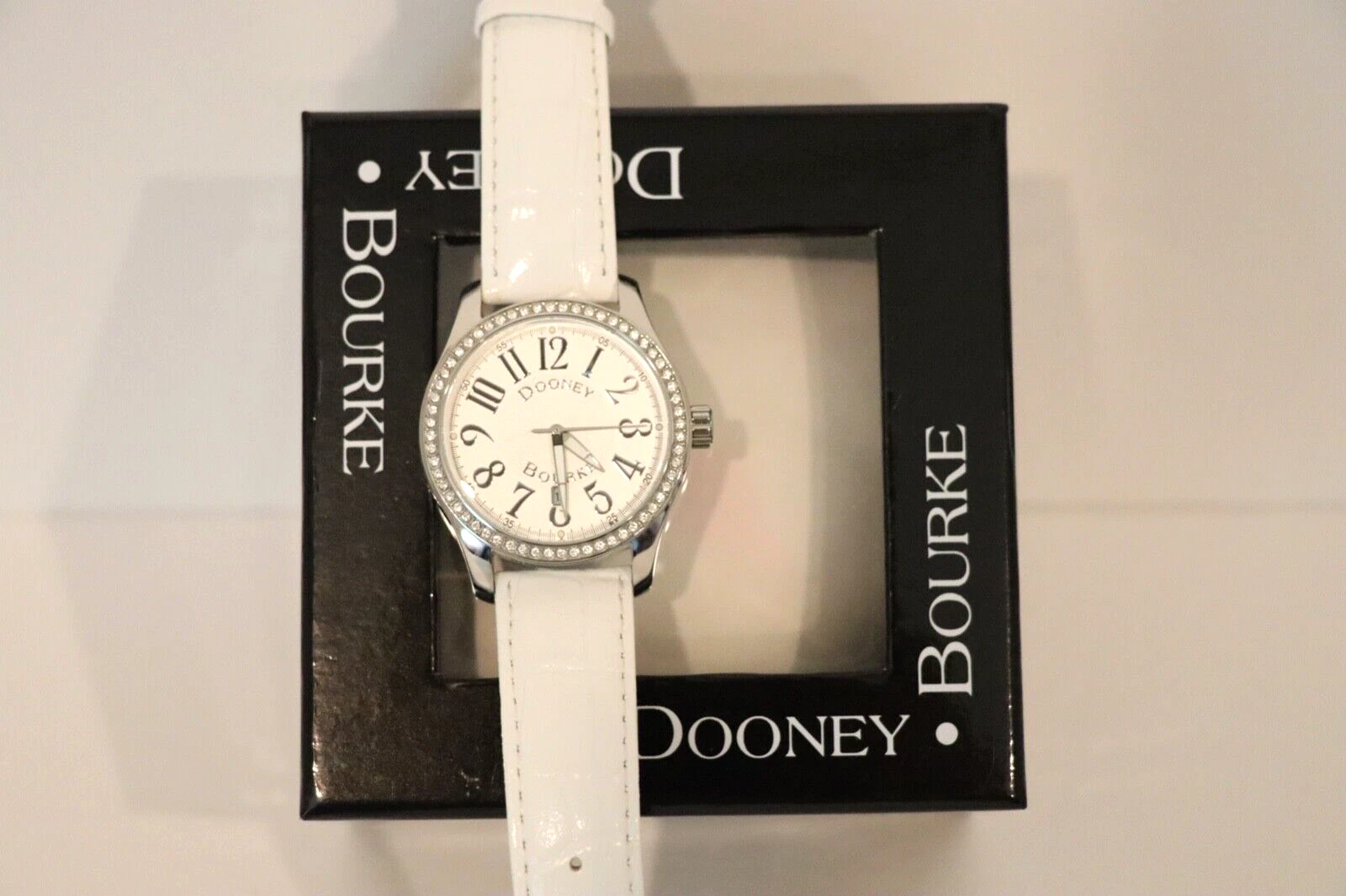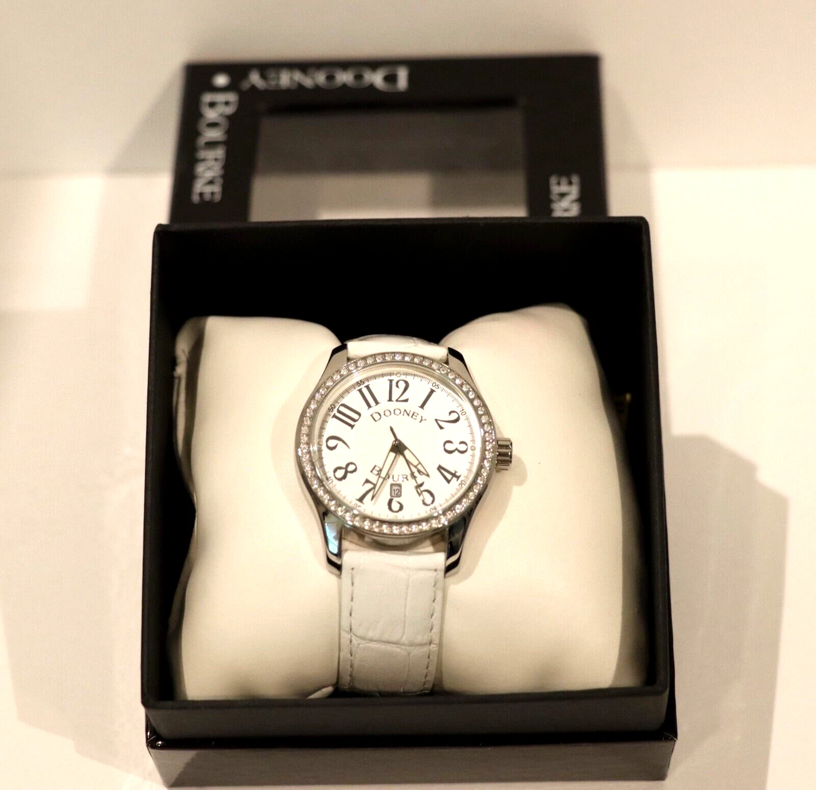 Dooney & Bourke Watch White Women’s Swiss Crystal Rhinestone Bezel Leather Band