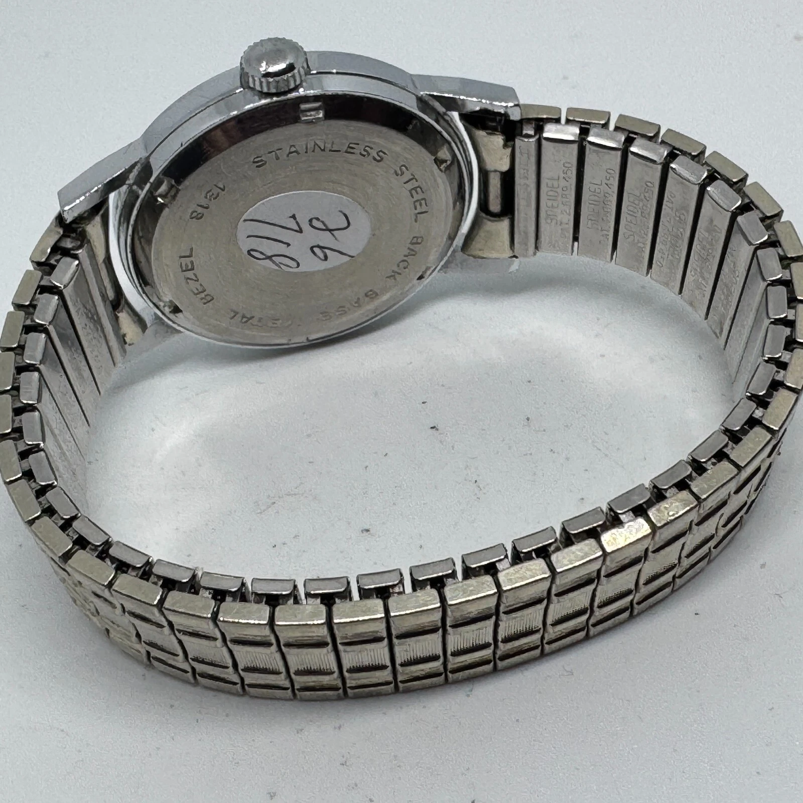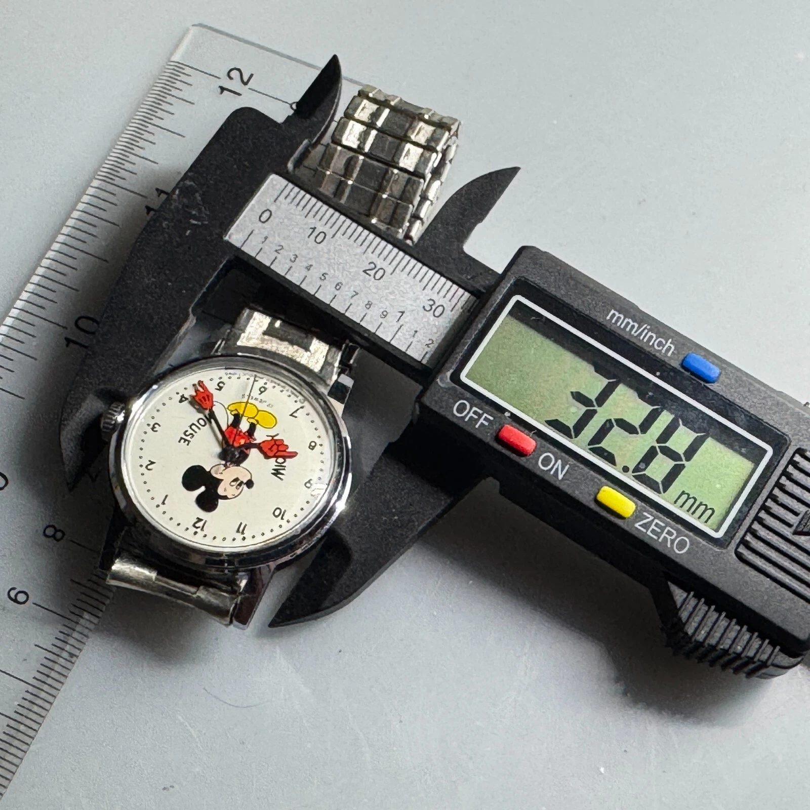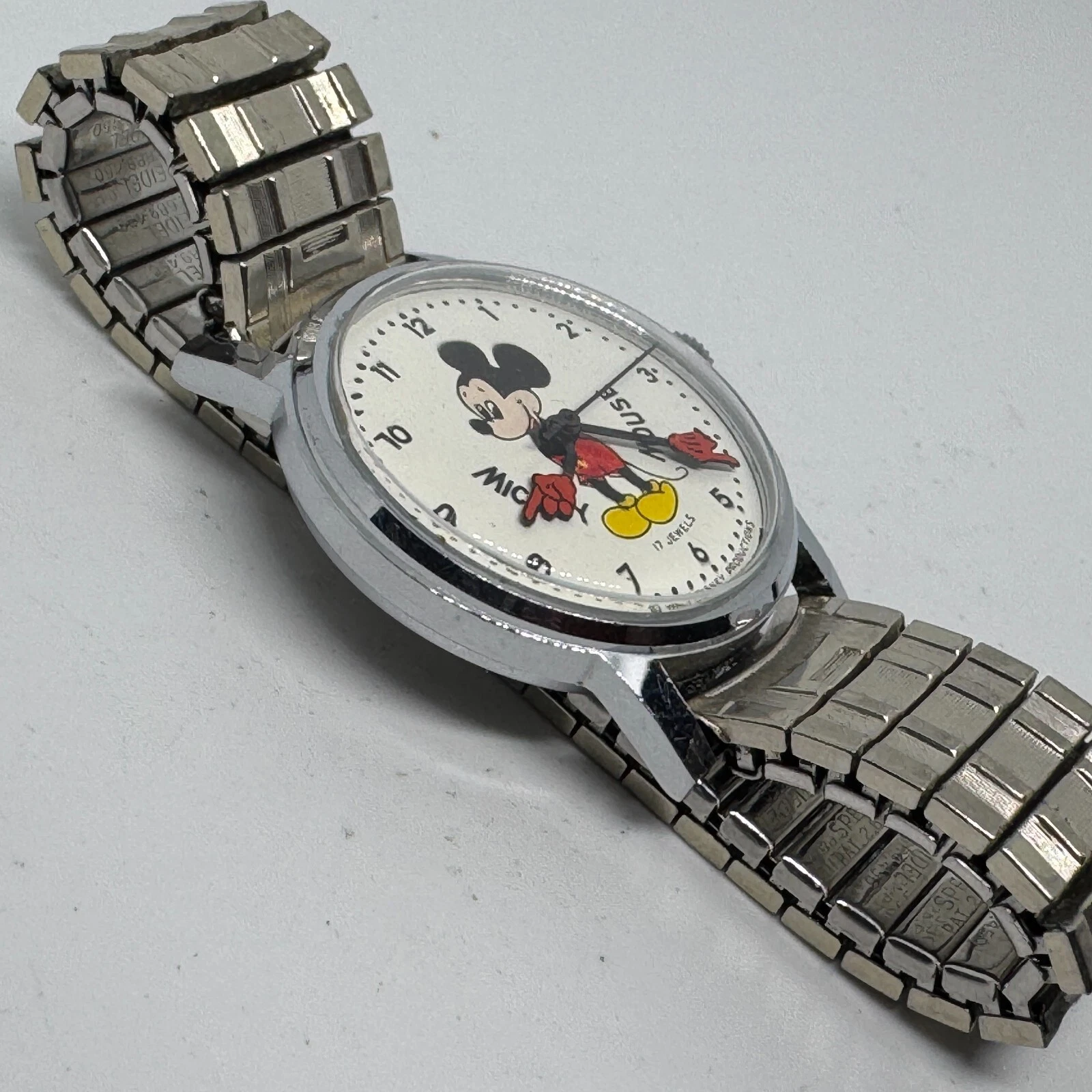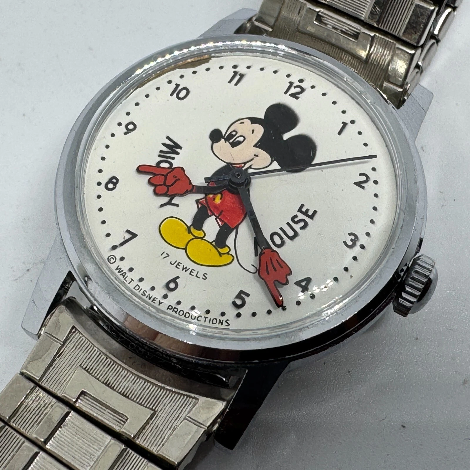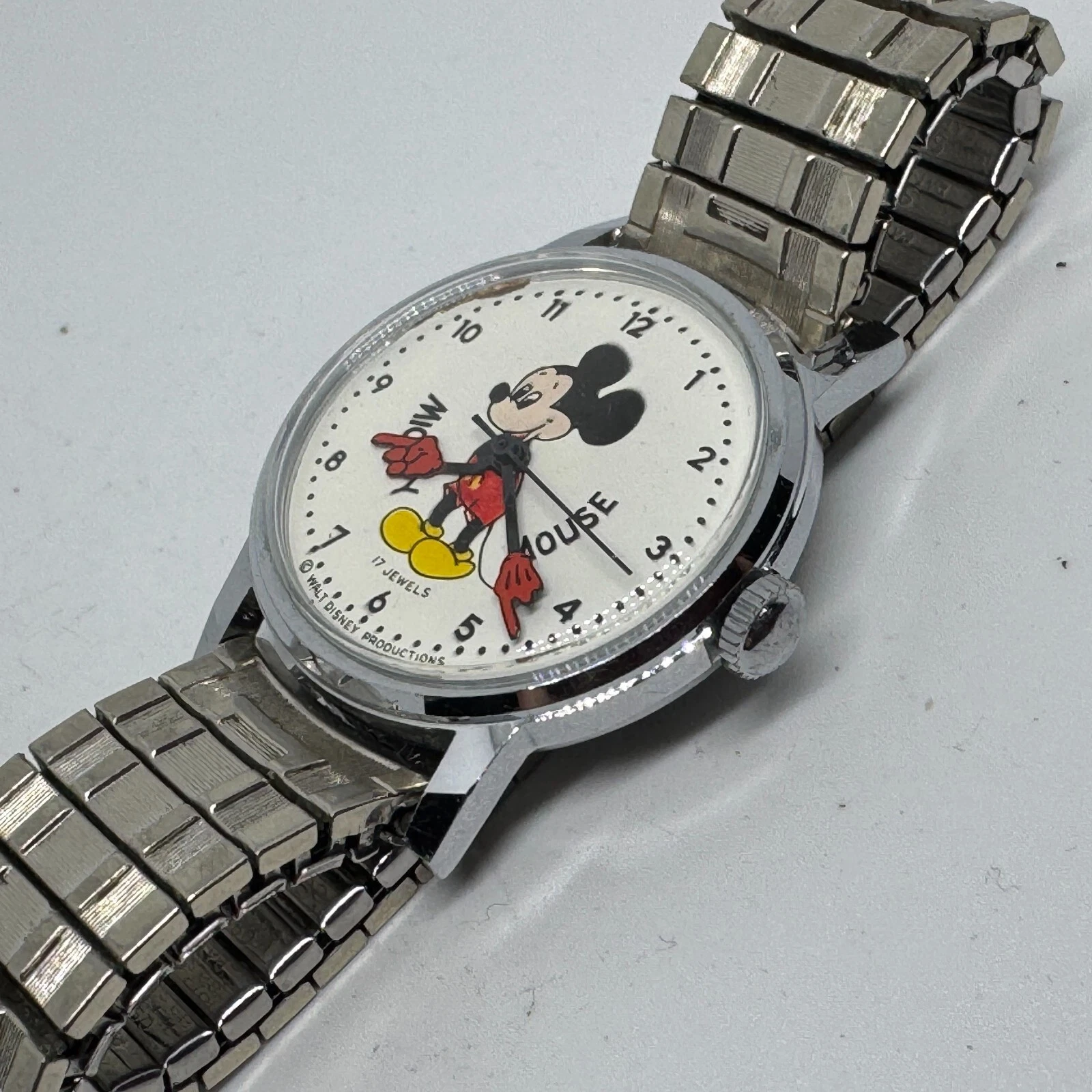 VTG Disney Mickey Hand Wind Mechanical Watch Men 17 Jewels Silver Stretch Band