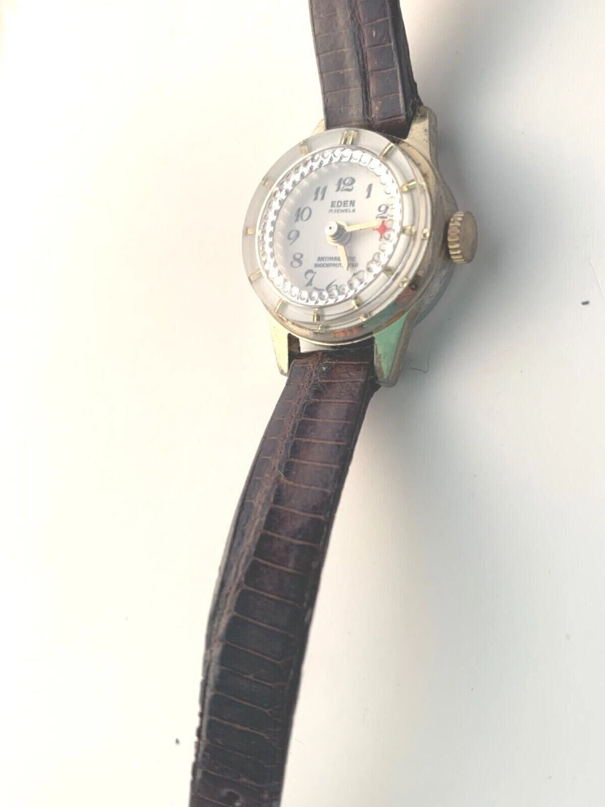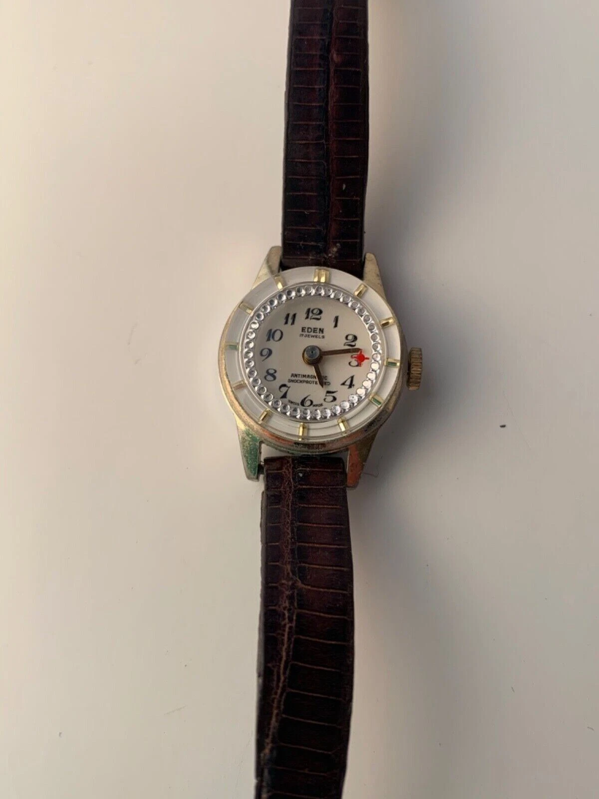 Vtg Watch Eden 17 Jewels Leather Band Swiss Made Antimagnetic Shock Protected