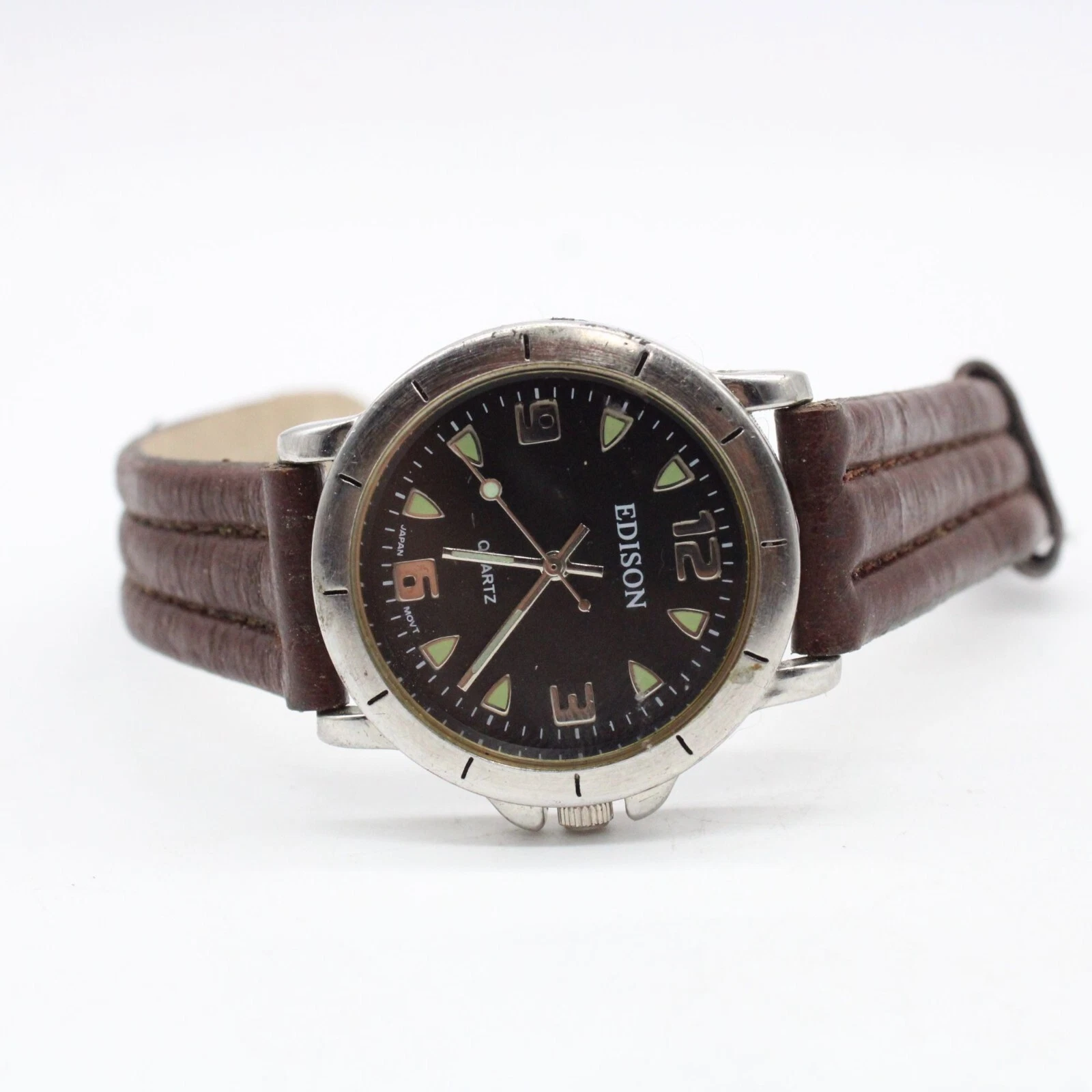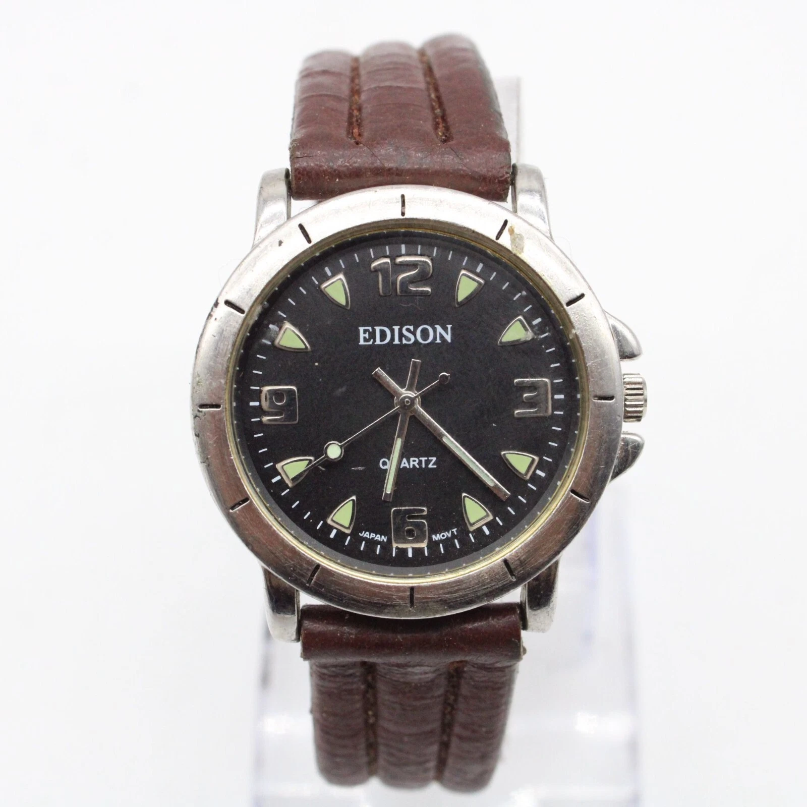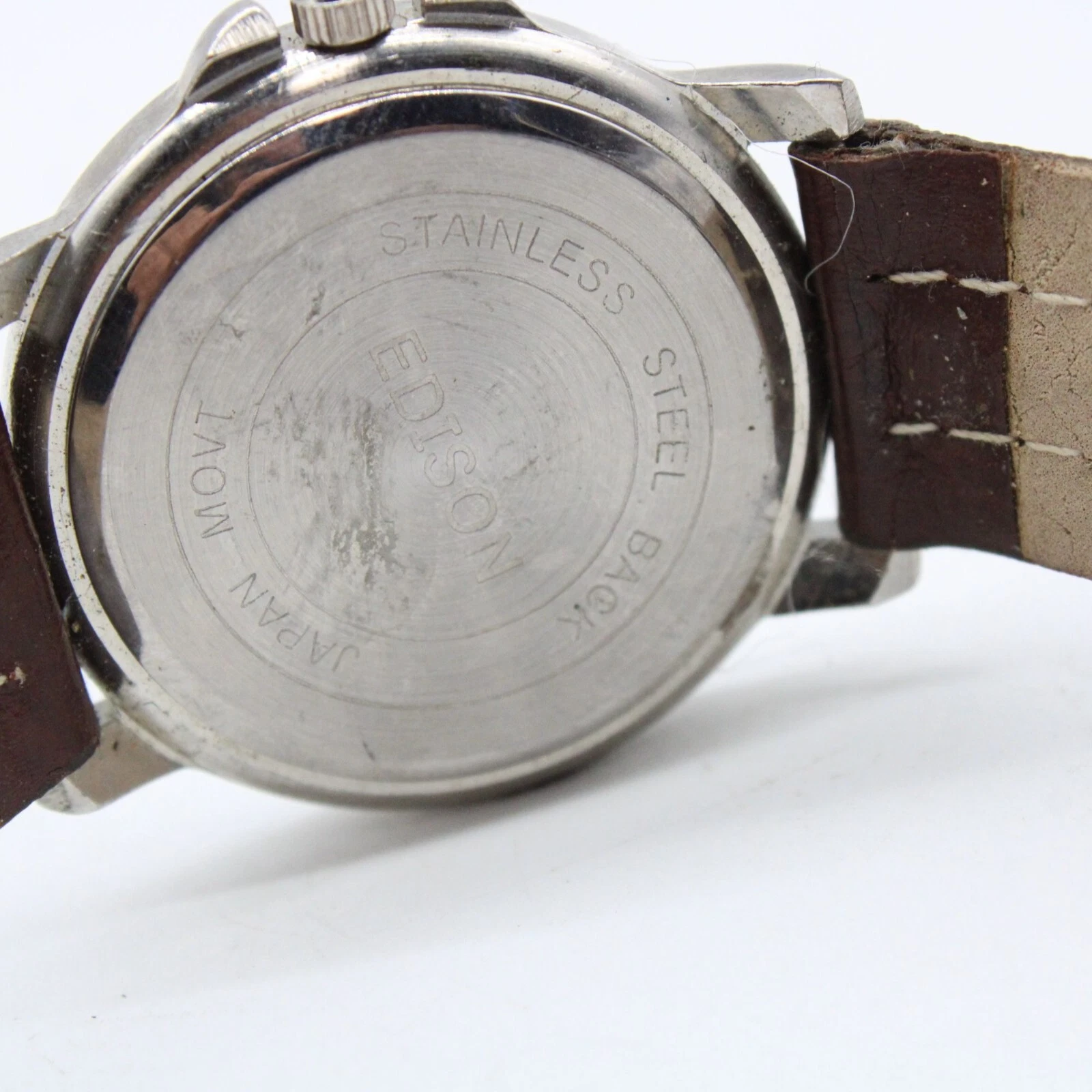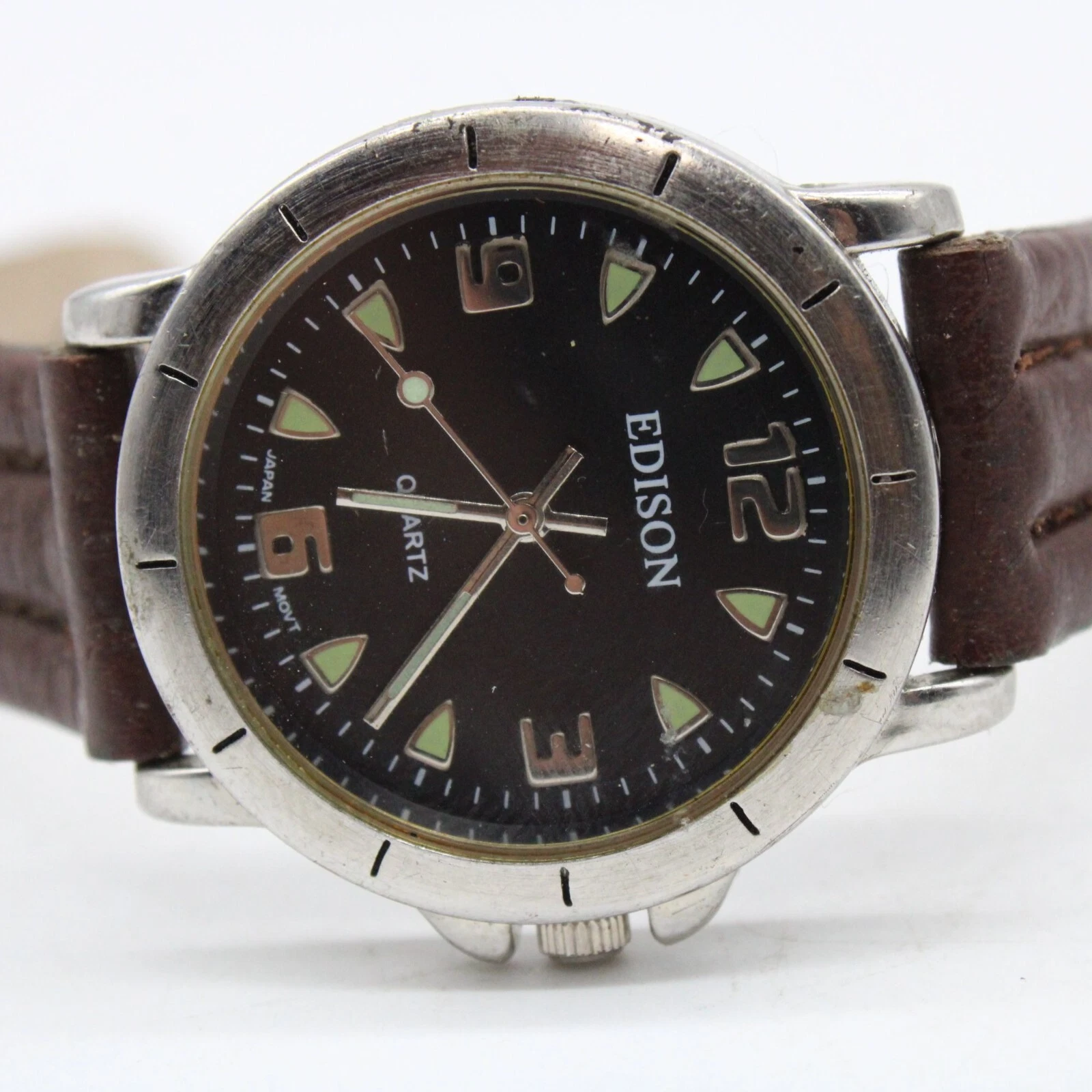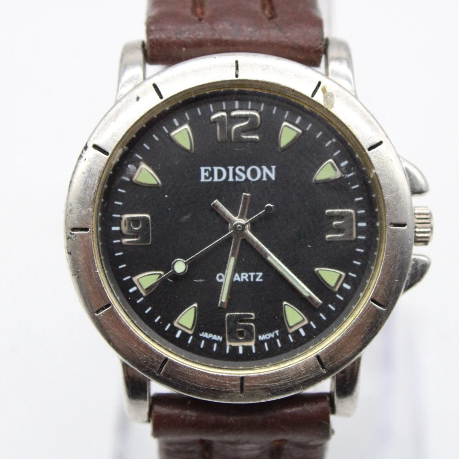 Vintage EDISON Watch Mens Silver Tone Stainless Steel Classic Black Quartz Dial