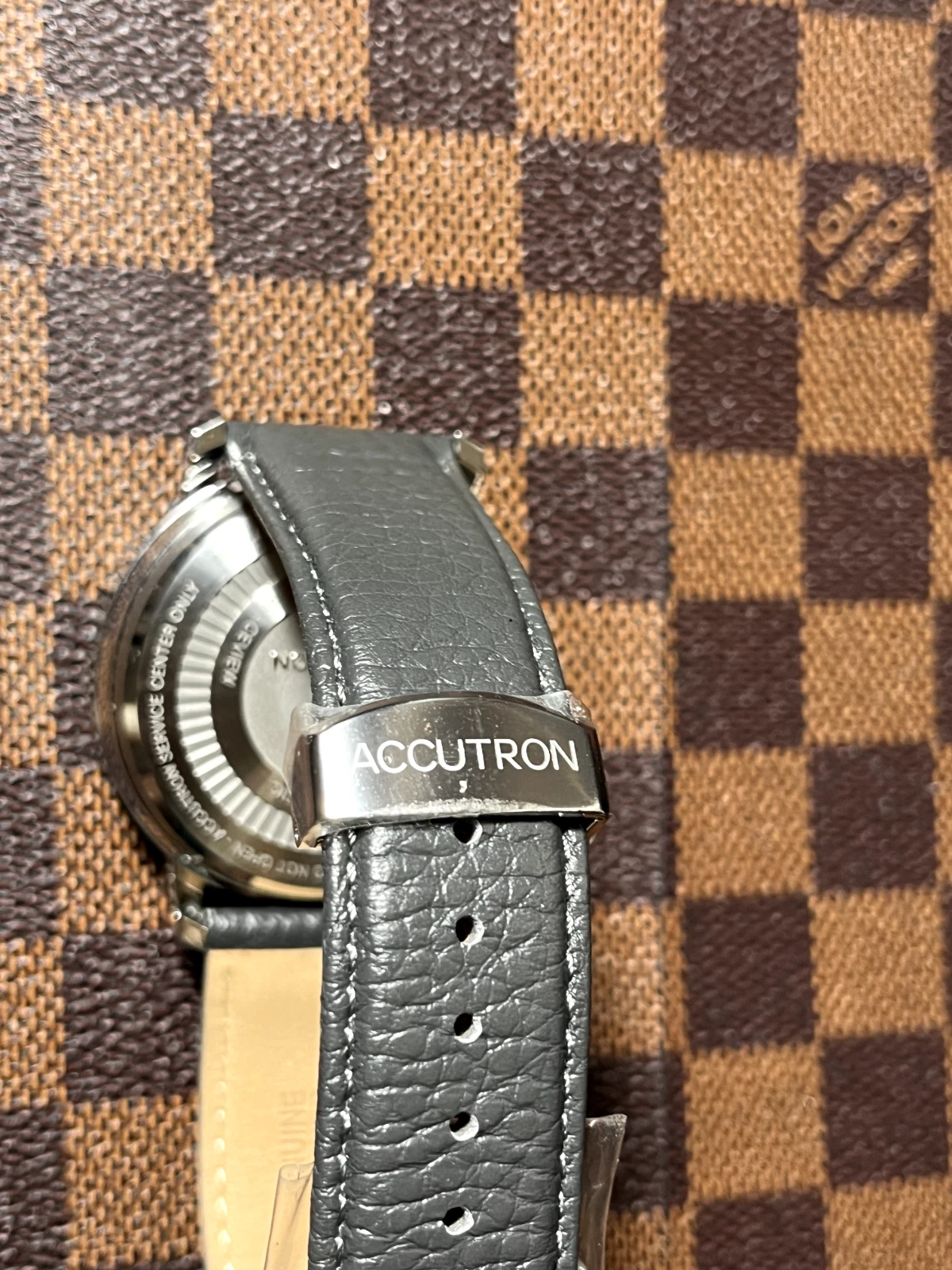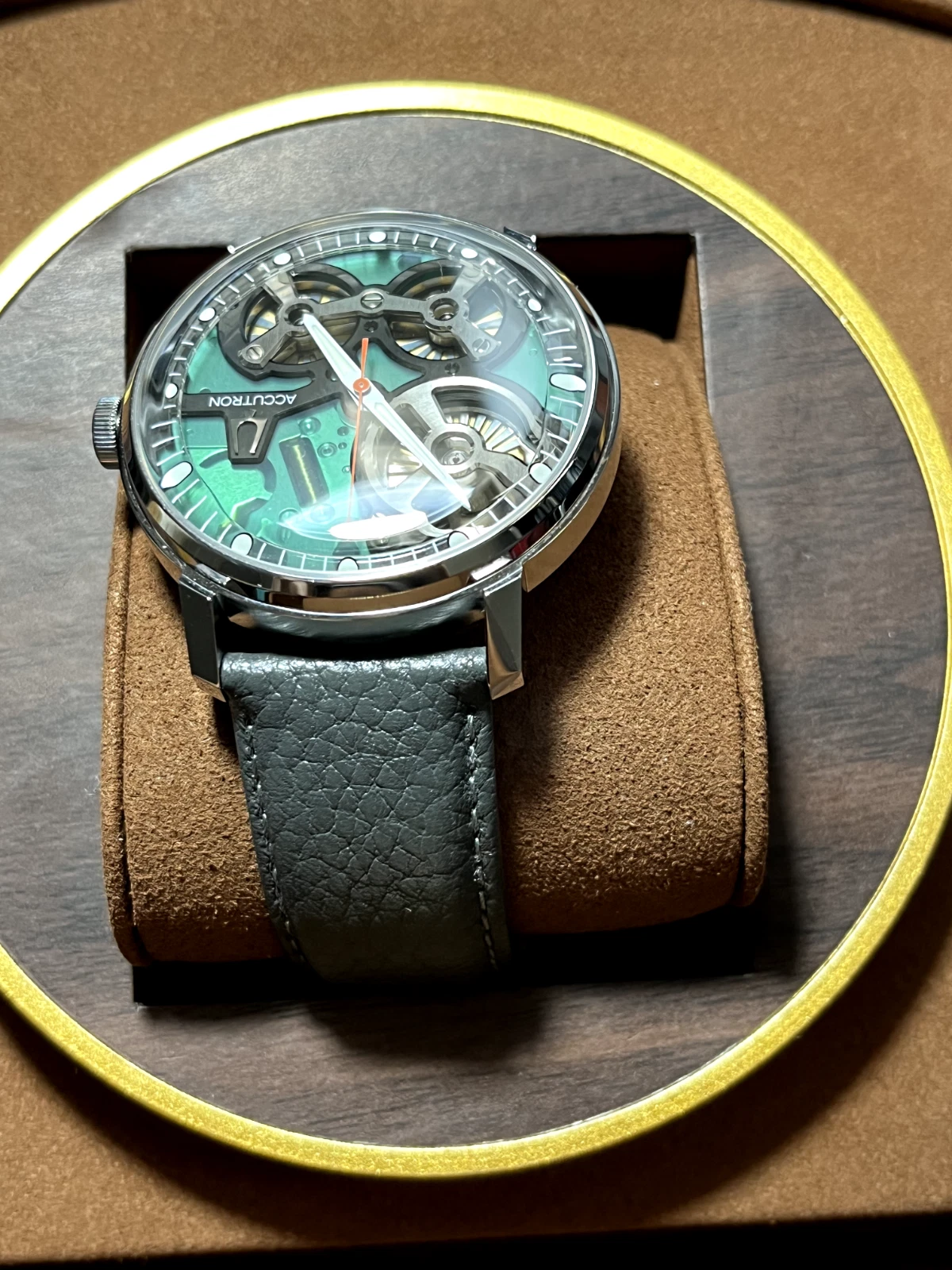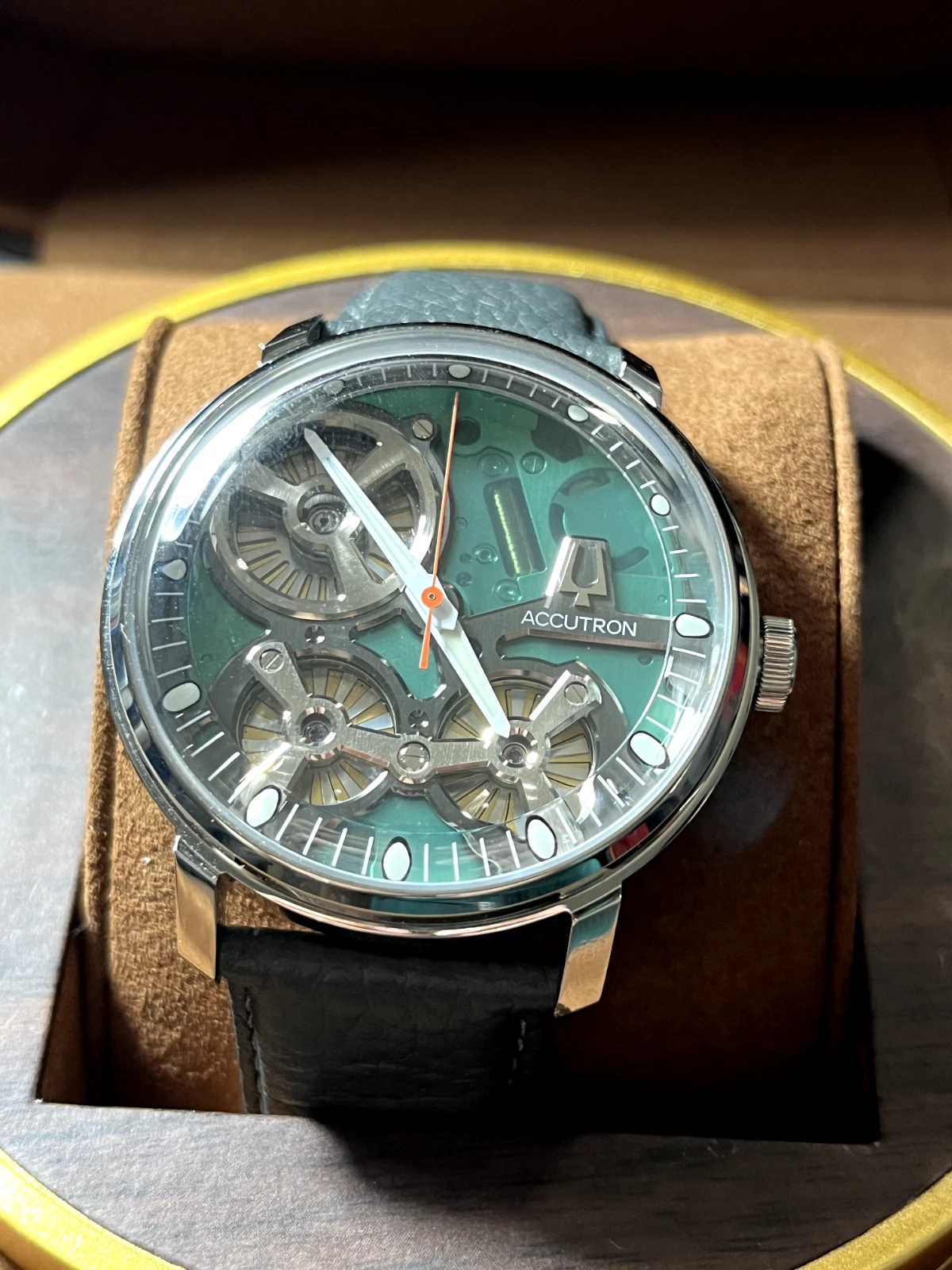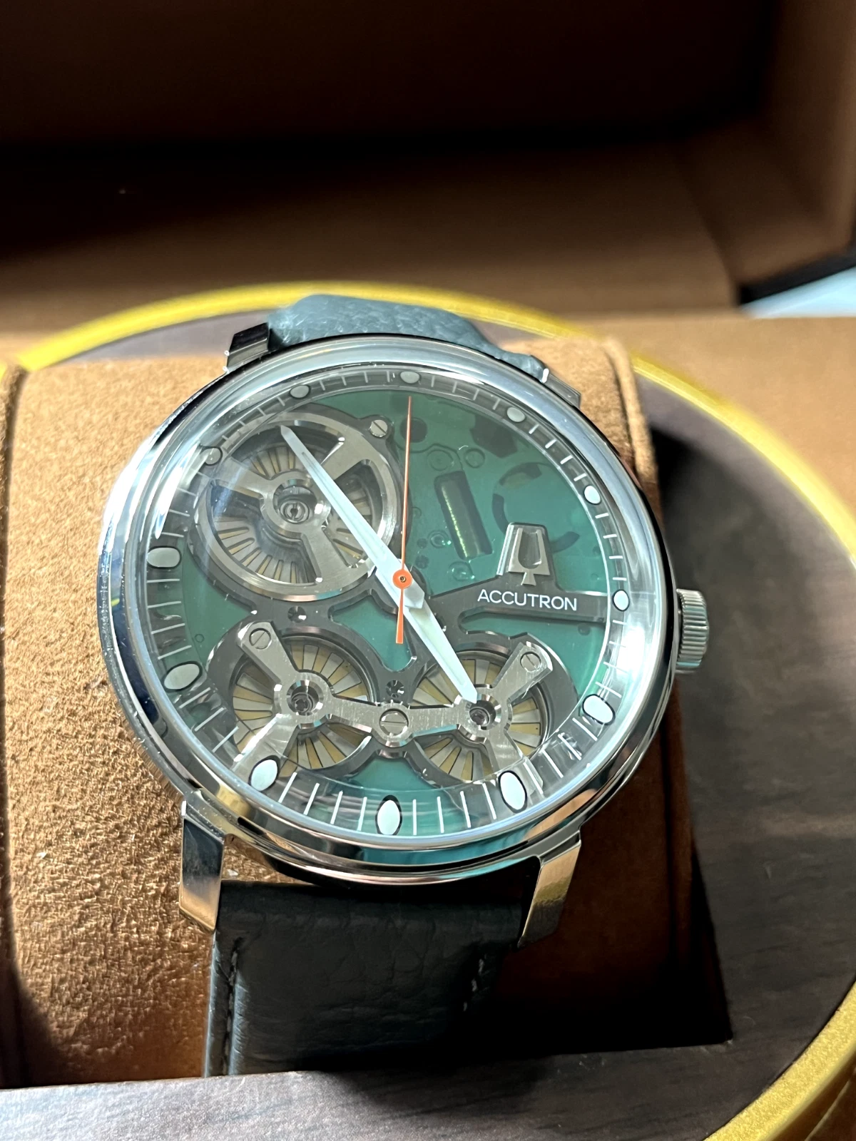 New Accutron Spaceview 2020 Watch with Tag and Box Gray Leather, Green Dial..