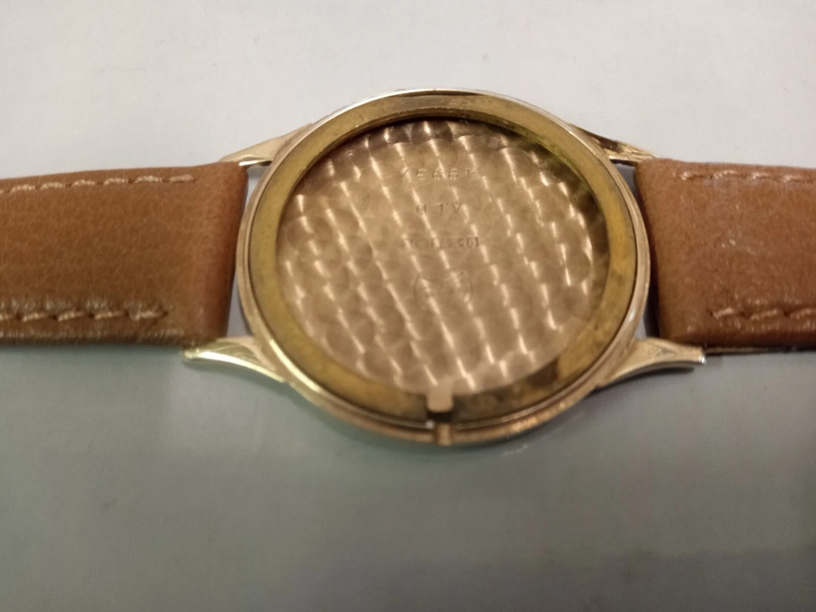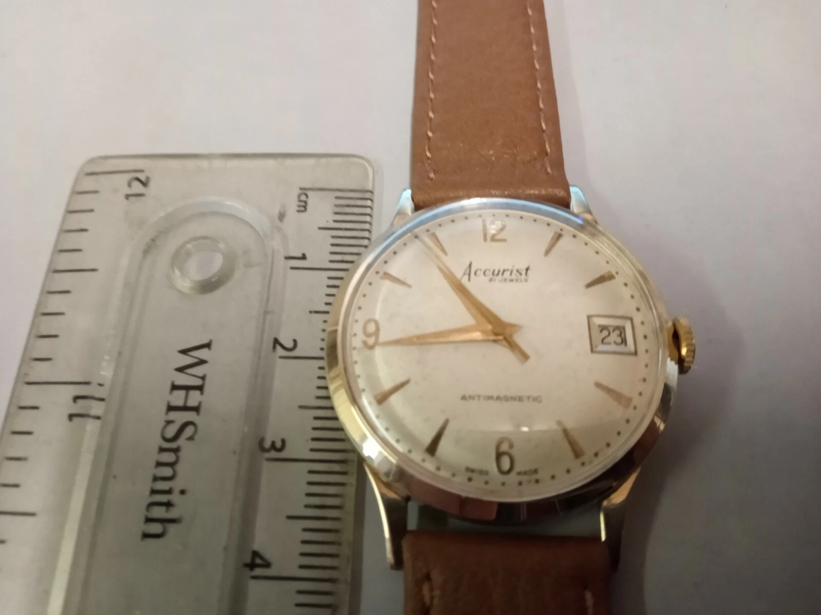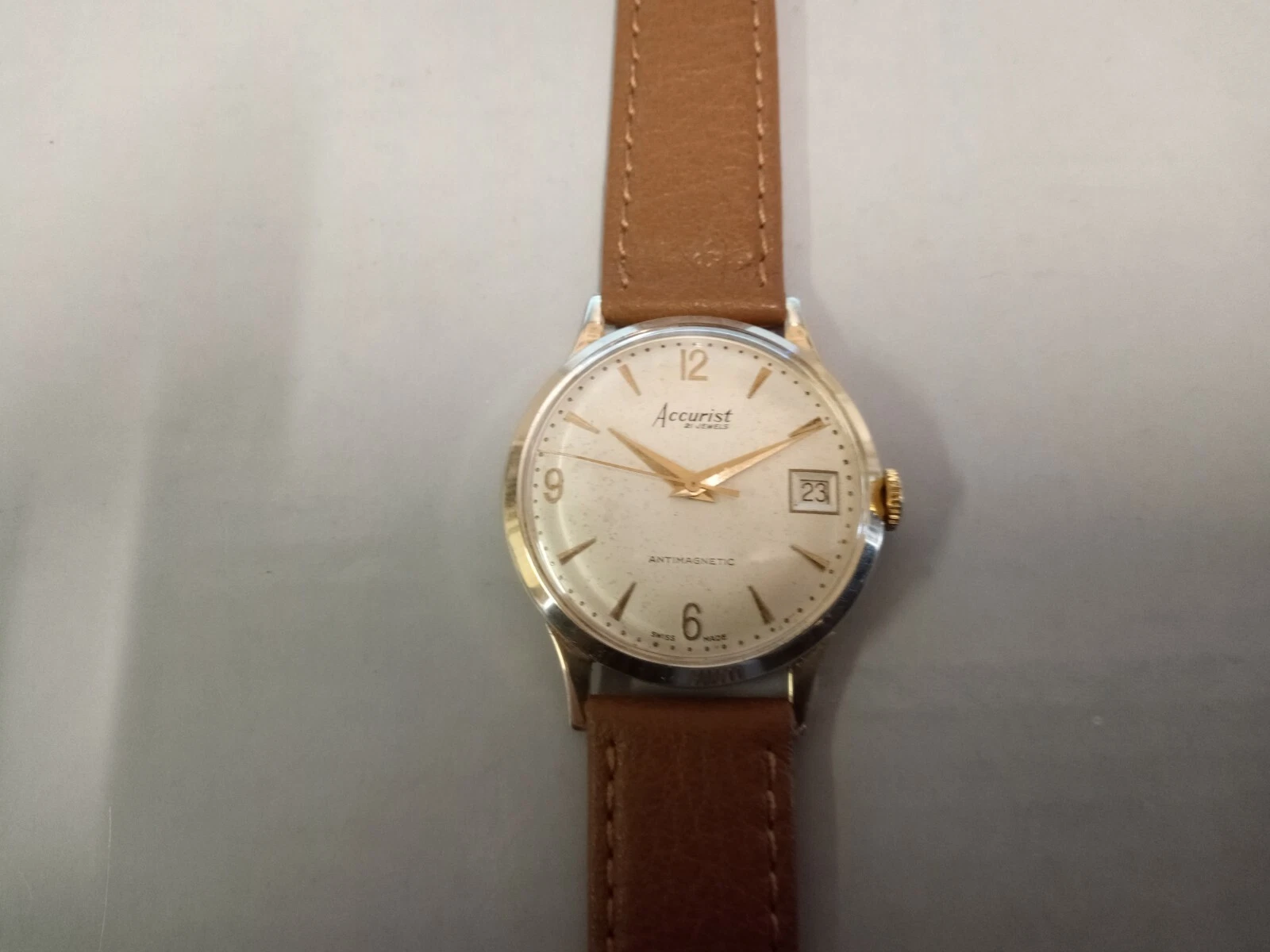 Gent's Accurist 9 carat gold mechanical strap watch on a leather strap.