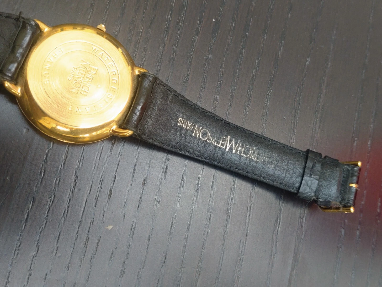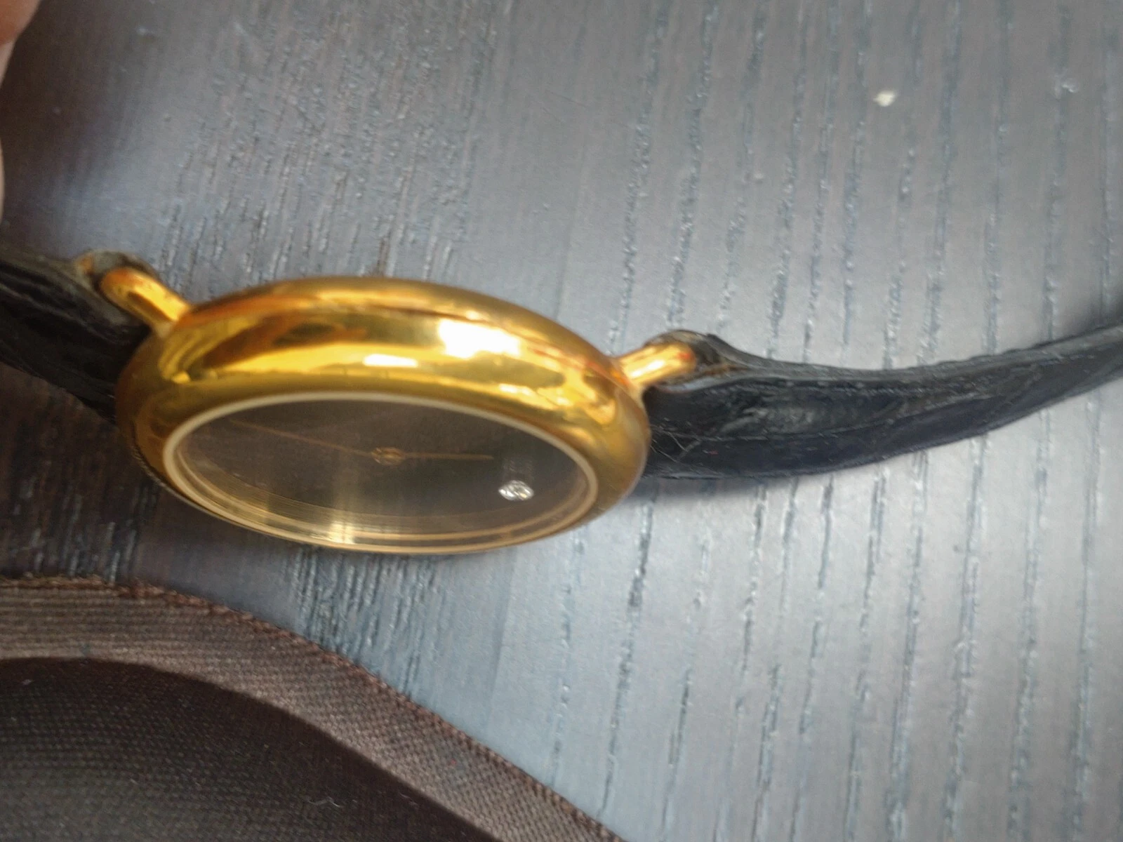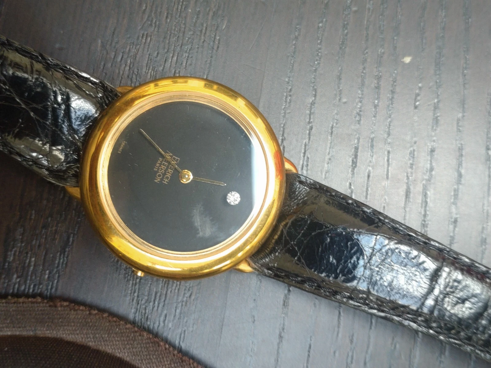 Emerich Meerson Mens watch, Black Leather Strap Black Face Gold Bezel & Diamond