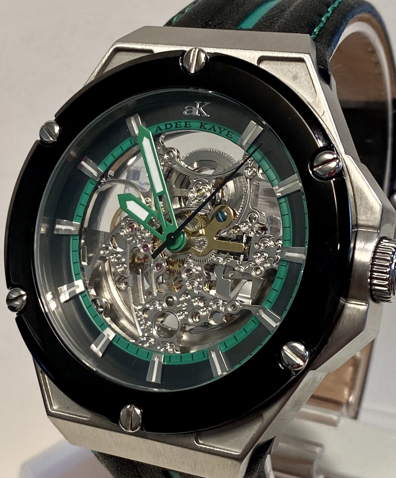 50mm Green Skeleton Silvertone Automatic Black Strap ADEE KAYE Dress Watches