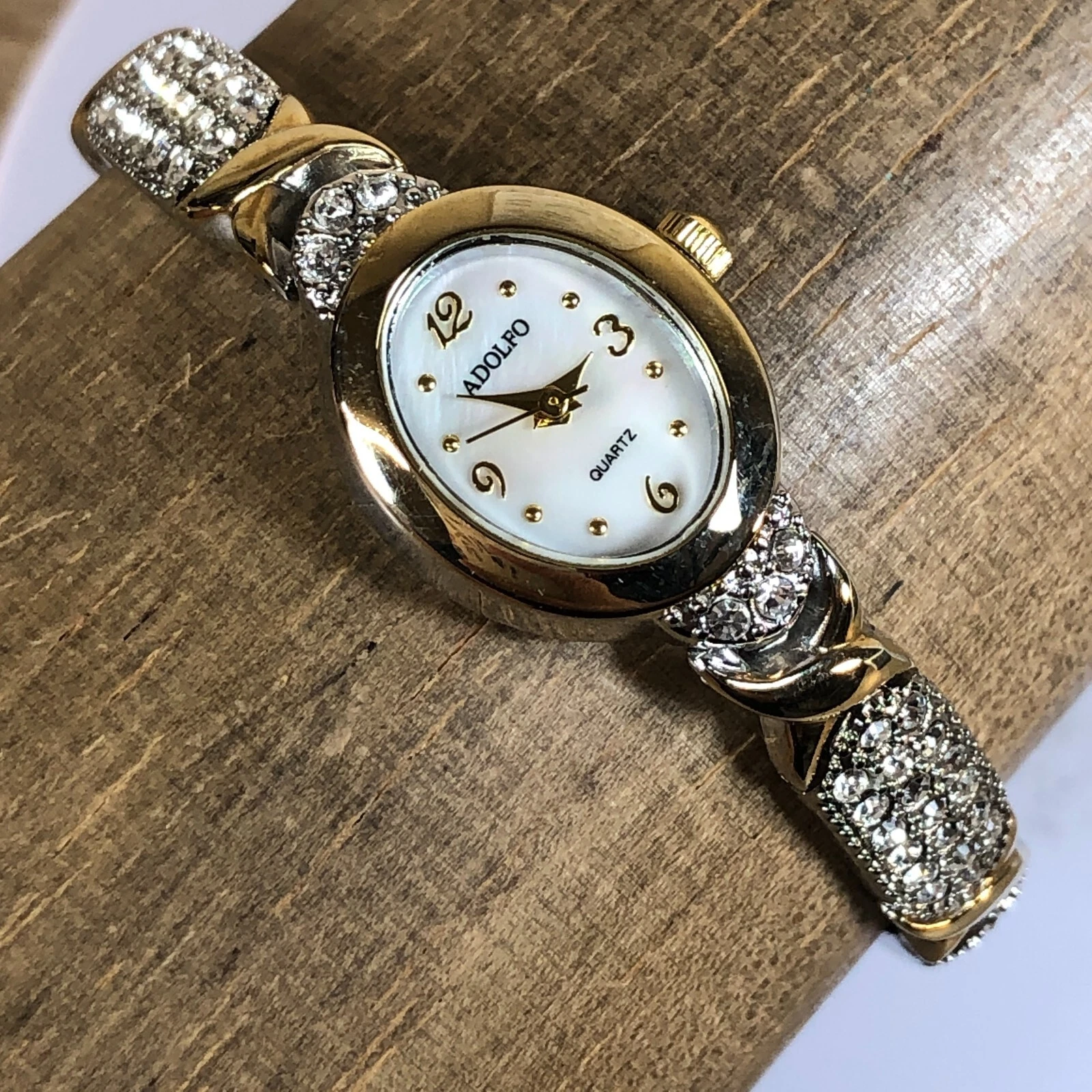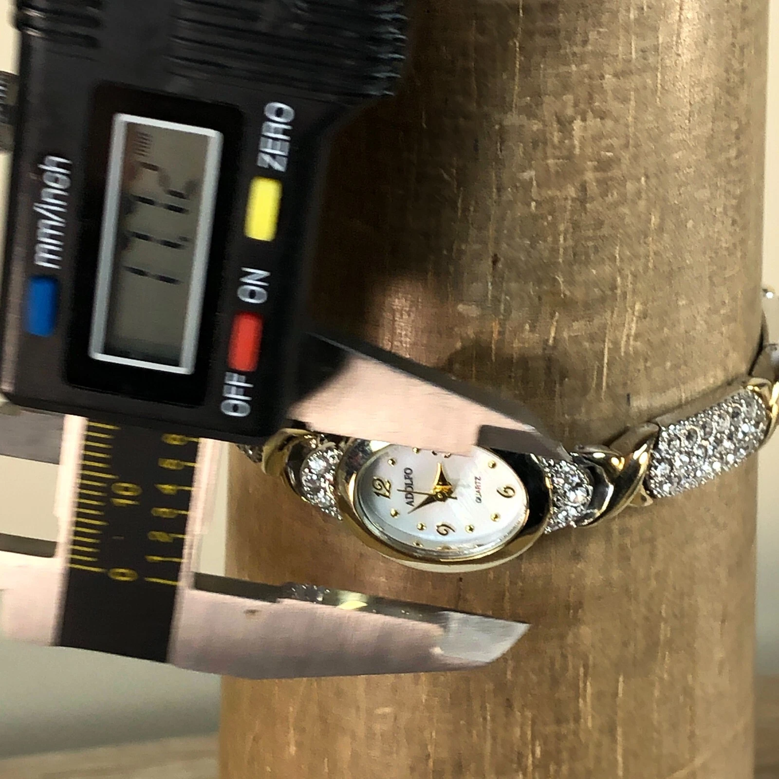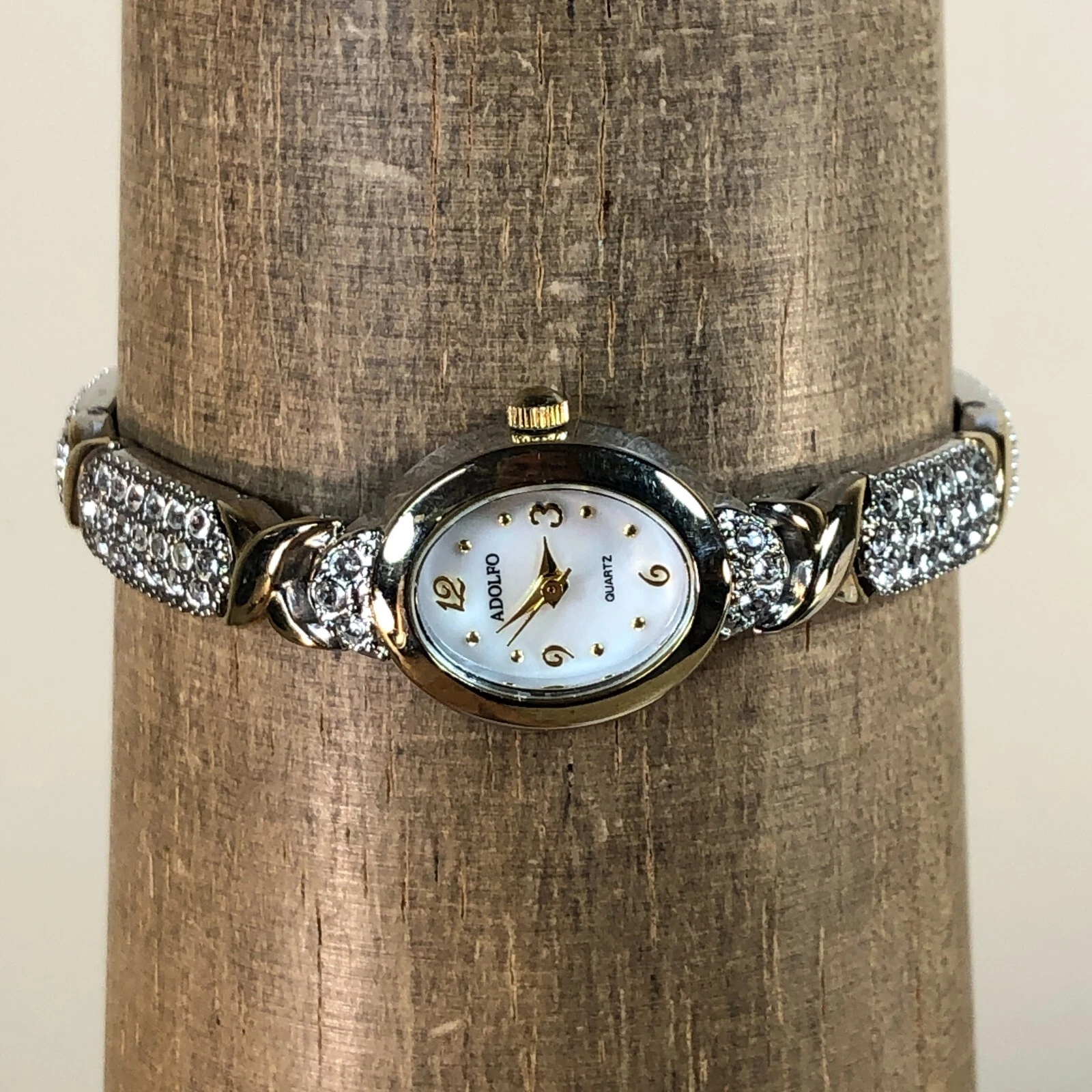 Adolfo Women White Mother of Pearl Dial 18mm Oval Pave Quartz Analog Watch 7"