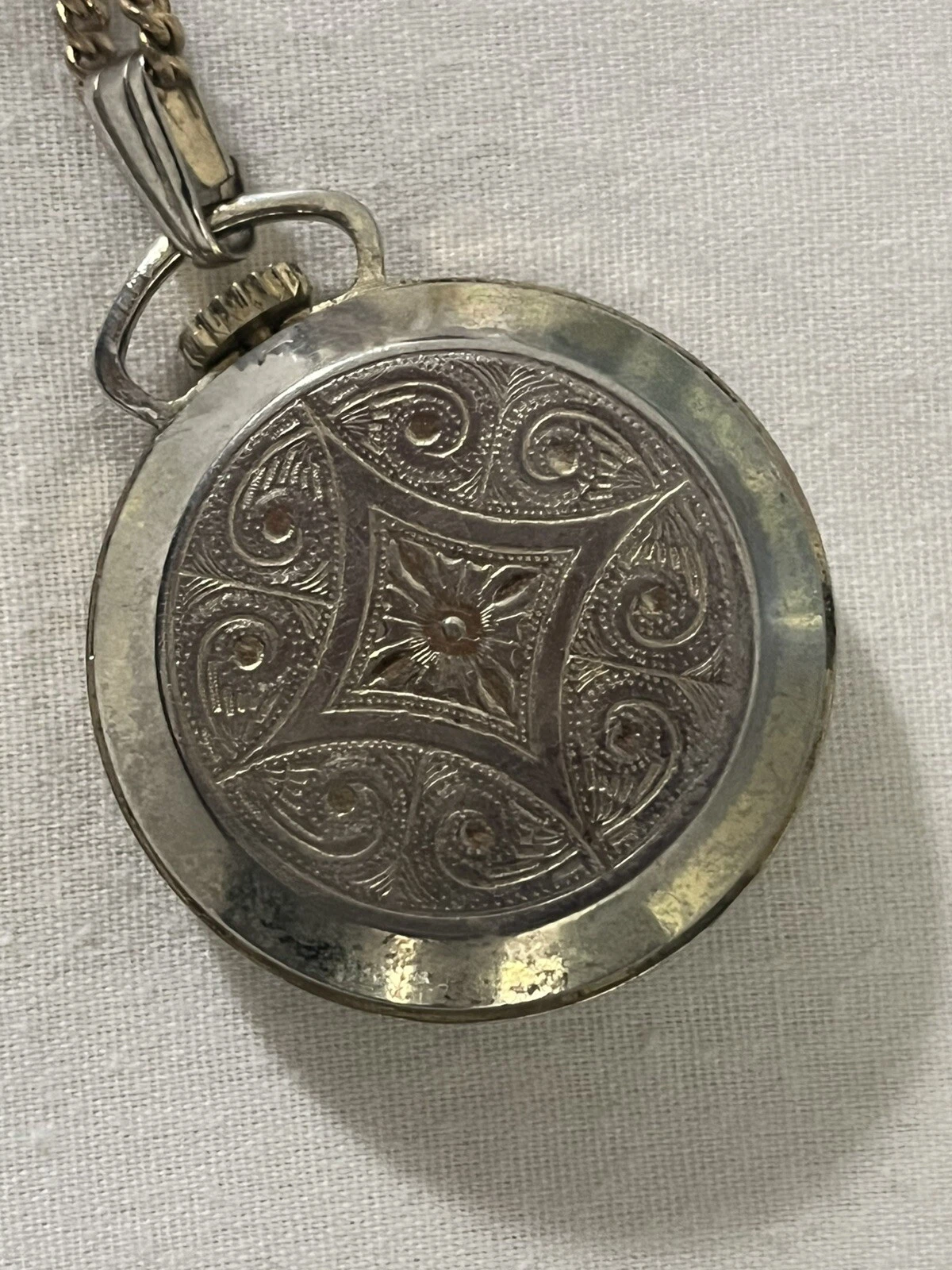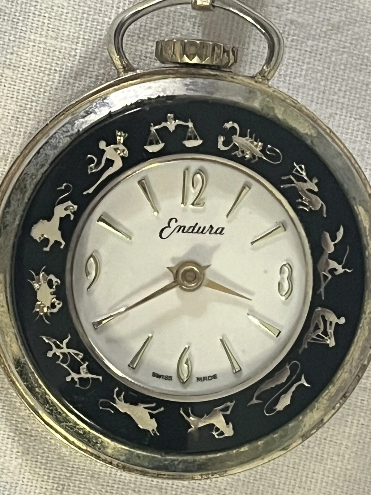Vintage Swiss Made Endura Gold Tone Black Enamel Zodiac Pocket Watch And Chain
