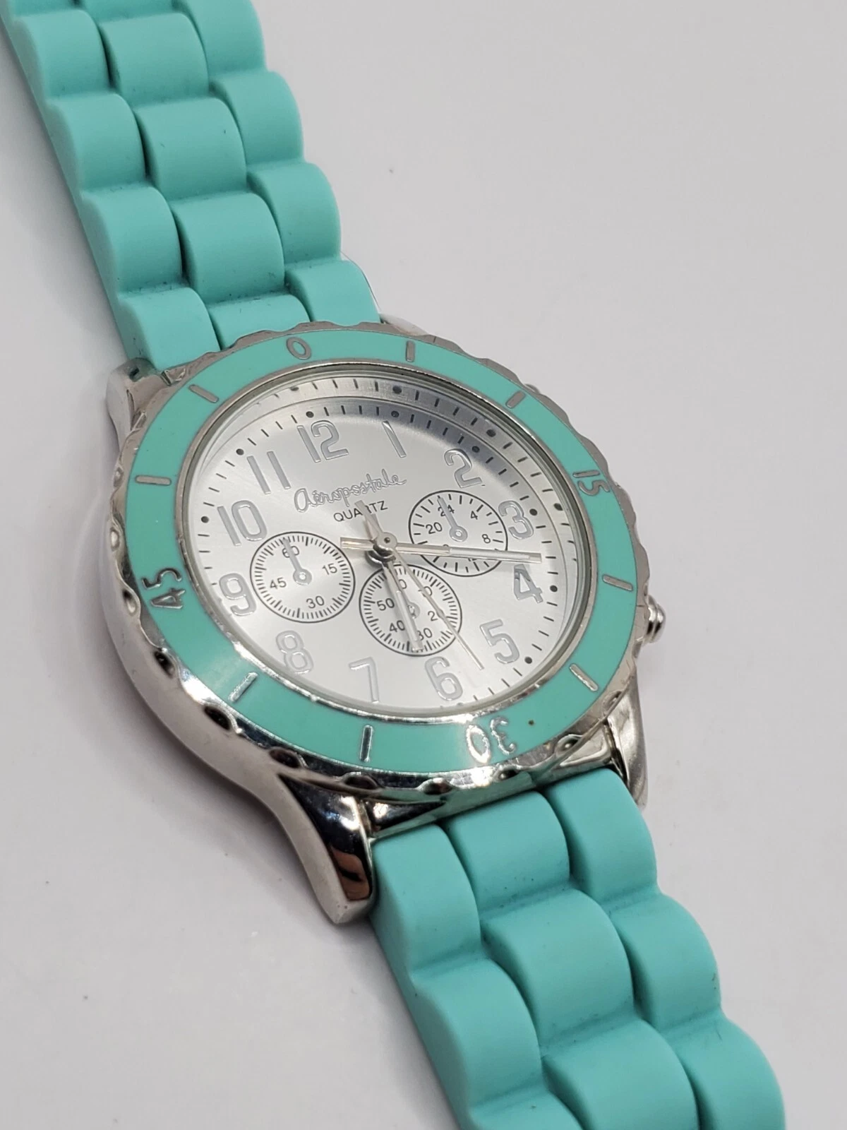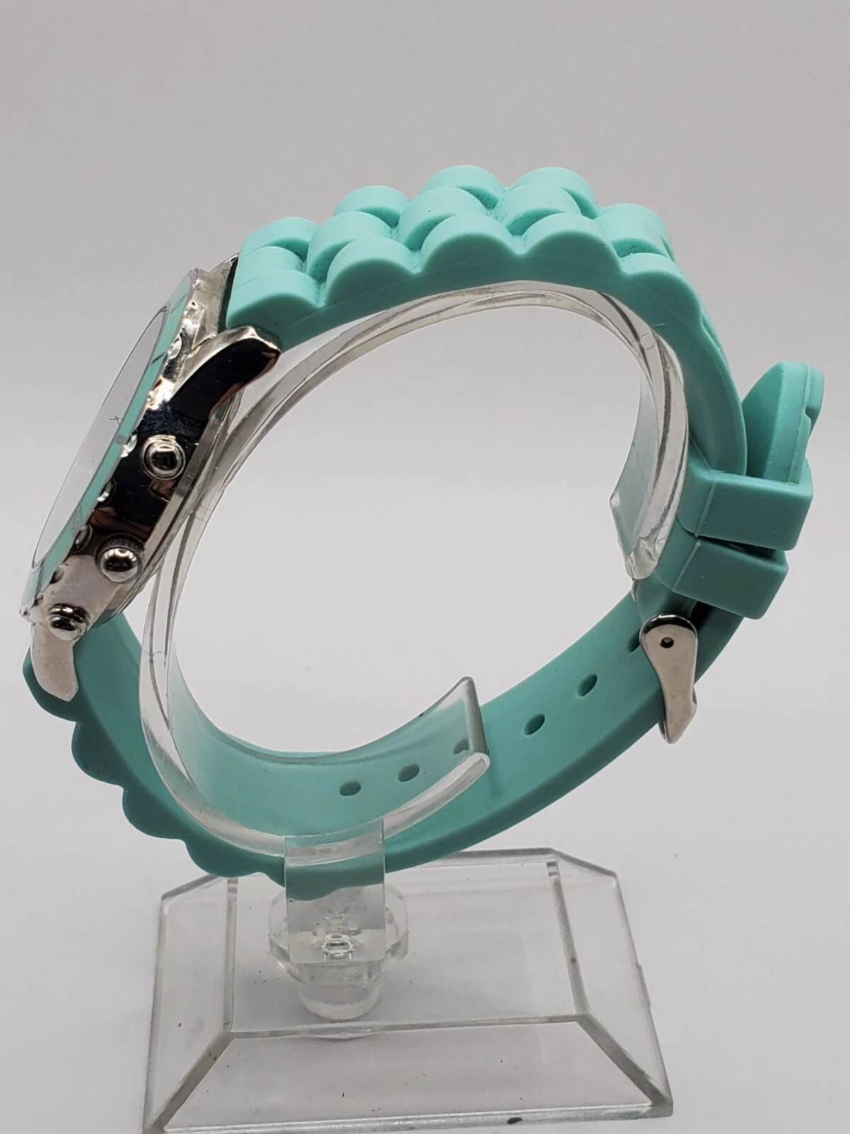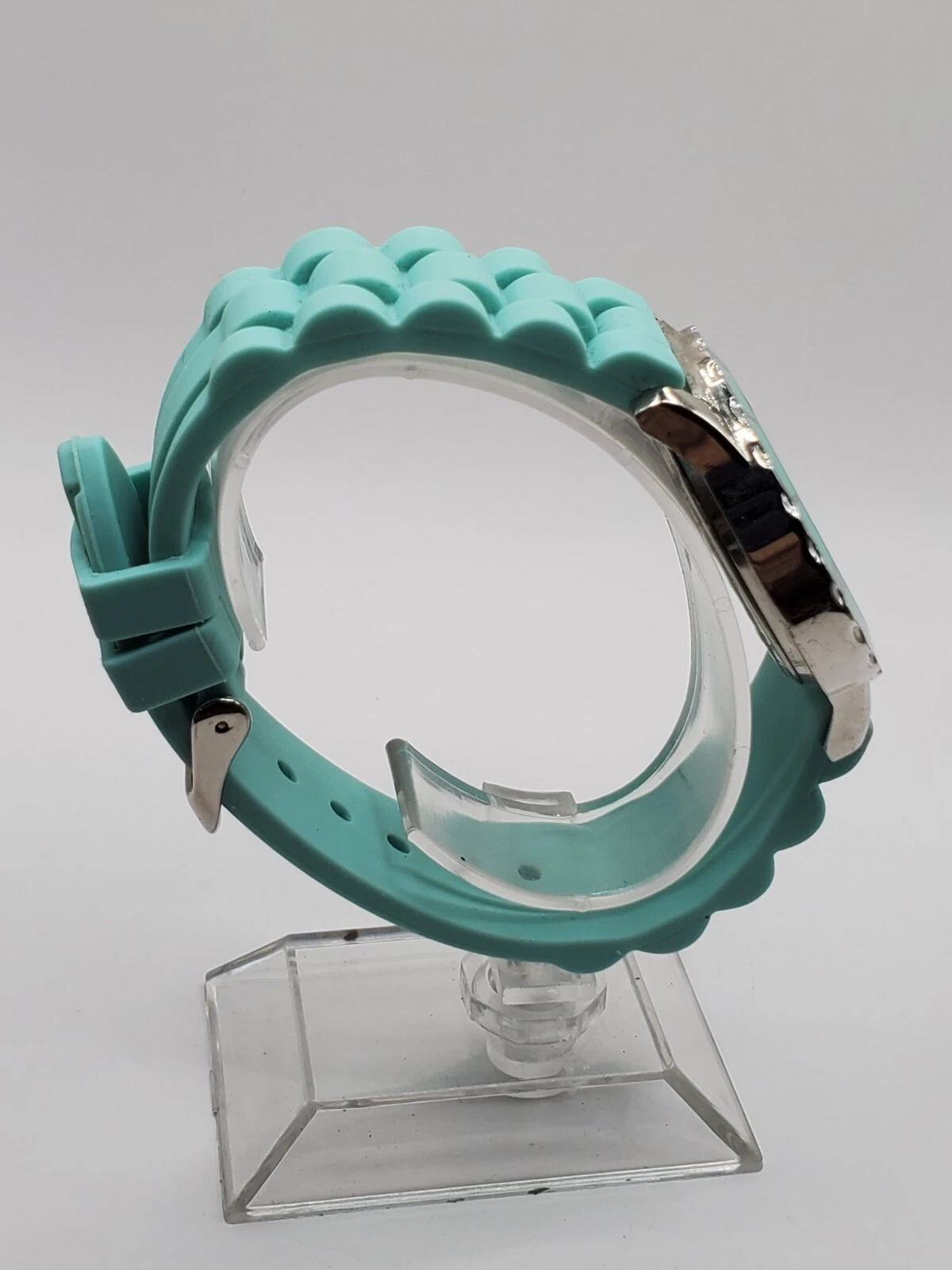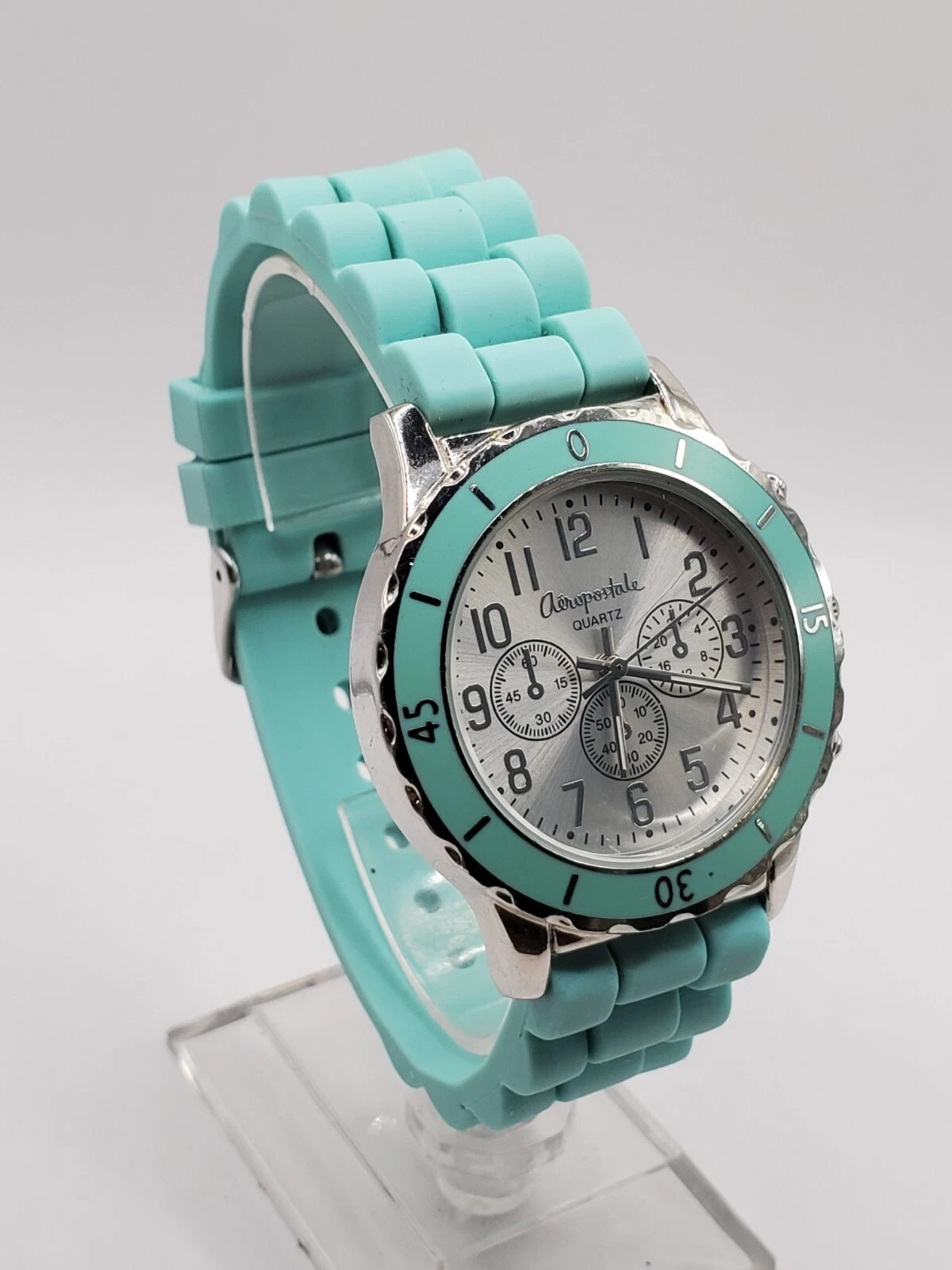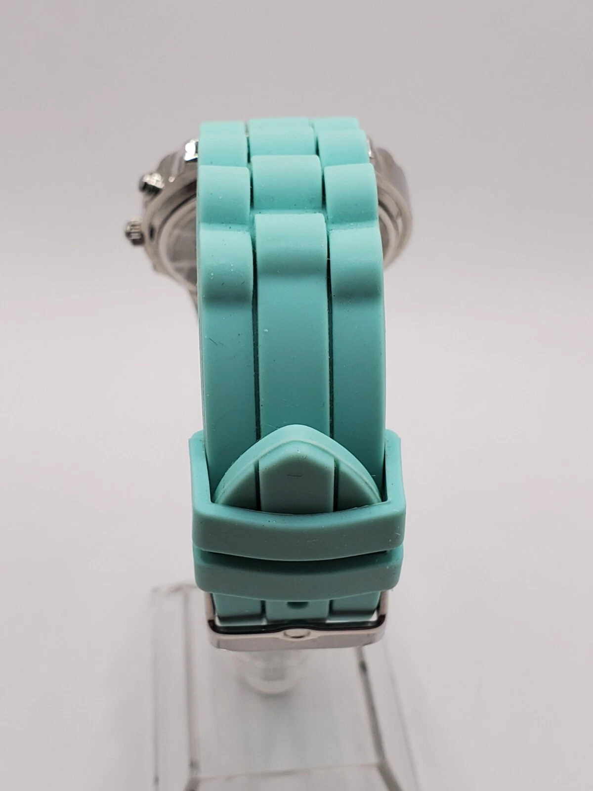 Aeropostale Ladies Quartz Watch 36mm Round Silver Tone Turquoise Silicone Band
