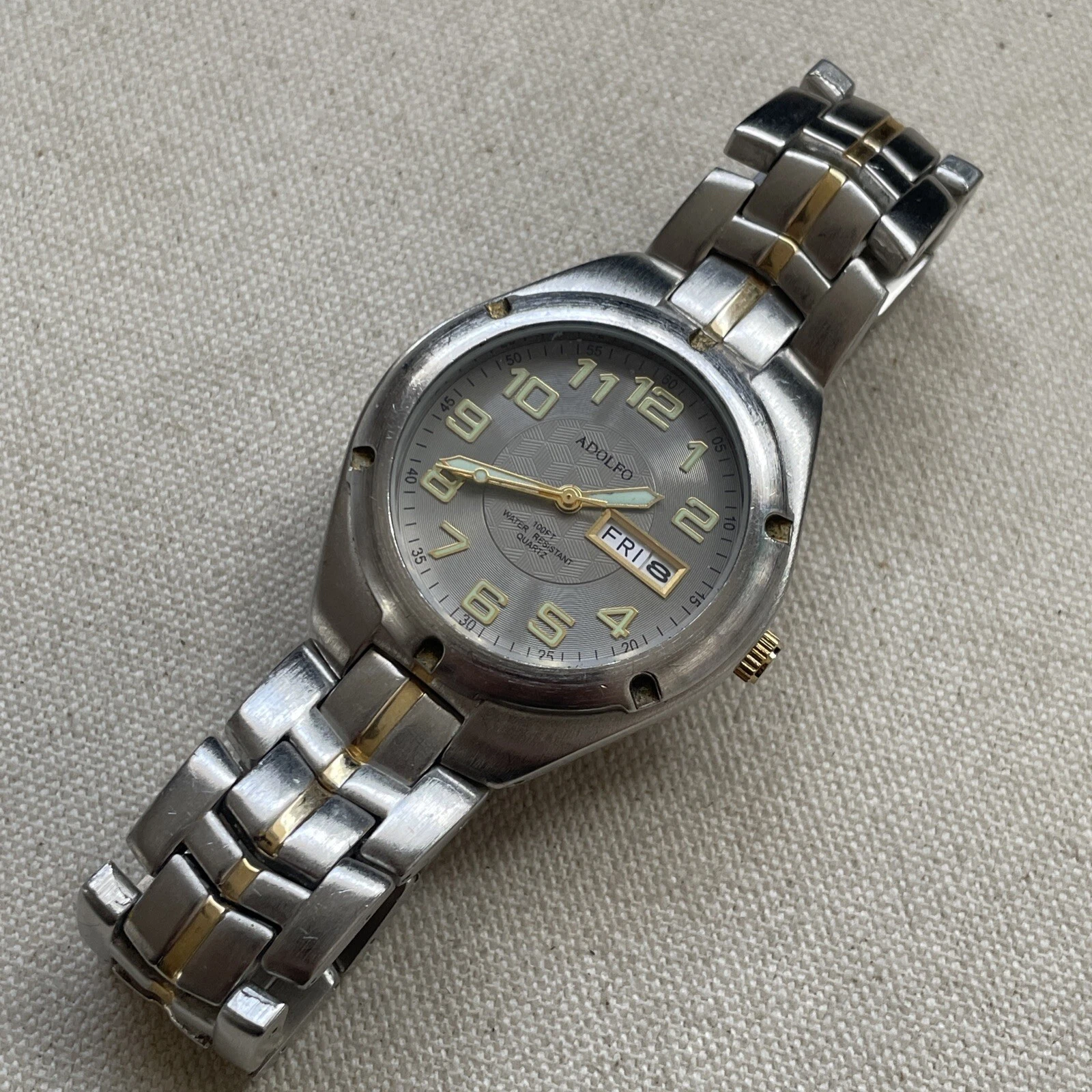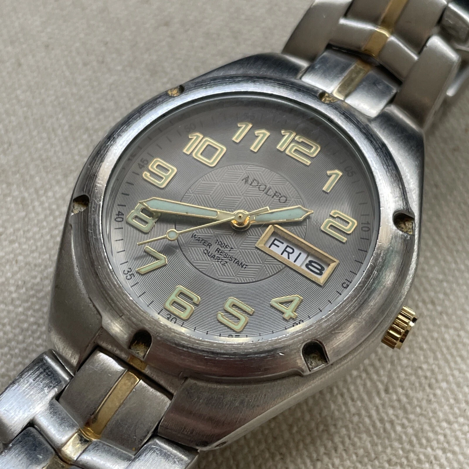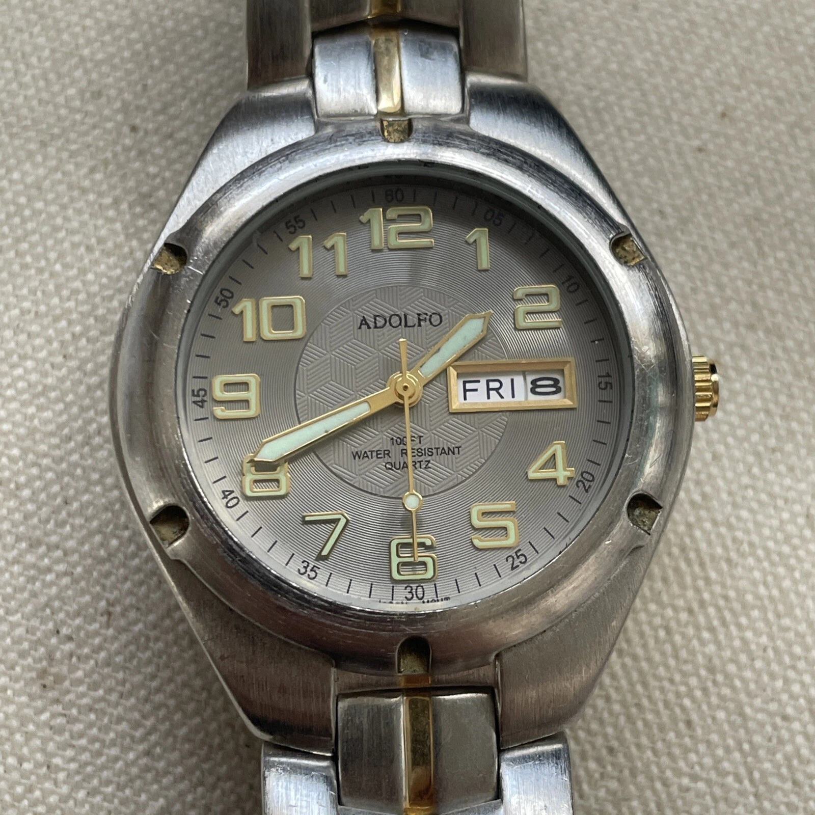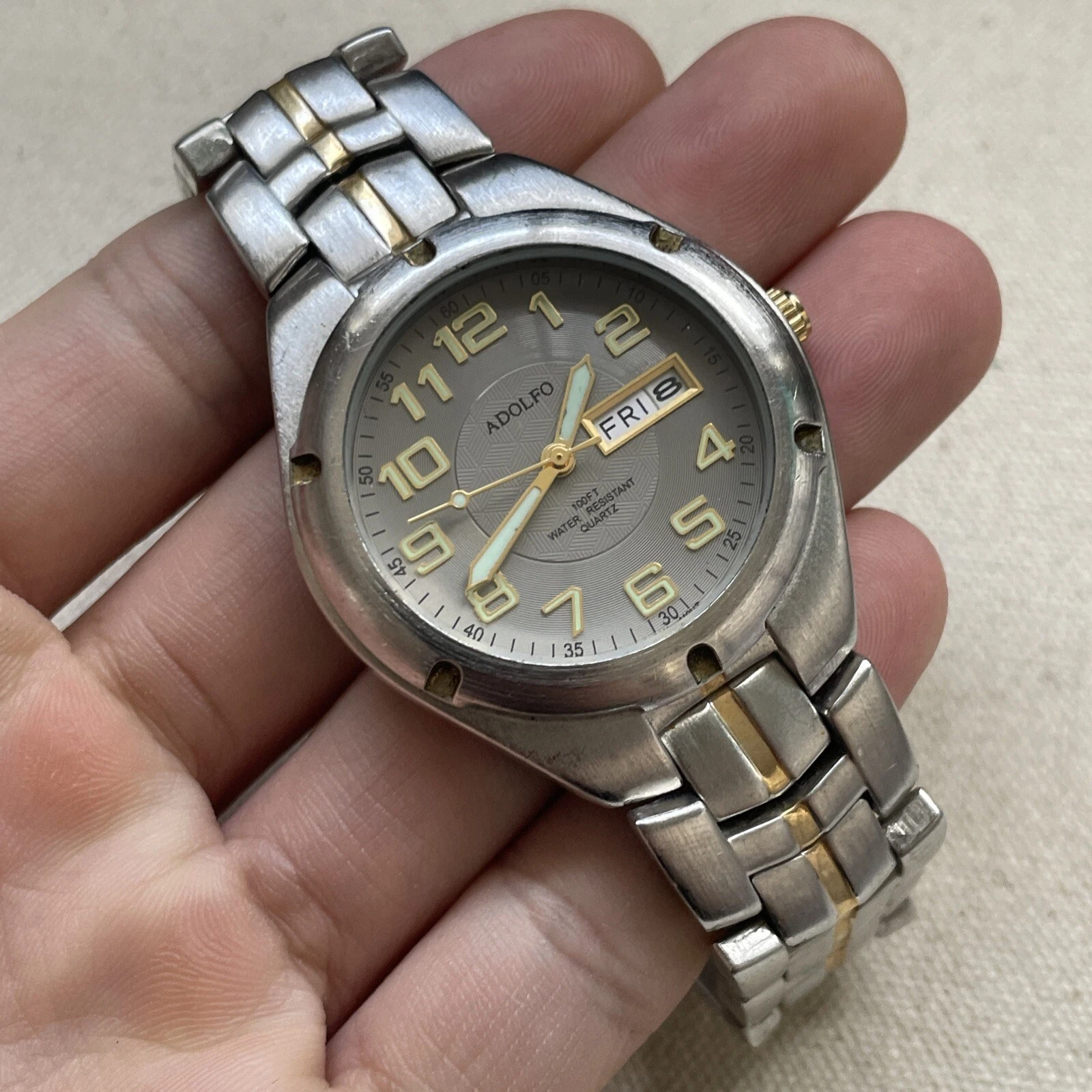 Adolfo Mens Stainless Steel Day Date Analog Watch Silver Dial 38mm New Battery