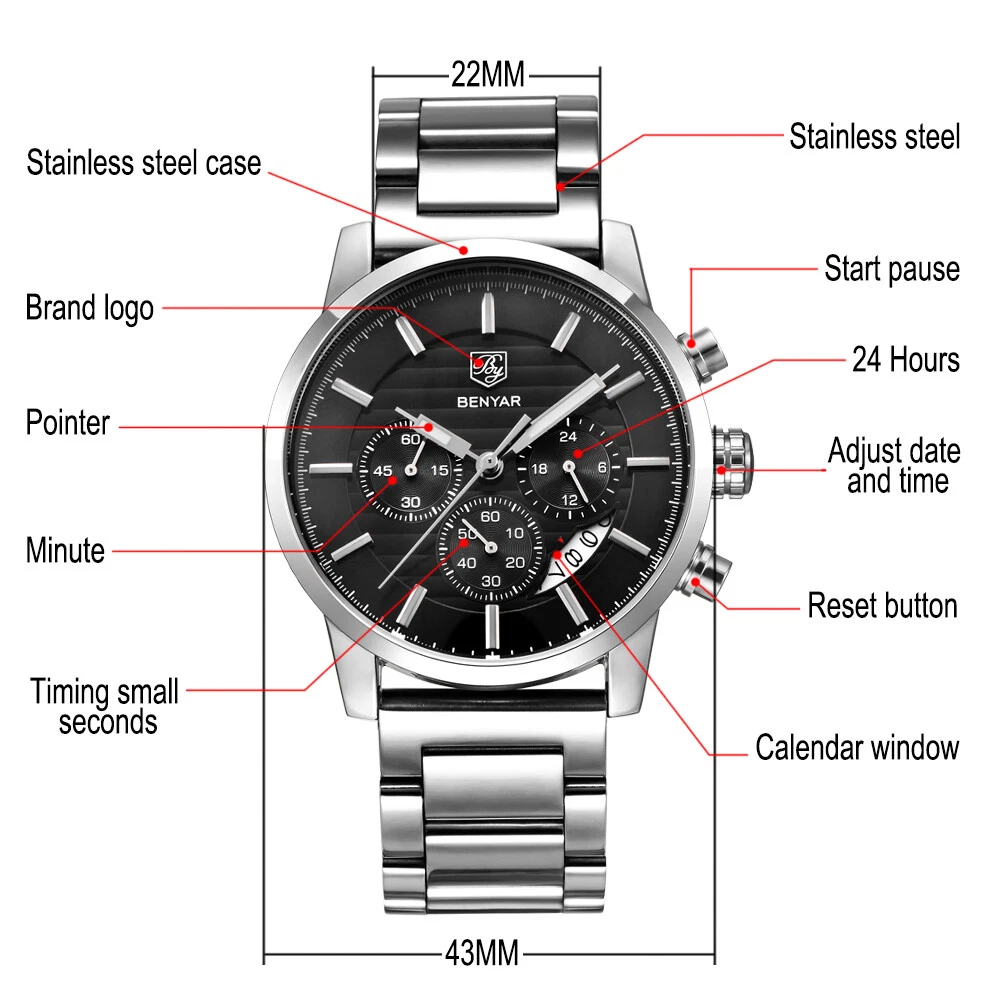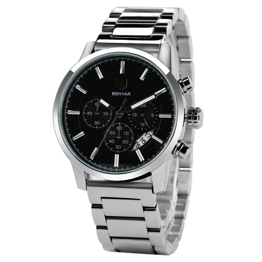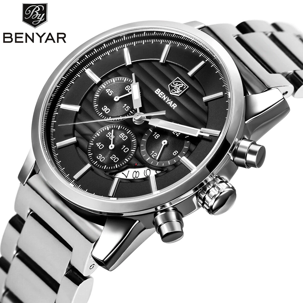 BENYAR Stainless Steel Watch Men Business Quartz Watch Military Sport Wristwatch