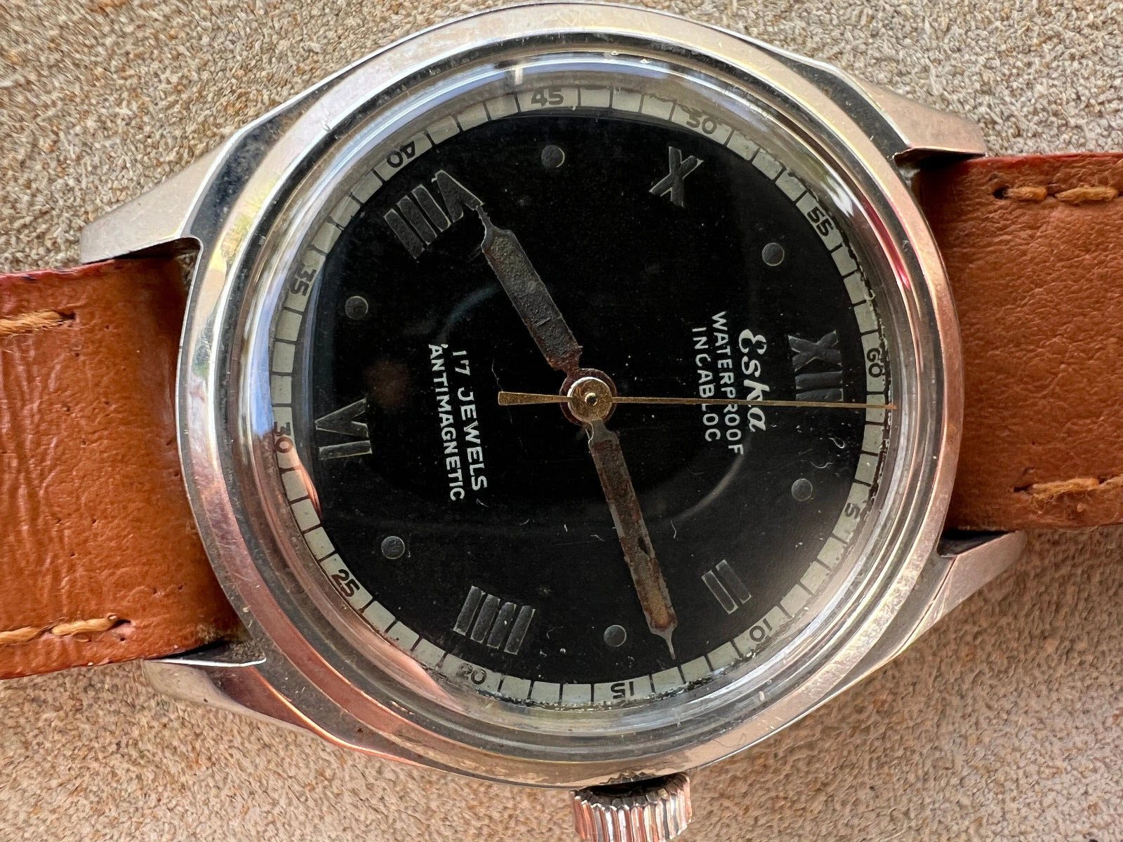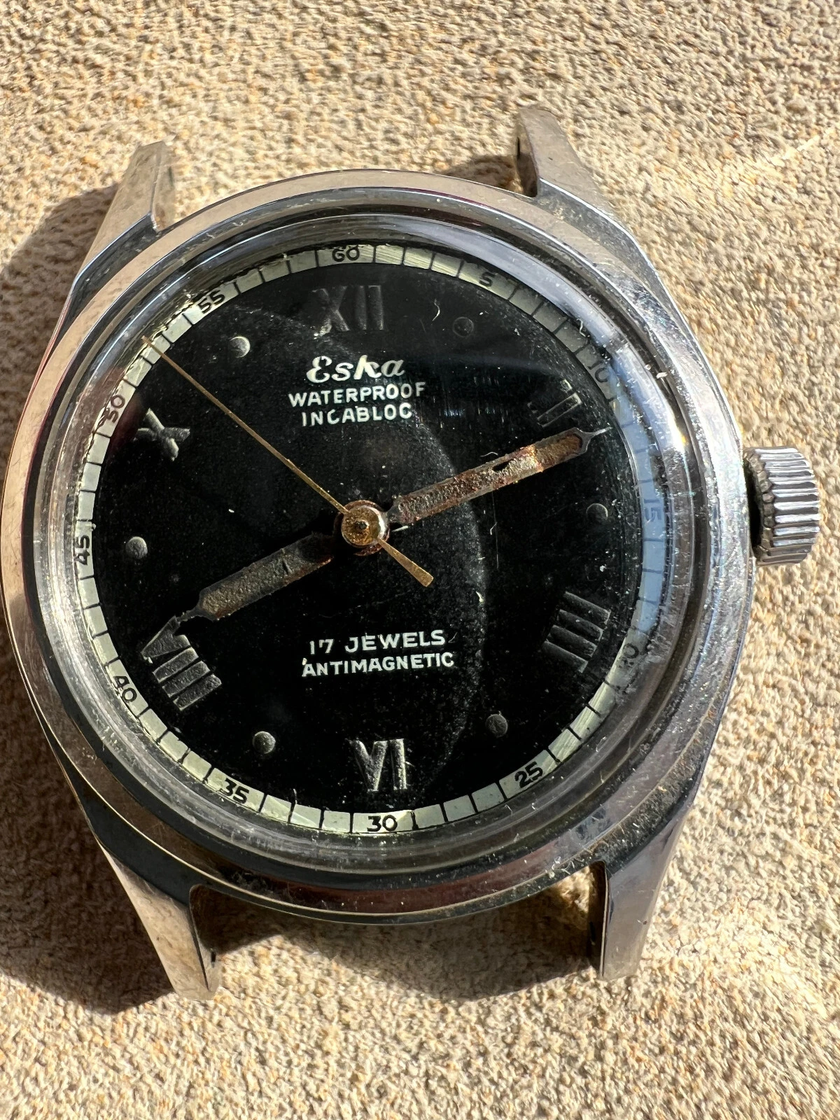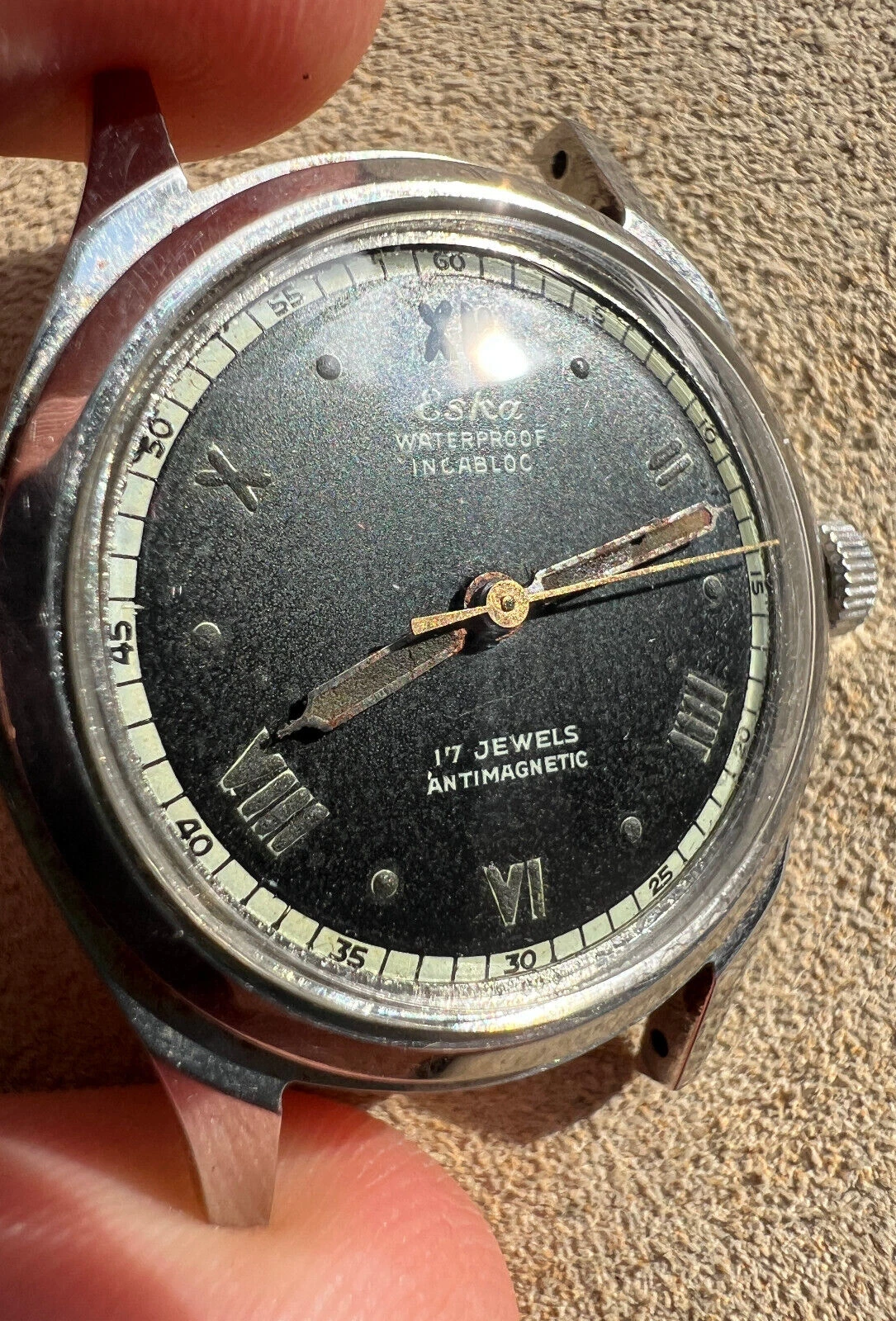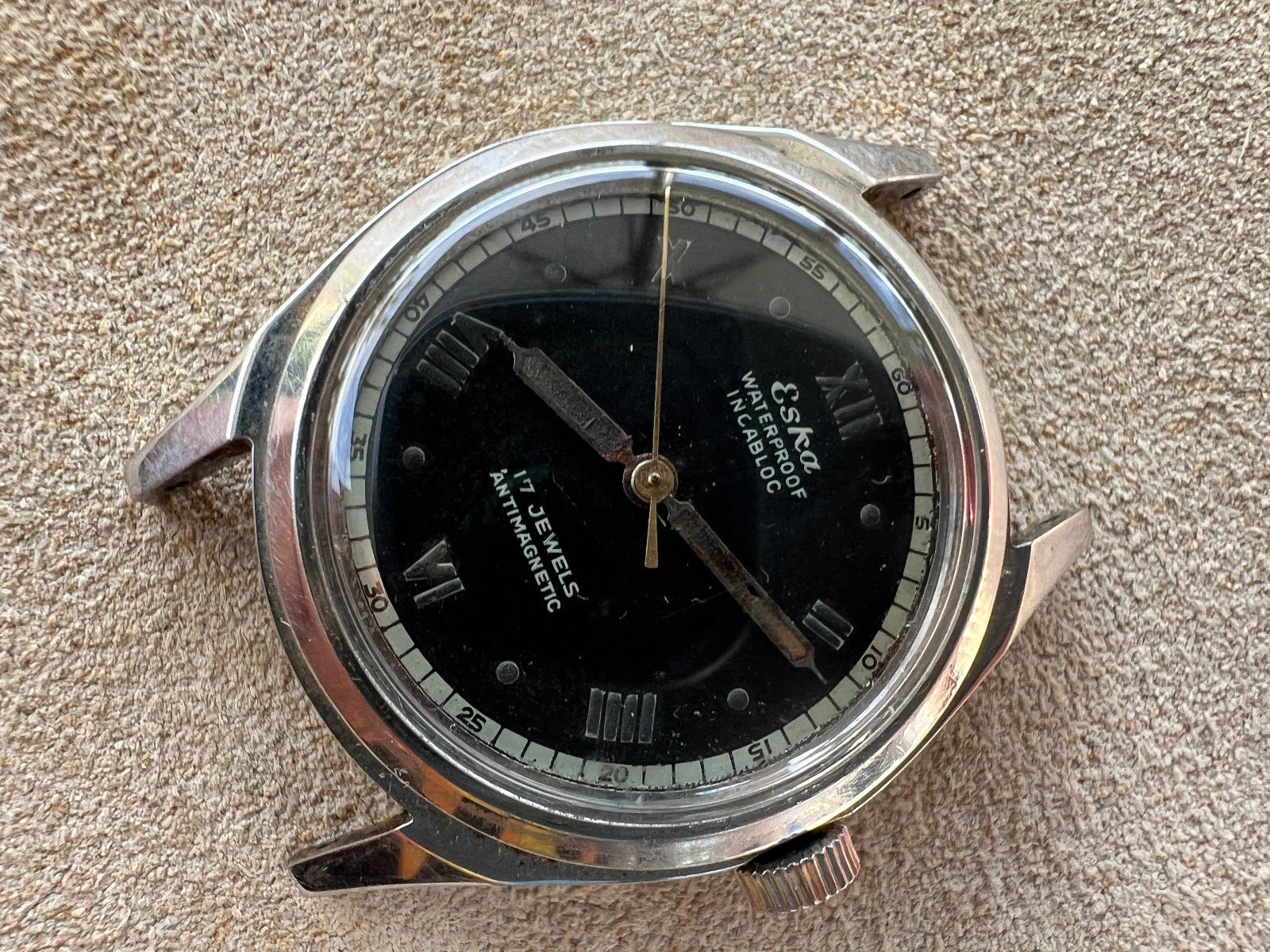 Vintage Eska military all steel ww2 era wristwatch gilt two tone black dial work