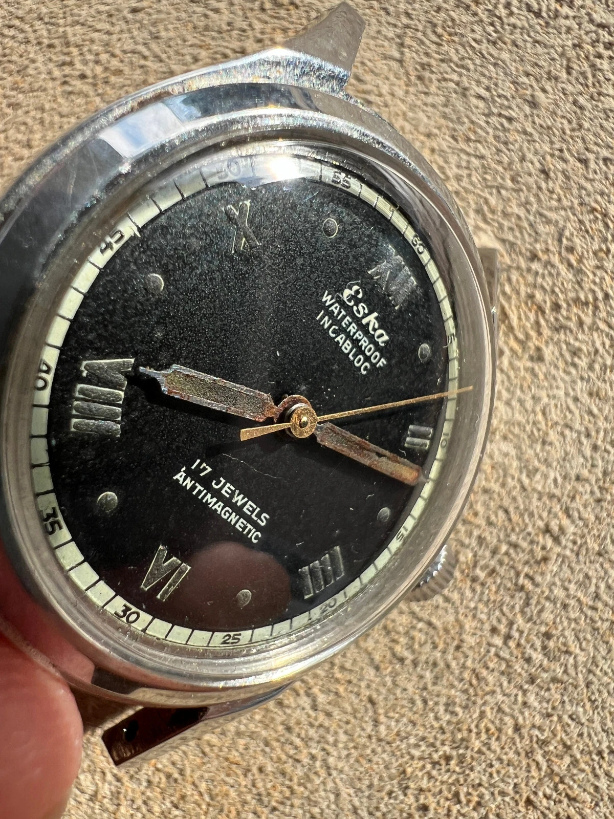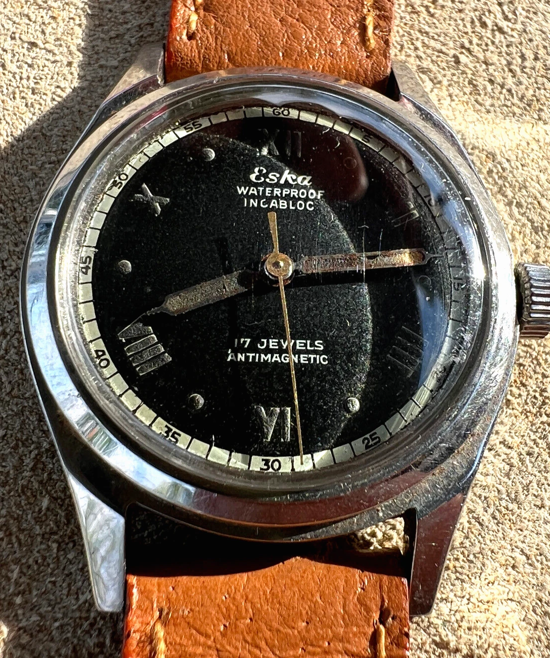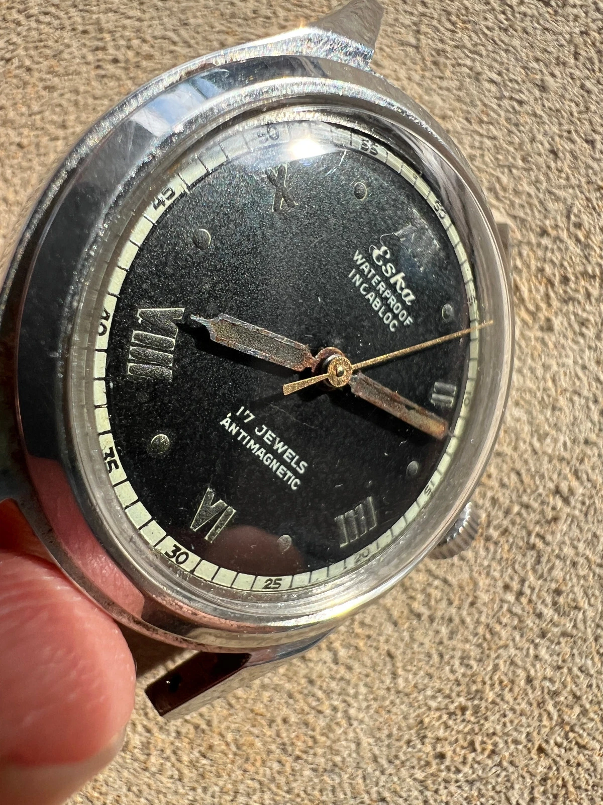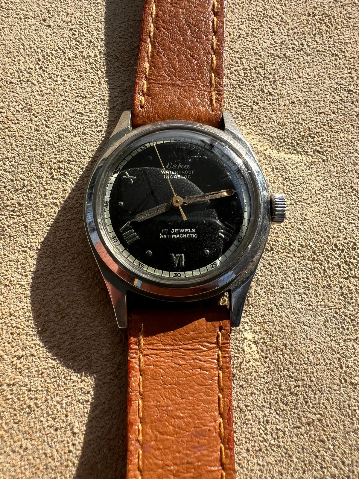 Vintage Eska military all steel ww2 era wristwatch gilt two tone black dial work