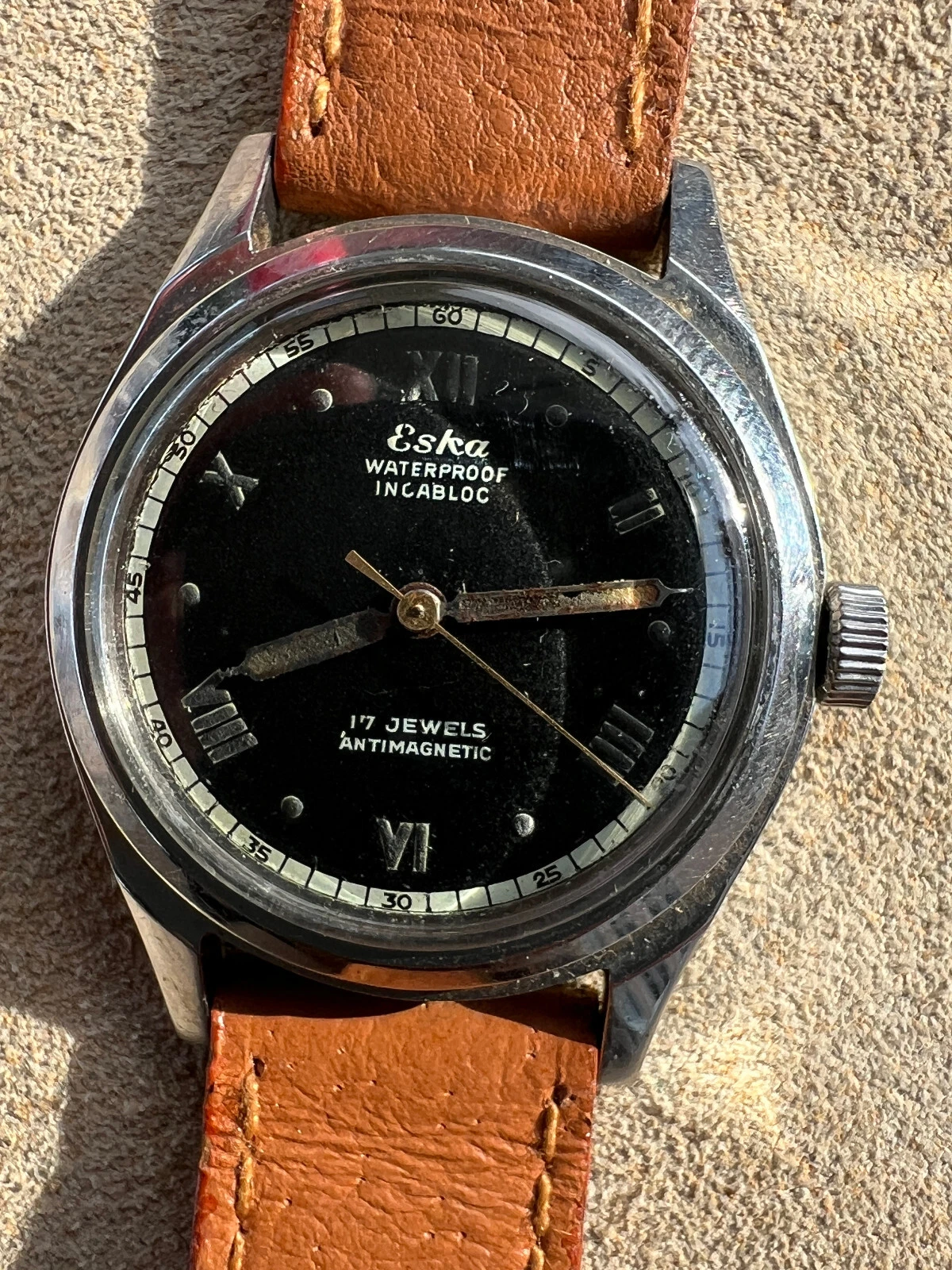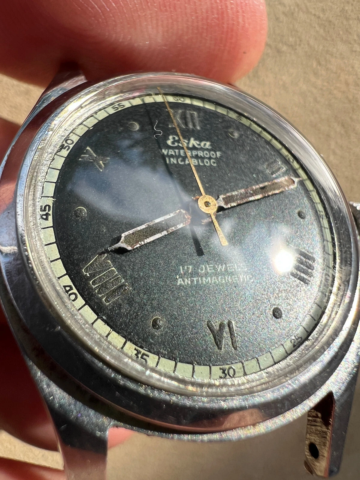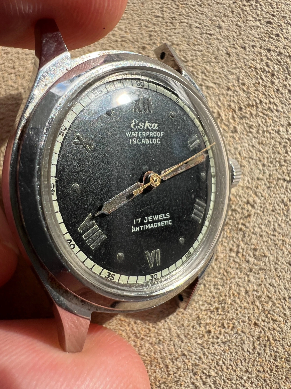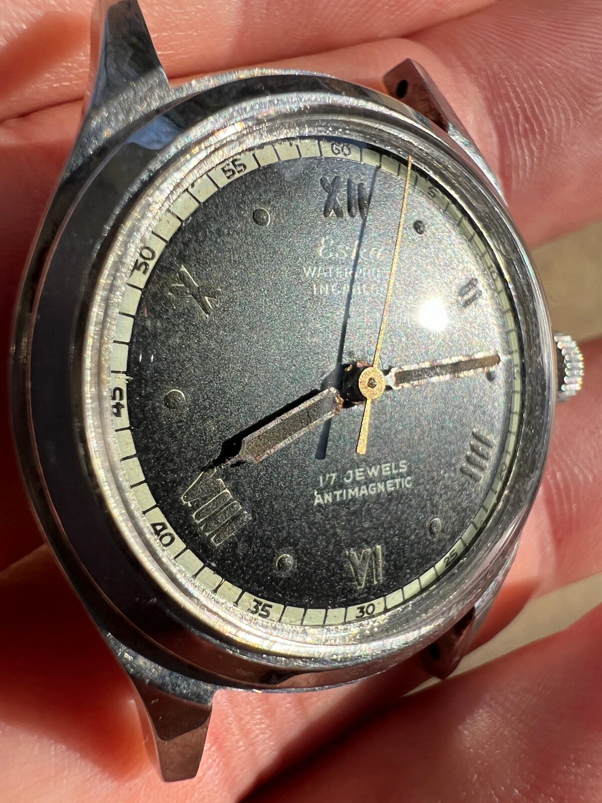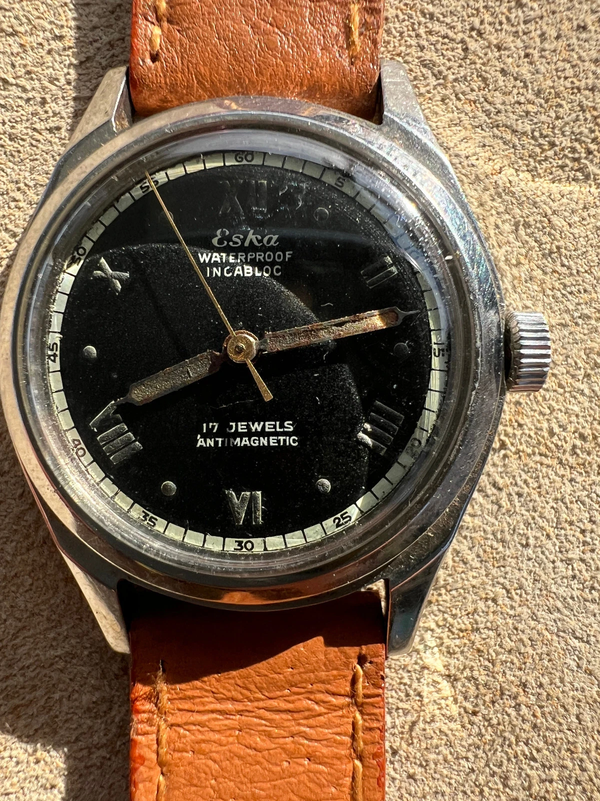 Vintage Eska military all steel ww2 era wristwatch gilt two tone black dial work
