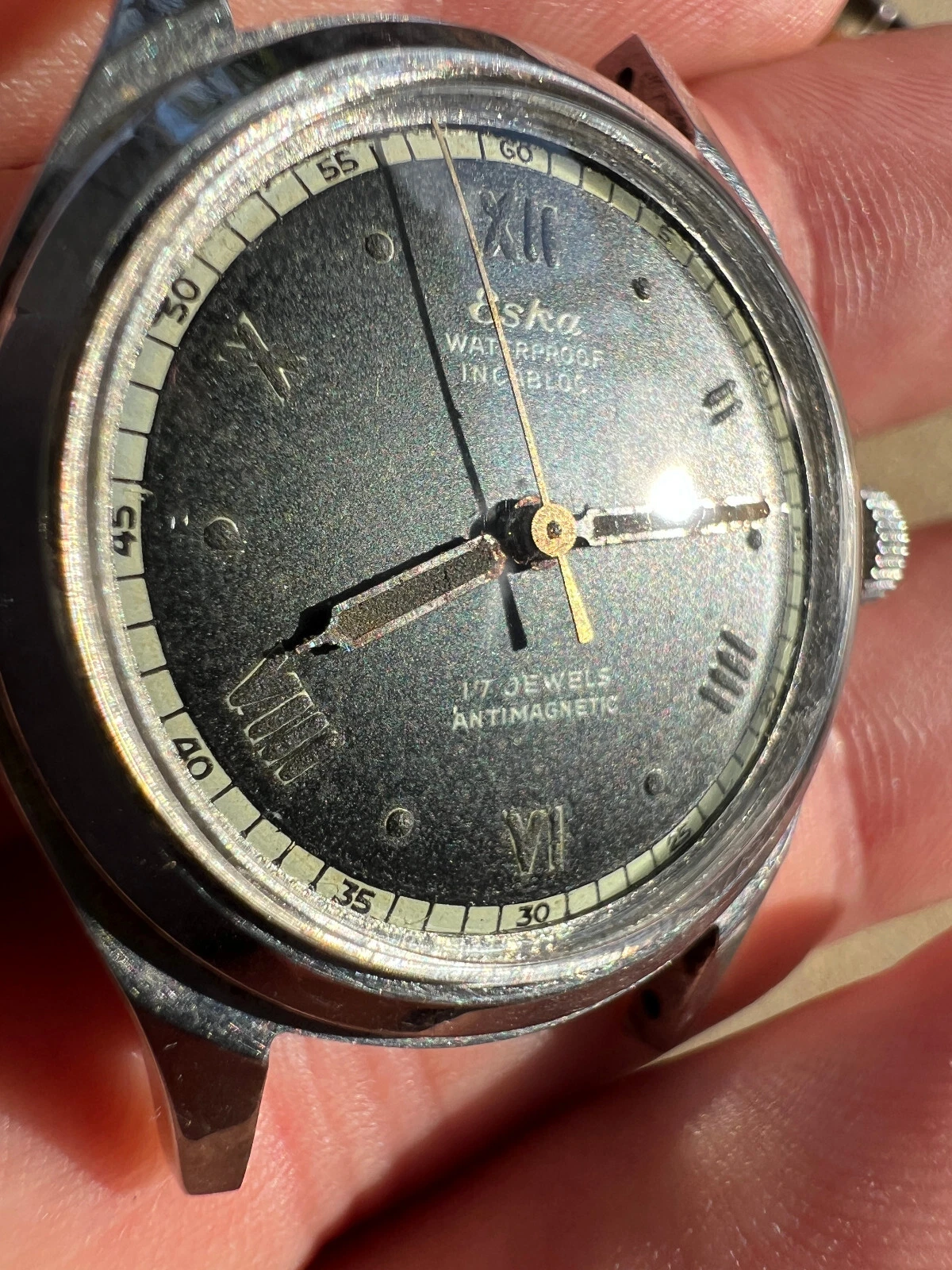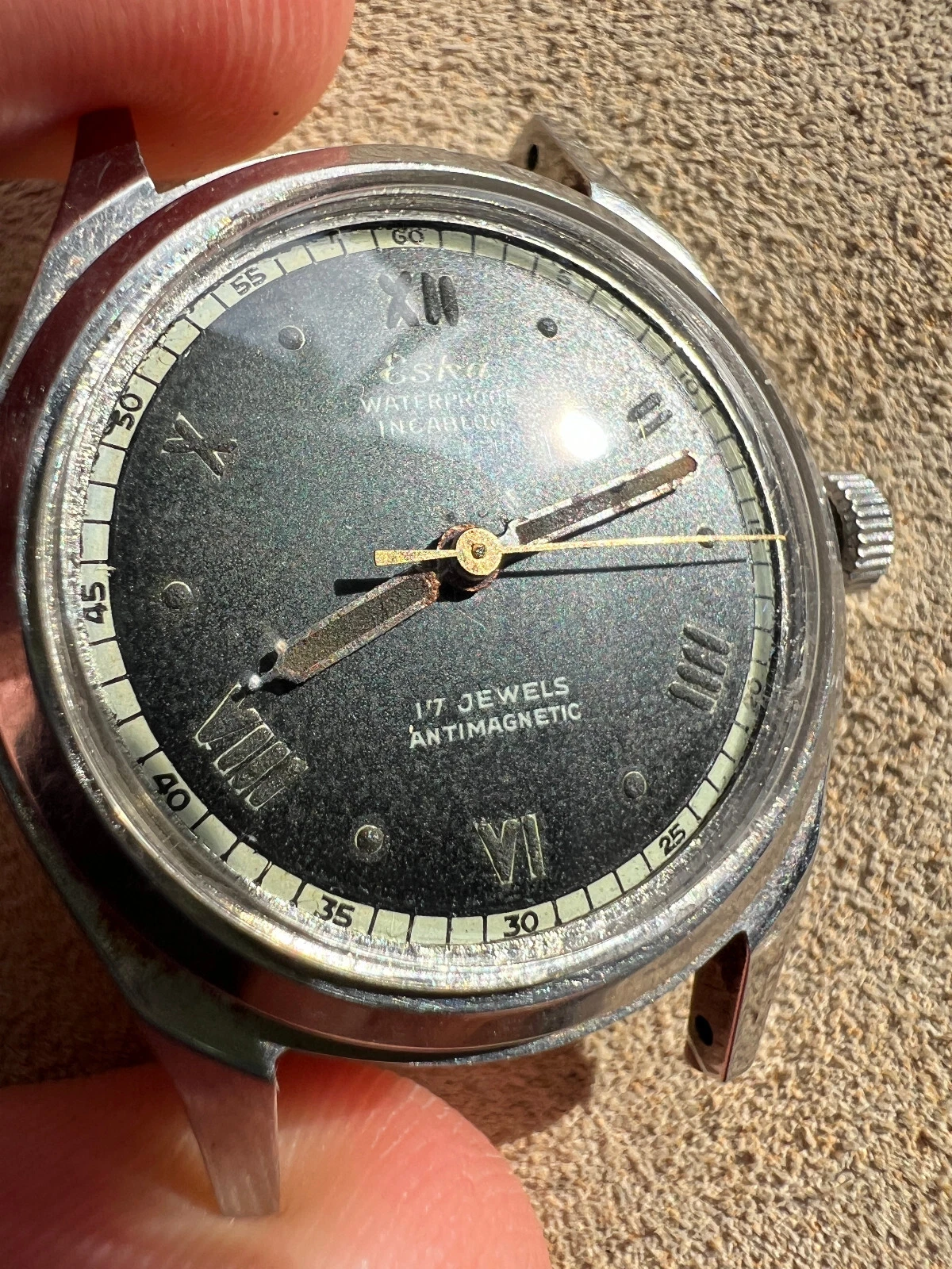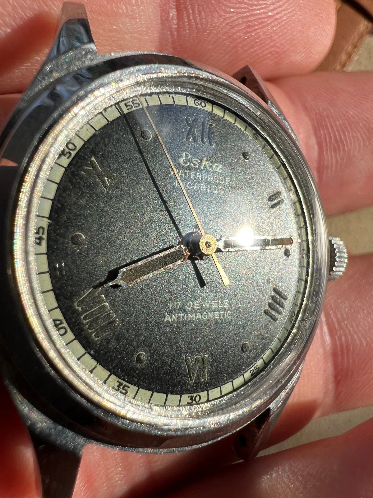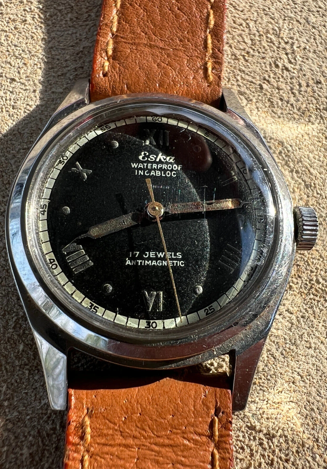 Vintage Eska military all steel ww2 era wristwatch gilt two tone black dial work